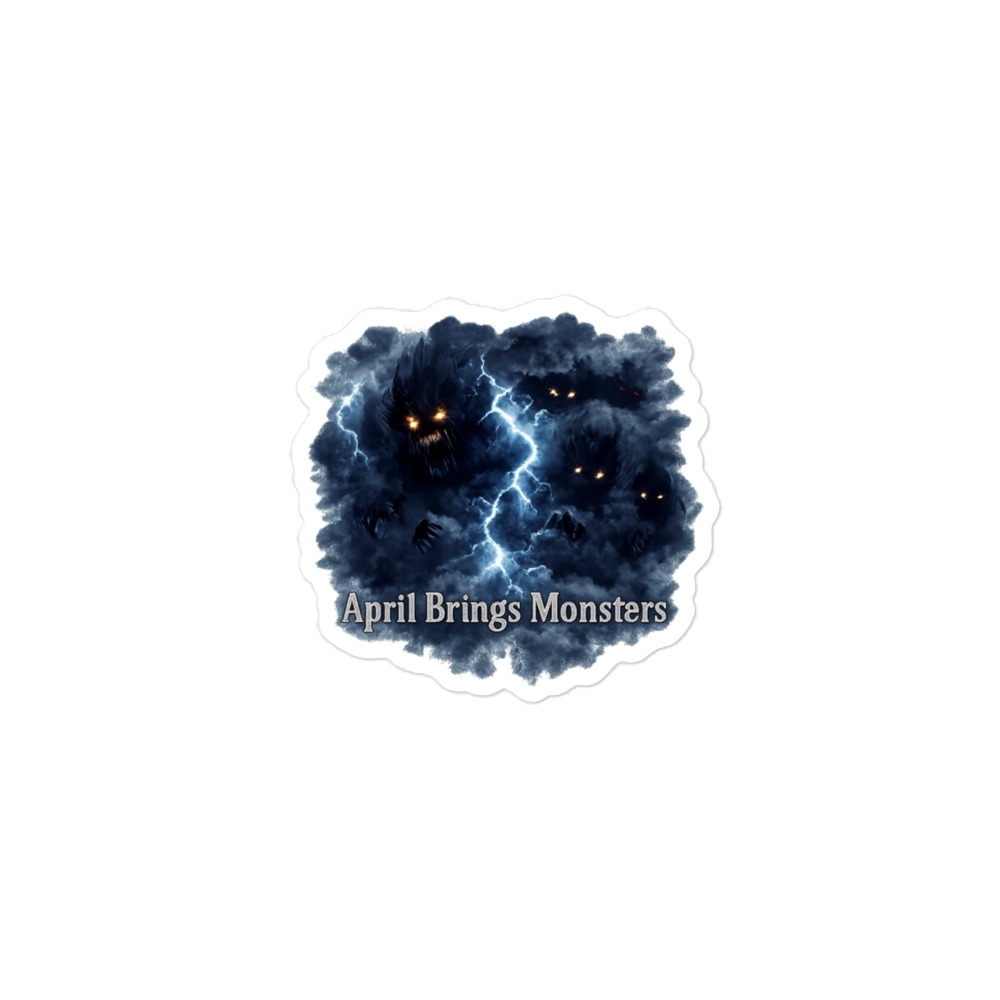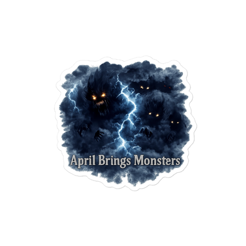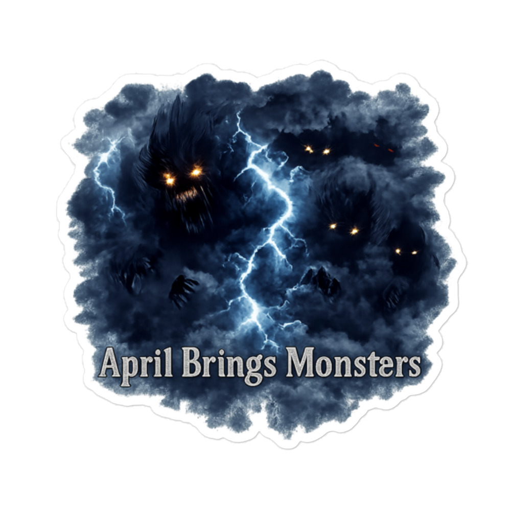 April Brings Monsters – Multiple glowing-eyed shadow creatures lurk within a stormy thundercloud split by lightning, winged and watching from the dark. Spring horror meets cosmic dread.