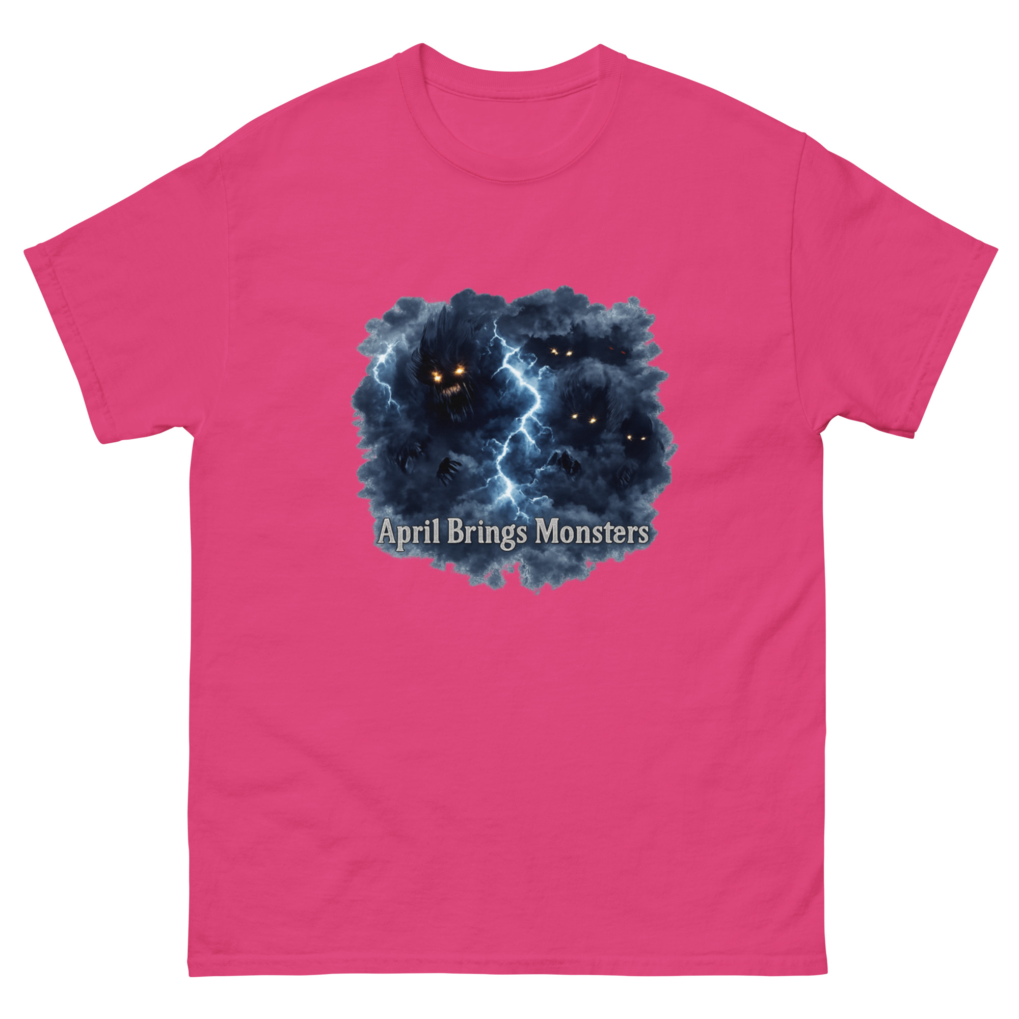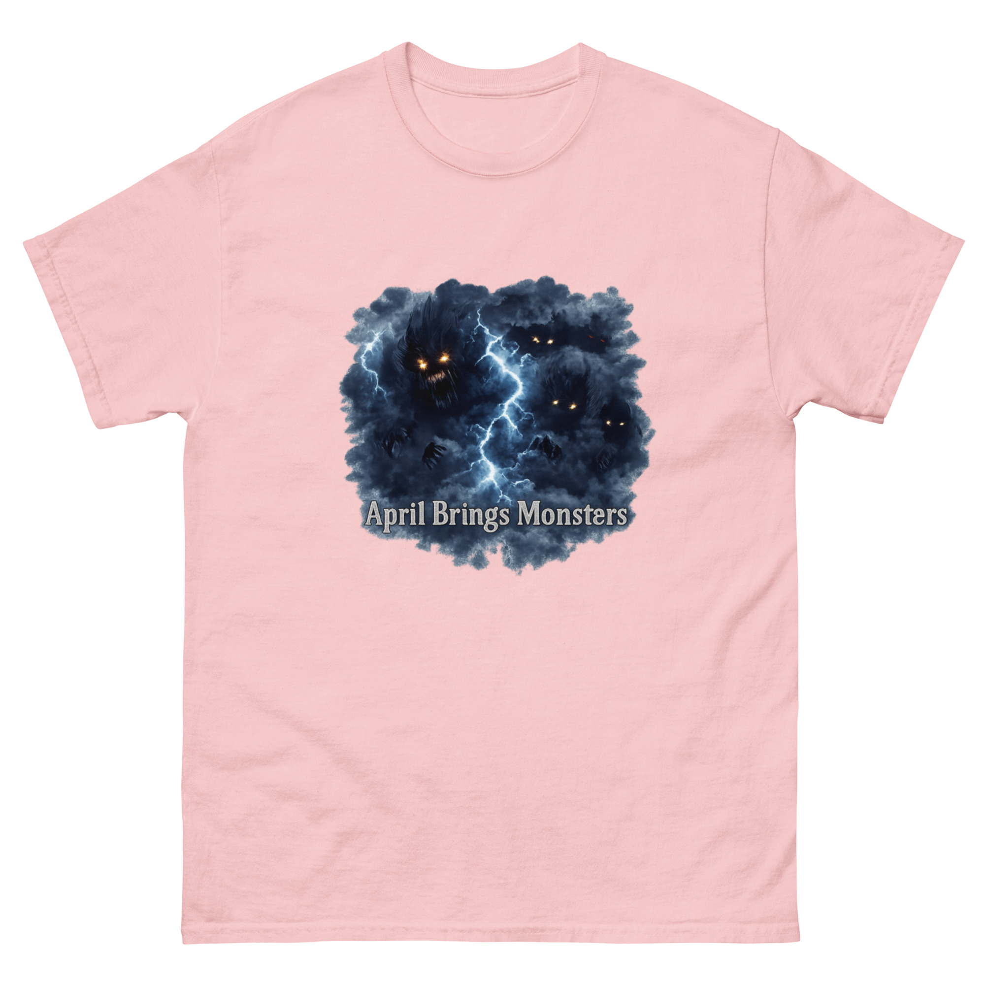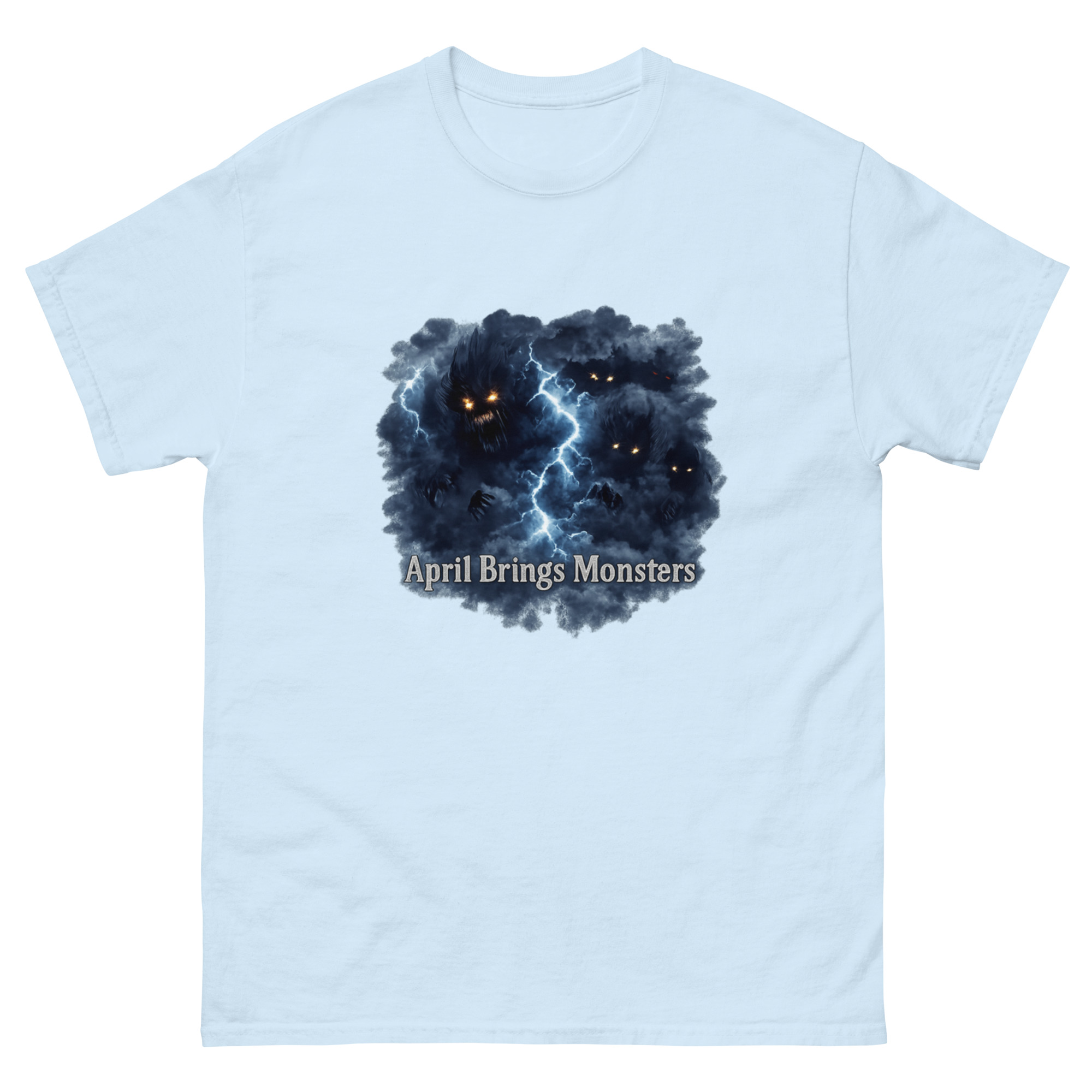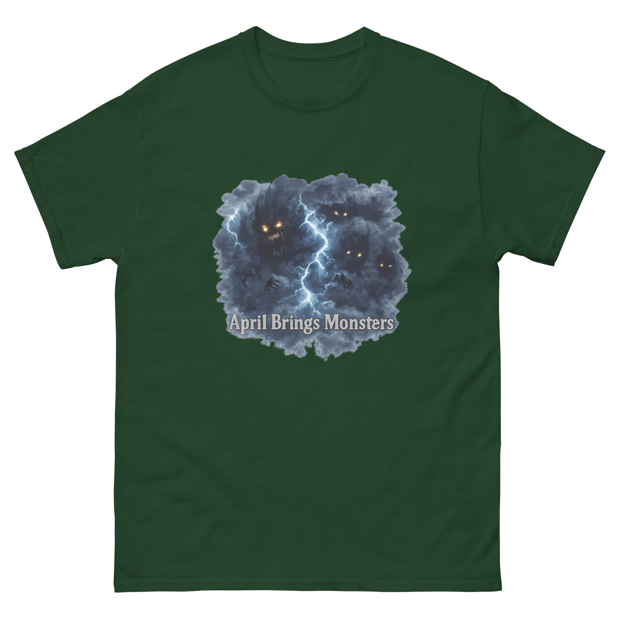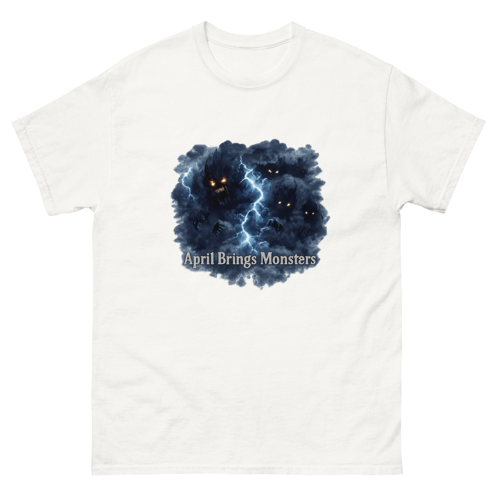 April Brings Monsters – Multiple glowing-eyed shadow creatures lurk within a stormy thundercloud split by lightning, winged and watching from the dark. Spring horror meets cosmic dread.