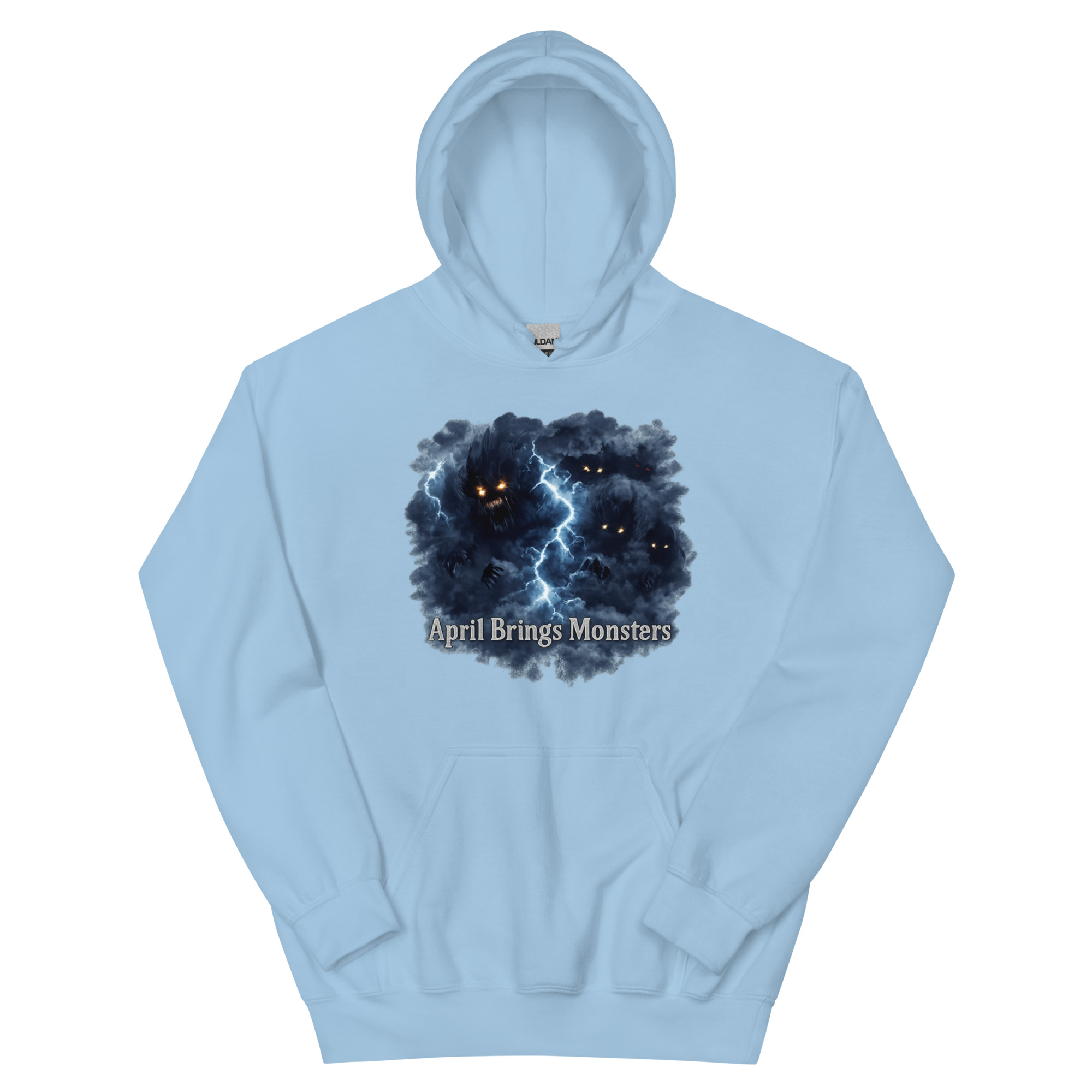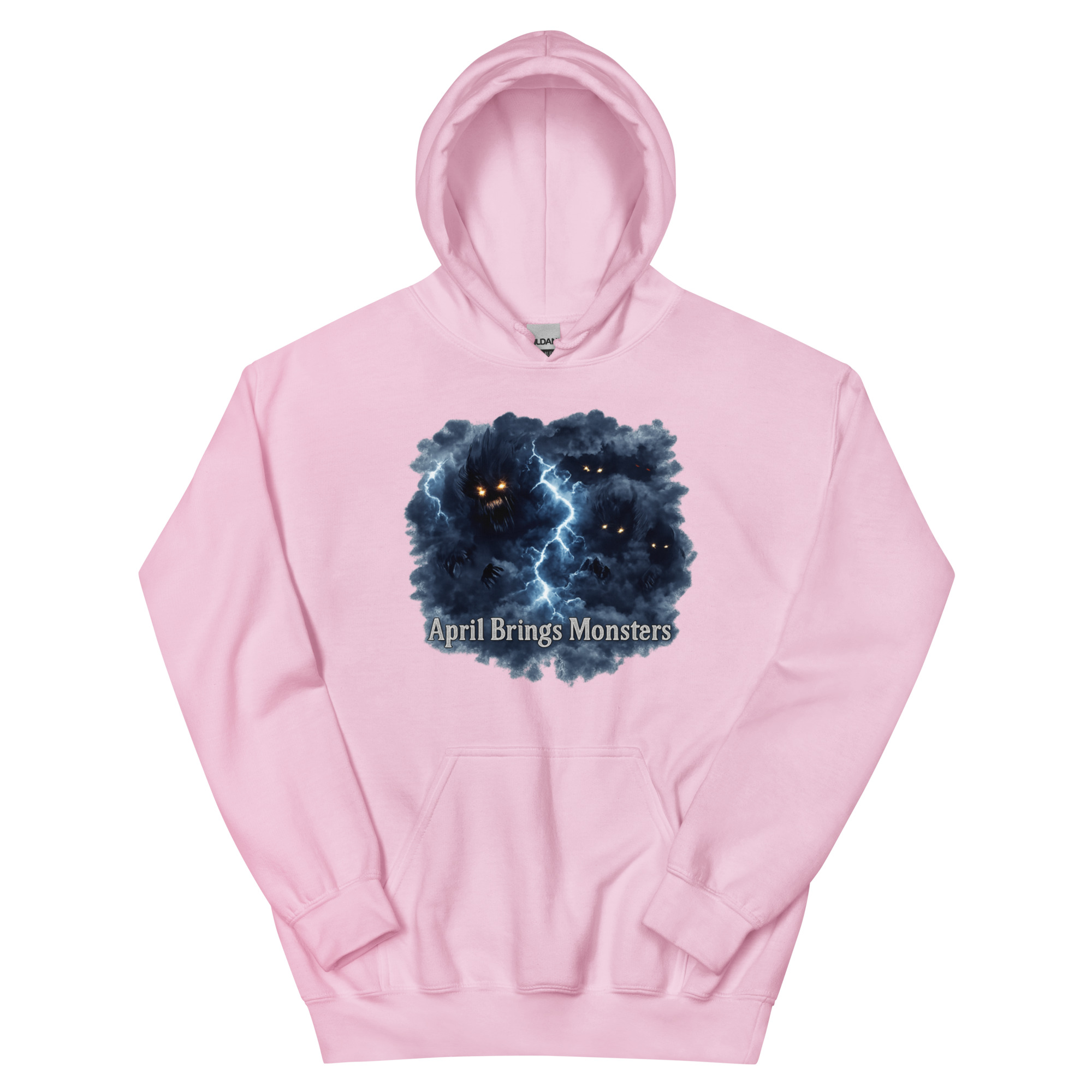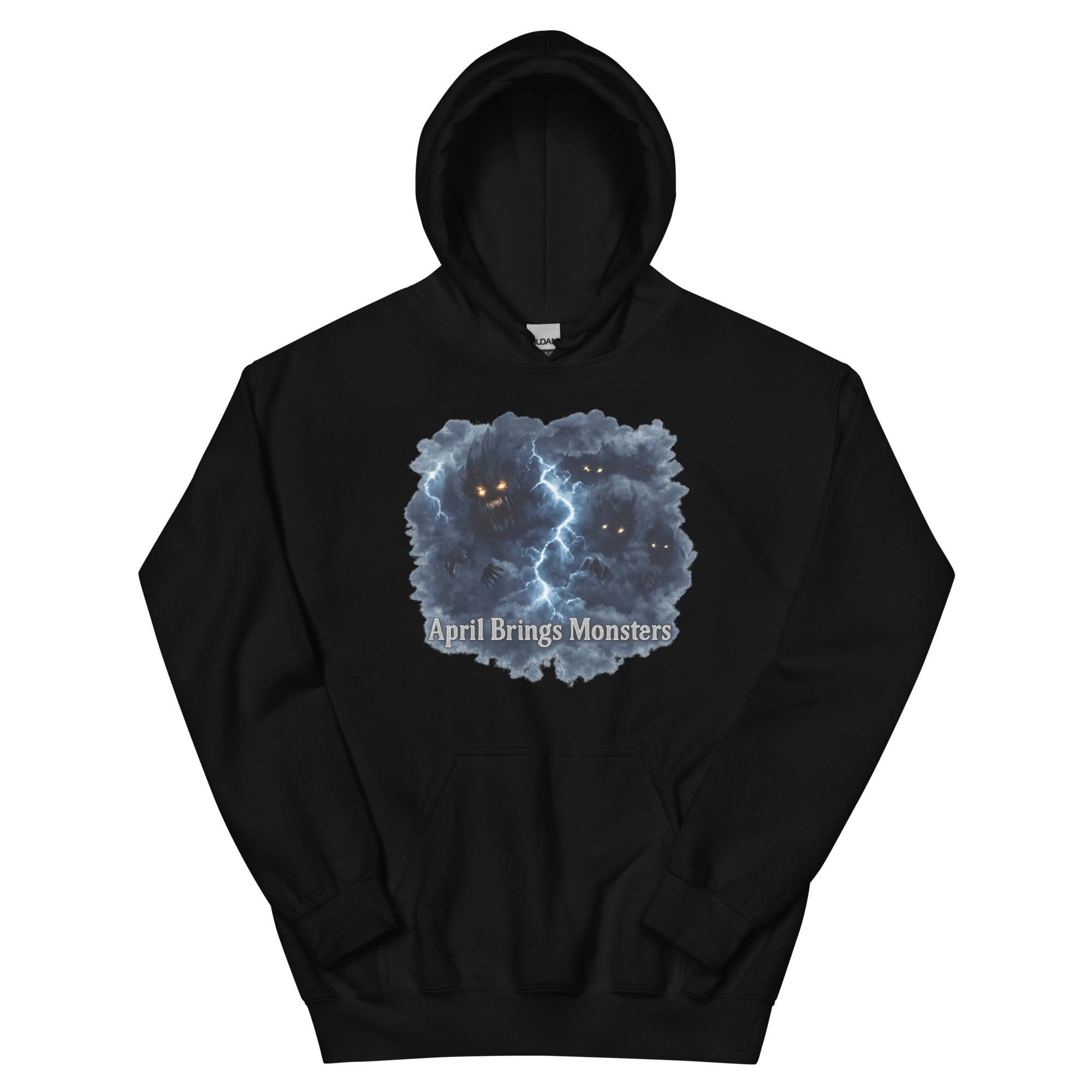 April Brings Monsters – Multiple glowing-eyed shadow creatures lurk within a stormy thundercloud split by lightning, winged and watching from the dark. Spring horror meets cosmic dread.