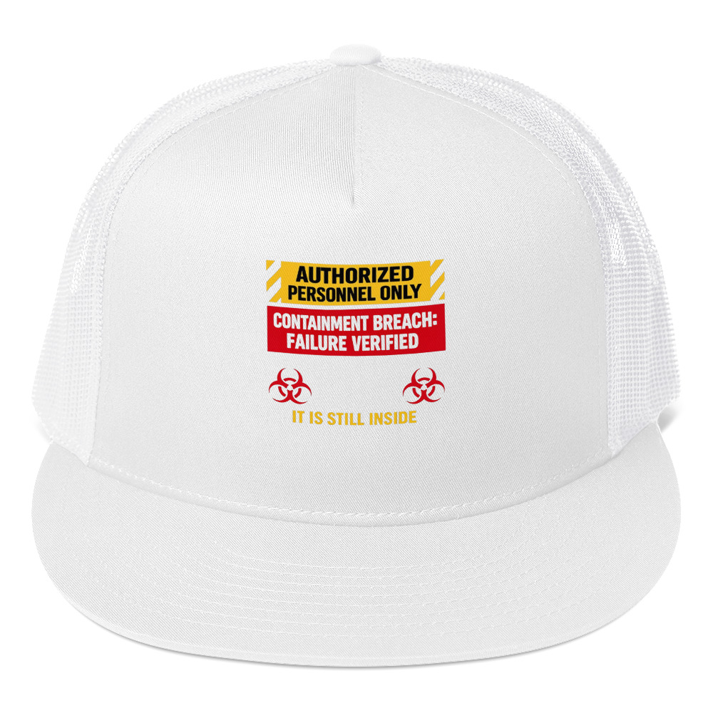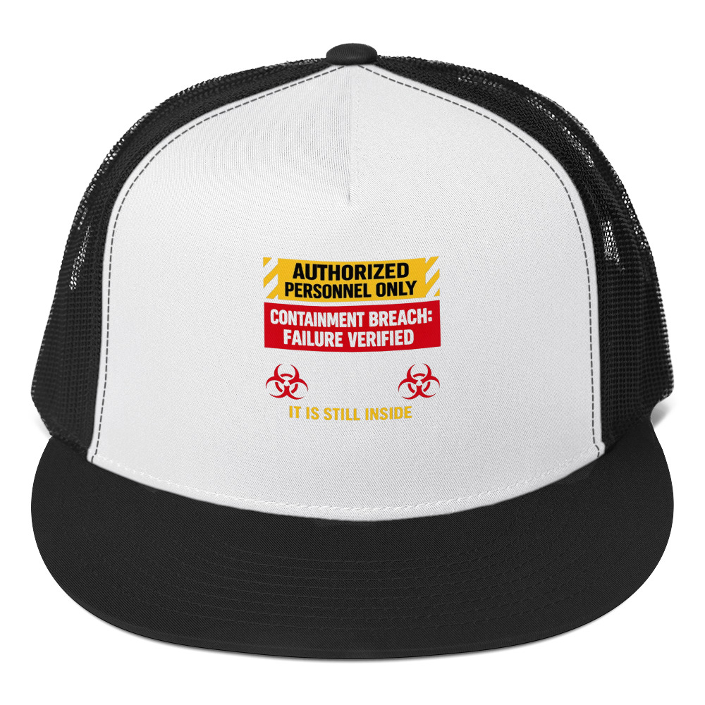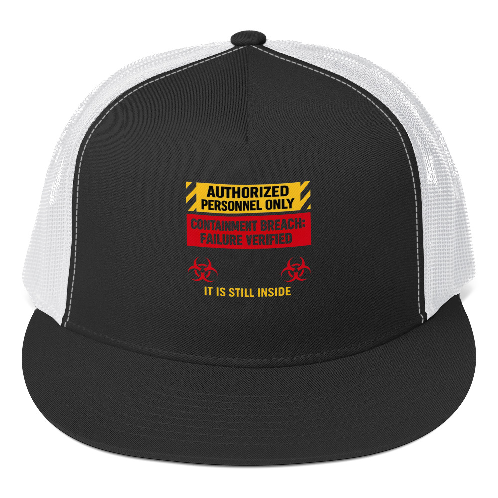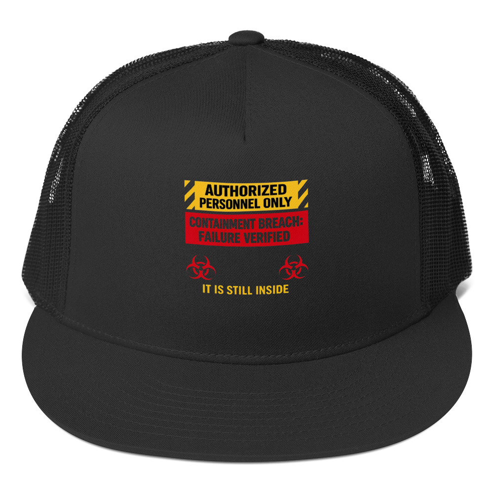 AUTHORIZED PERSONNEL ONLY (IT IS STILL INSIDE) – An industrial hazard-style sign that quietly admits containment has failed, using cold official language to heighten the fear.