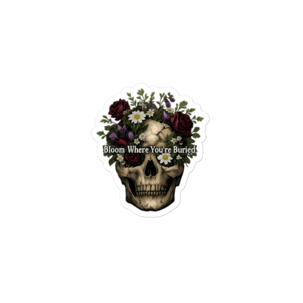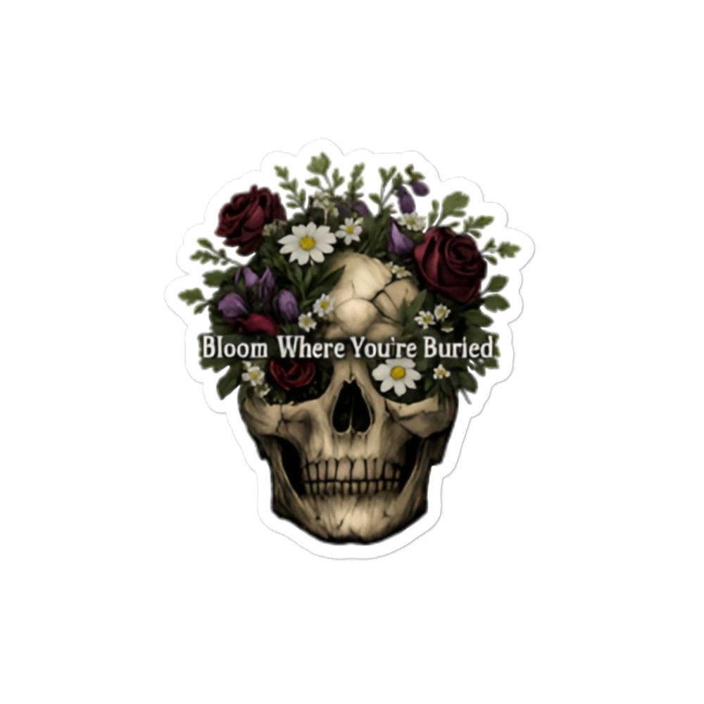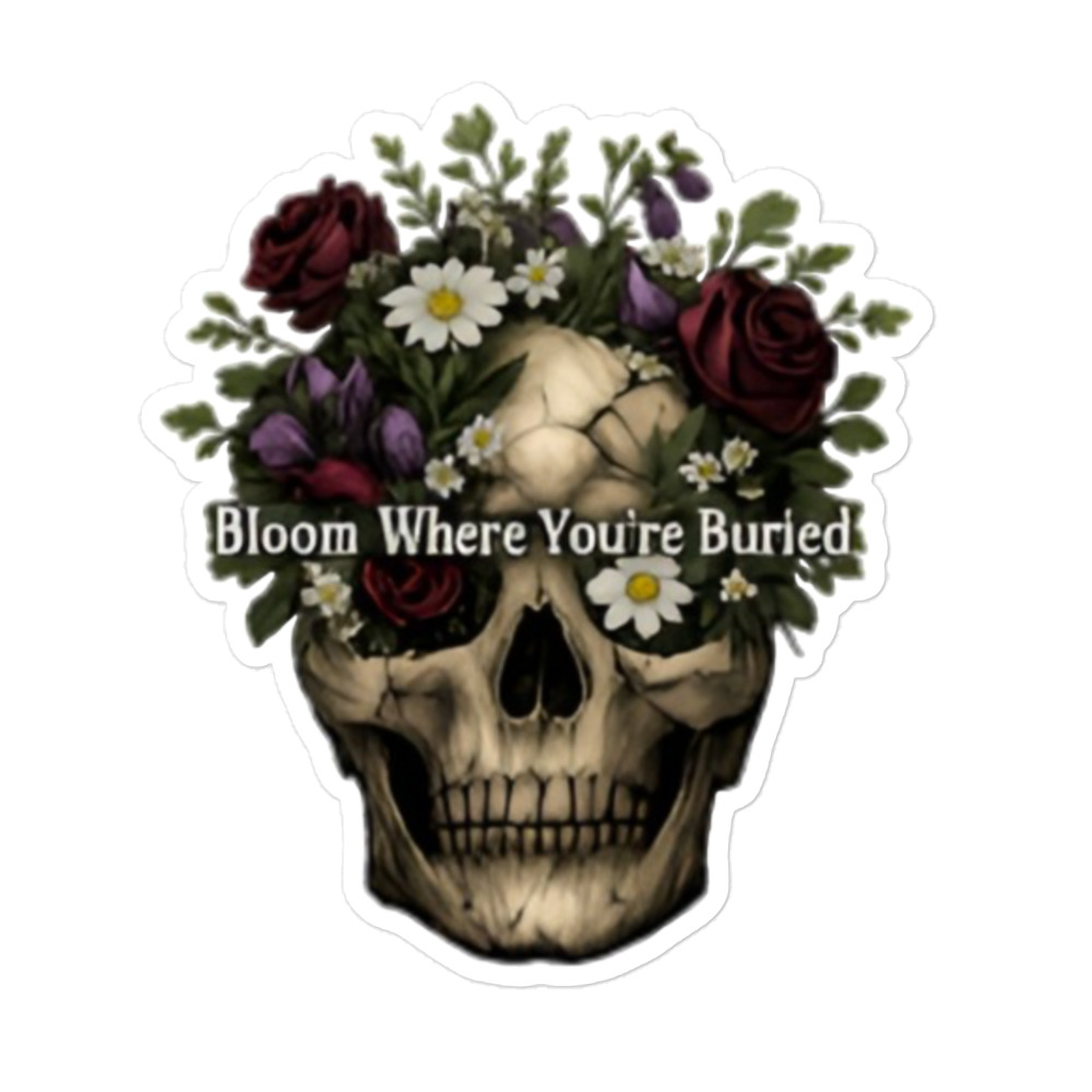 Bloom Where You’re Buried – A cracked human skull crowned with lush dark roses, purple tulips, white daisies, and wild greenery. Gothic floral meets dark romance and memento mori.