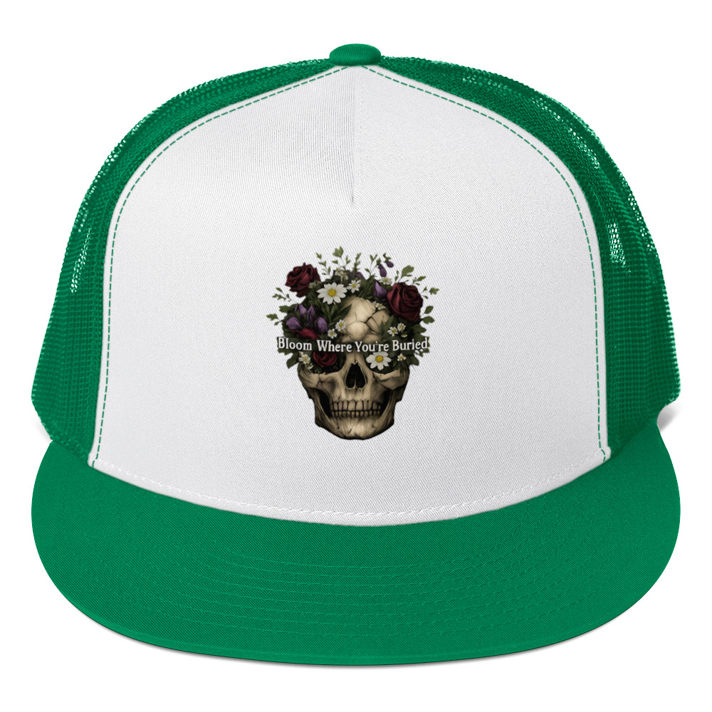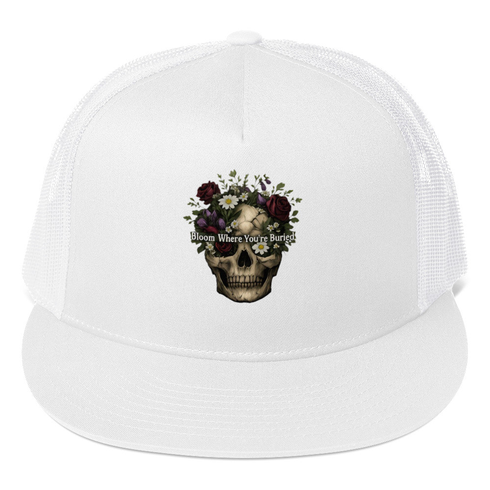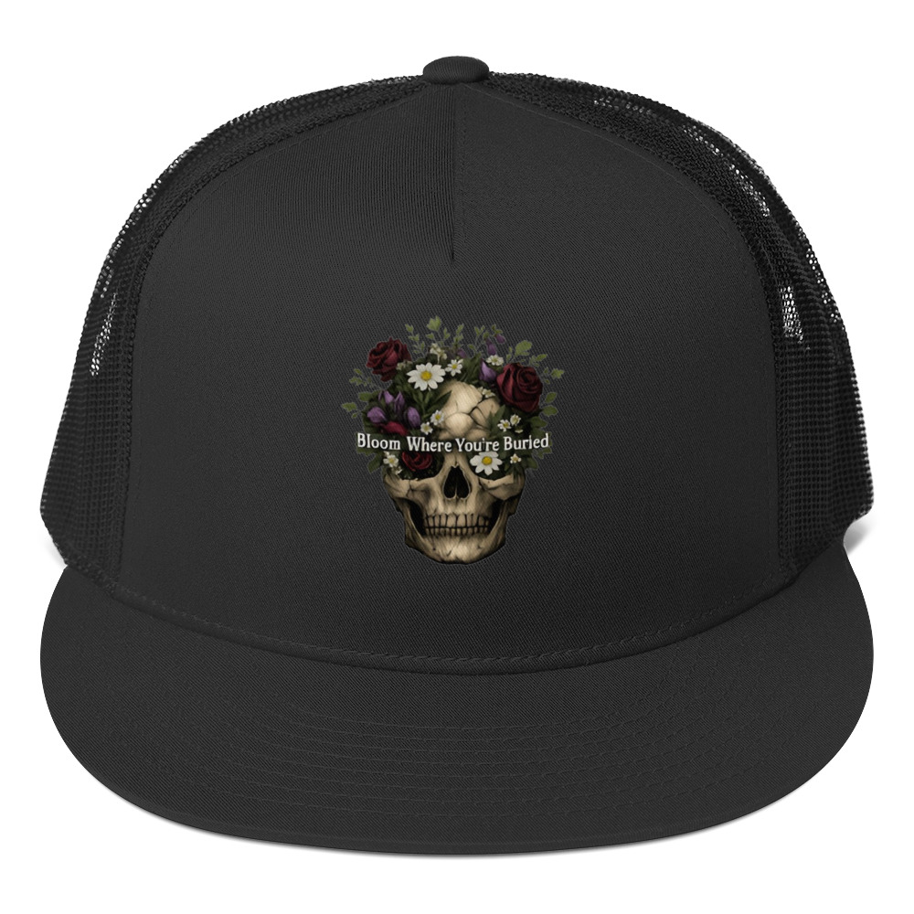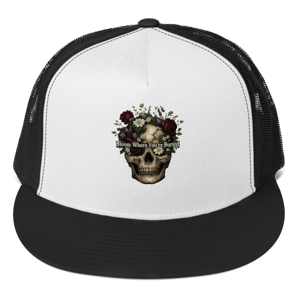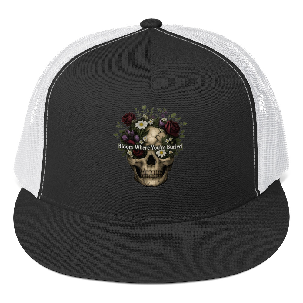 Bloom Where You’re Buried – A cracked human skull crowned with lush dark roses, purple tulips, white daisies, and wild greenery. Gothic floral meets dark romance and memento mori.