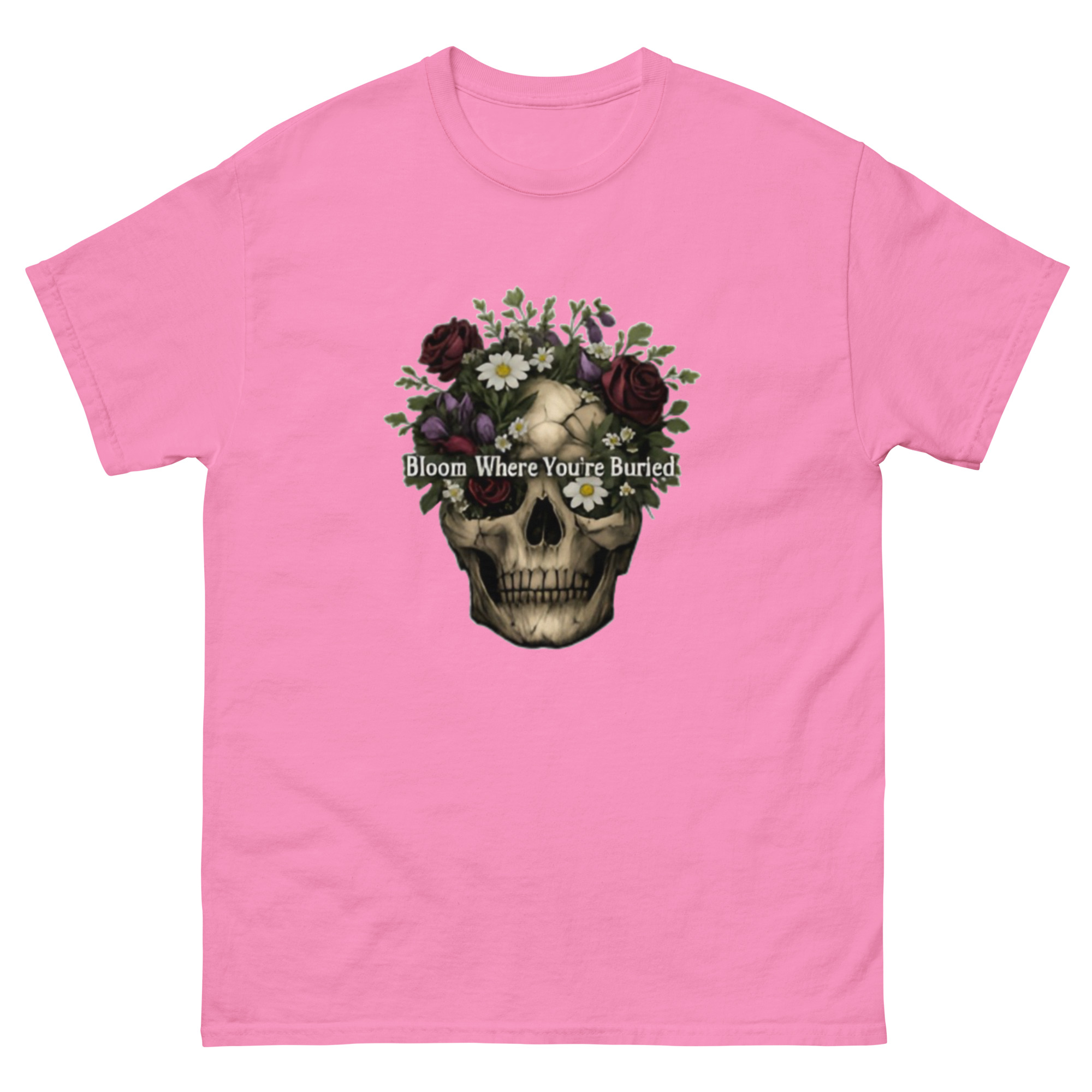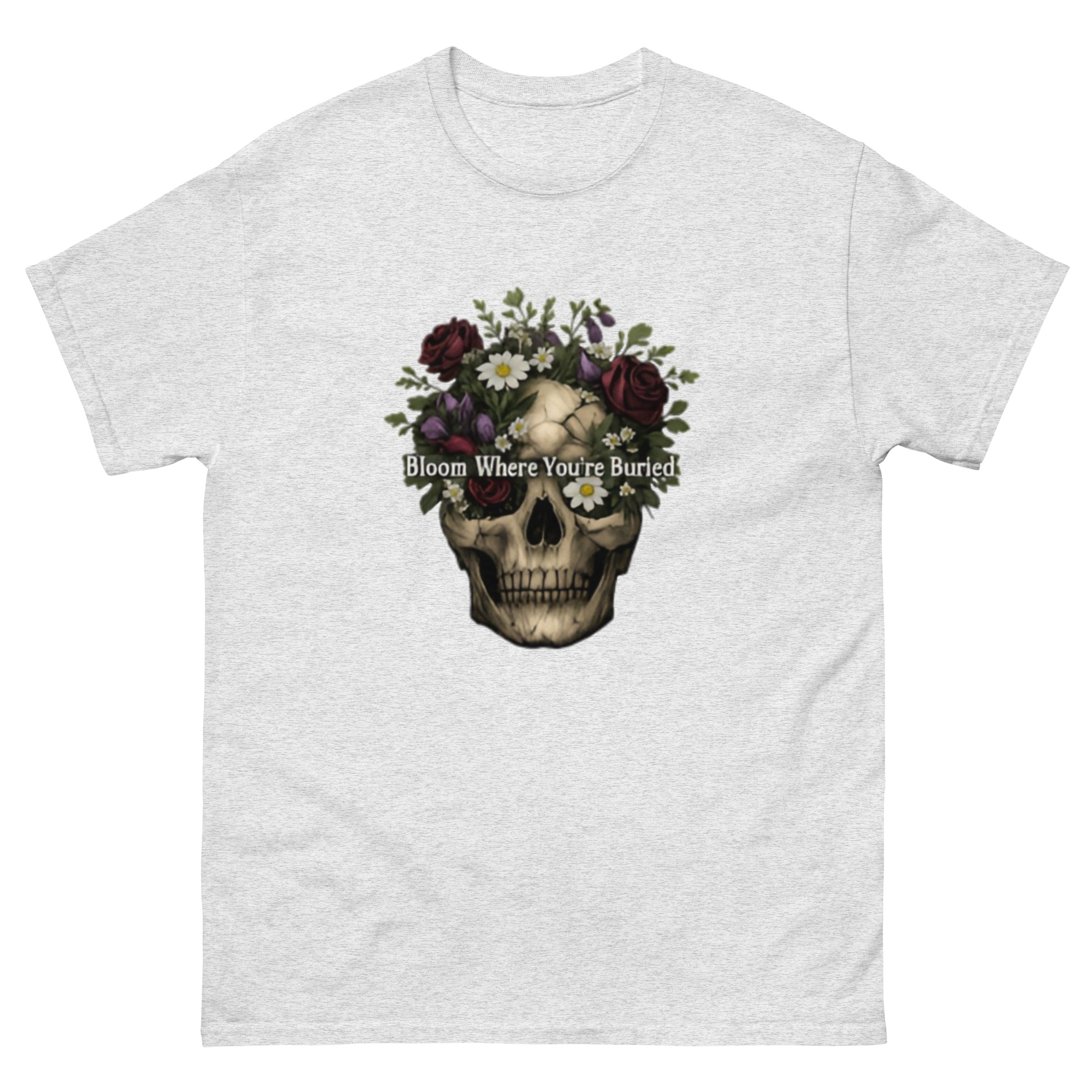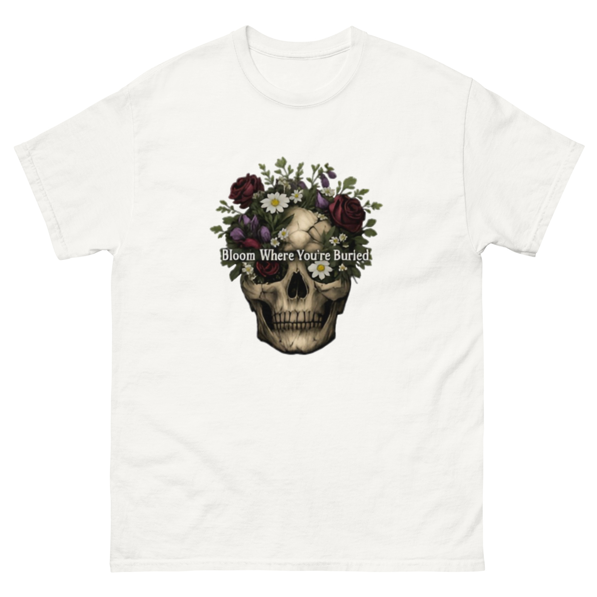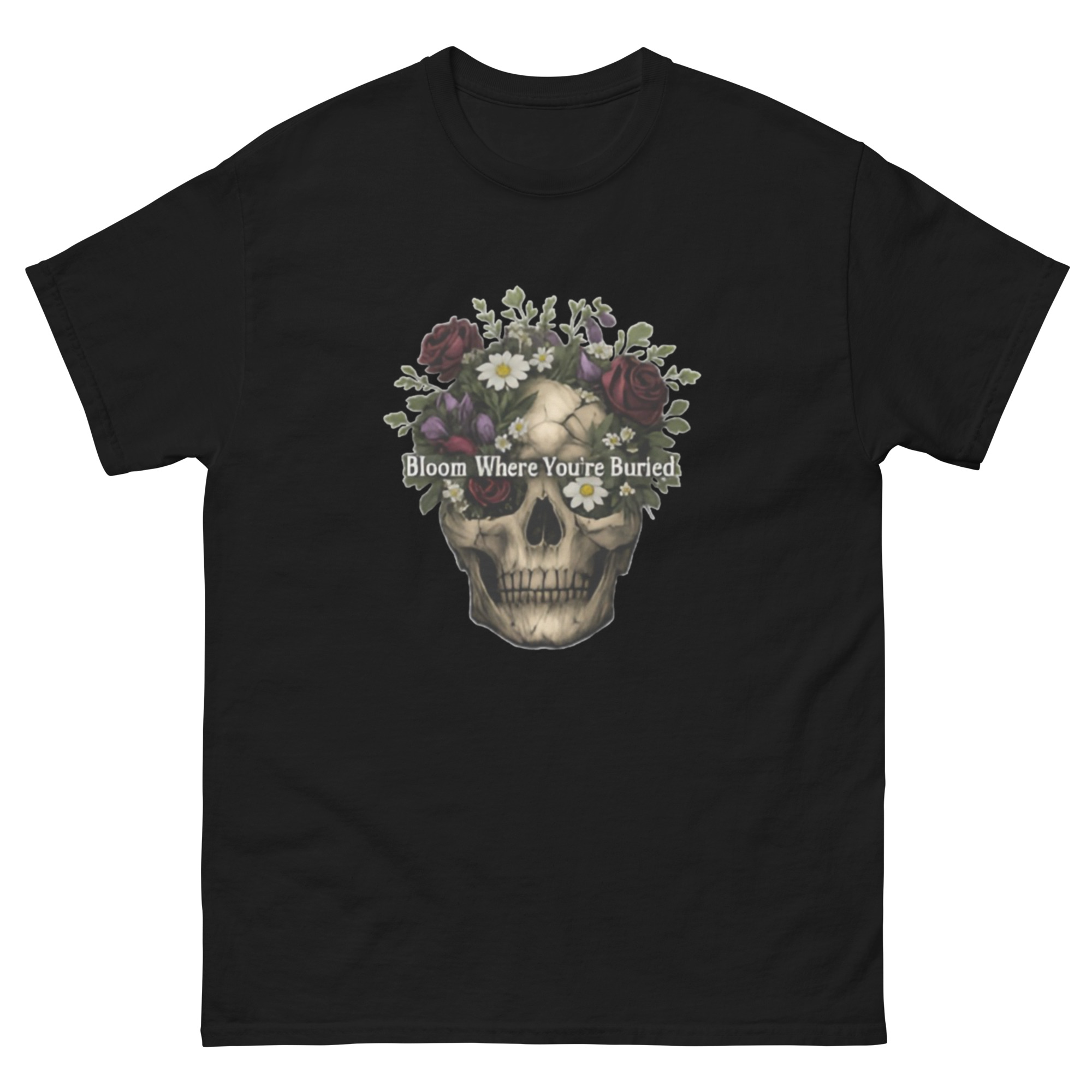 Bloom Where You’re Buried – A cracked human skull crowned with lush dark roses, purple tulips, white daisies, and wild greenery. Gothic floral meets dark romance and memento mori.