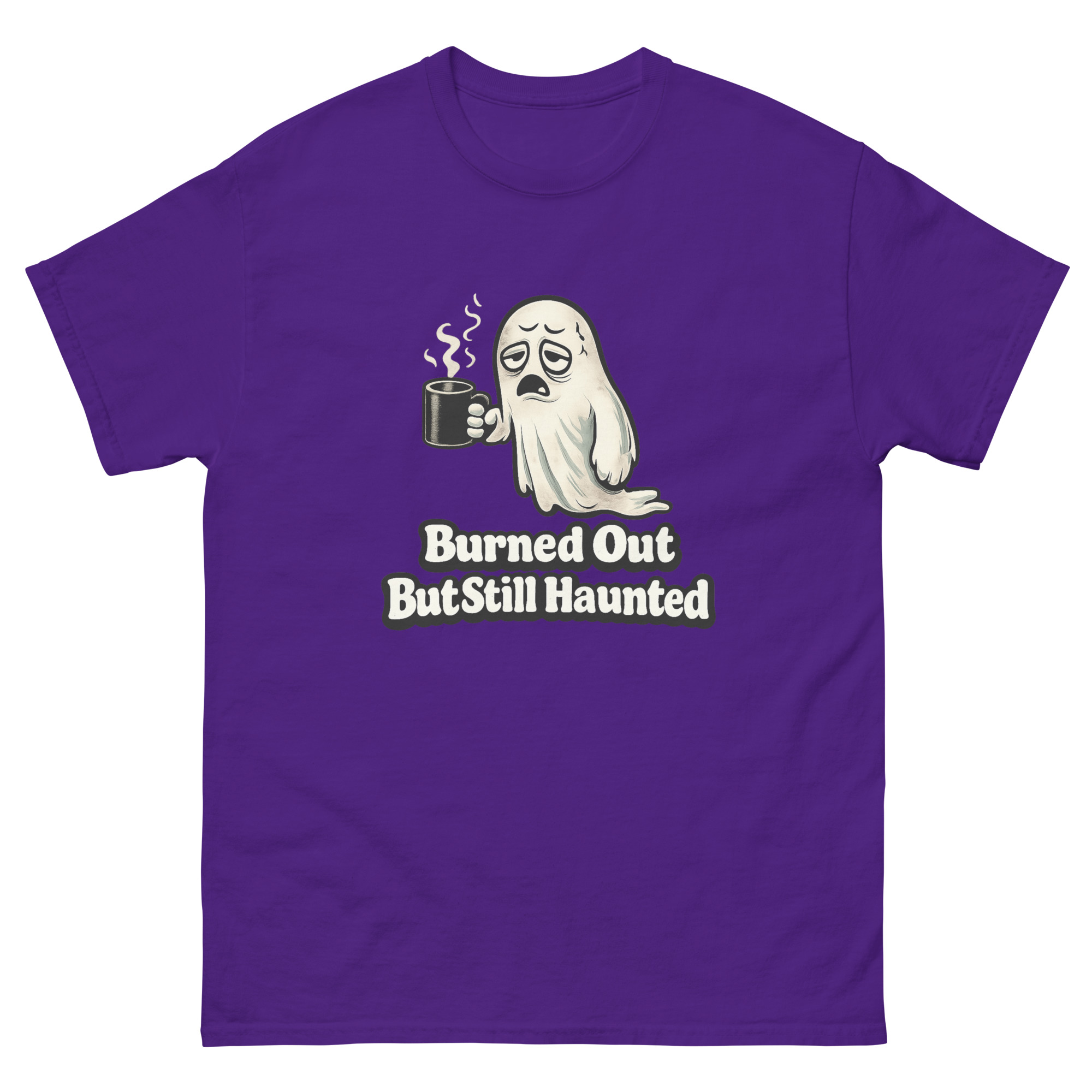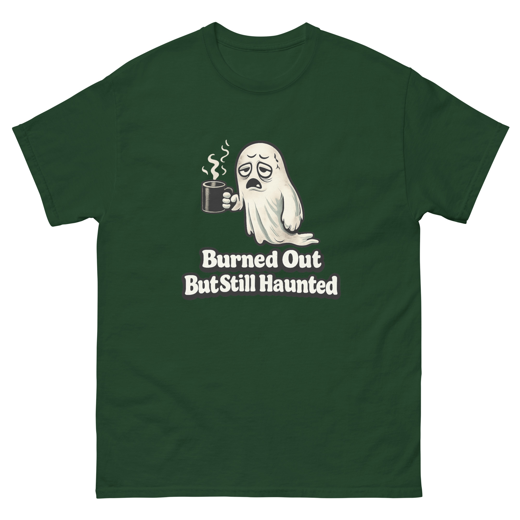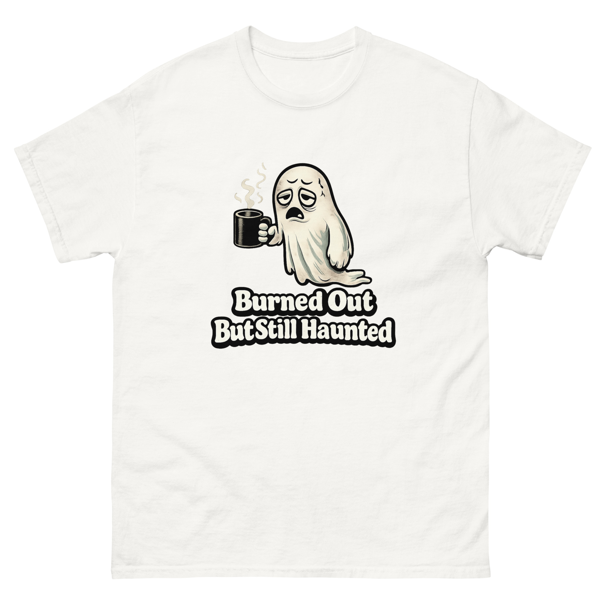 Burned Out But Still Haunted – An exhausted cartoon ghost slumps through another endless workday, clutching an oversized coffee mug, blending office humor with creepy-cute supernatural vibes for anyone who’s spiritually tired but still showing up.