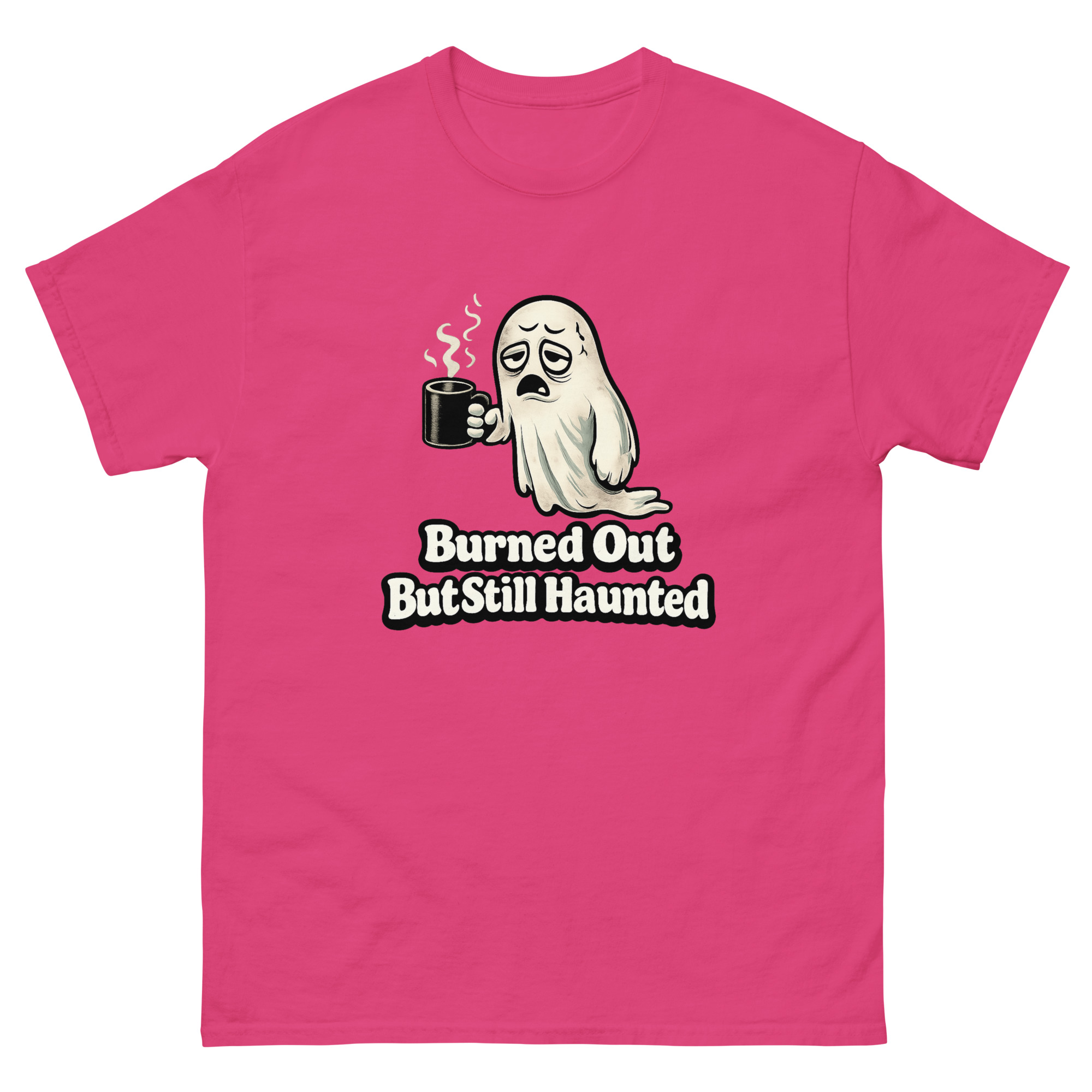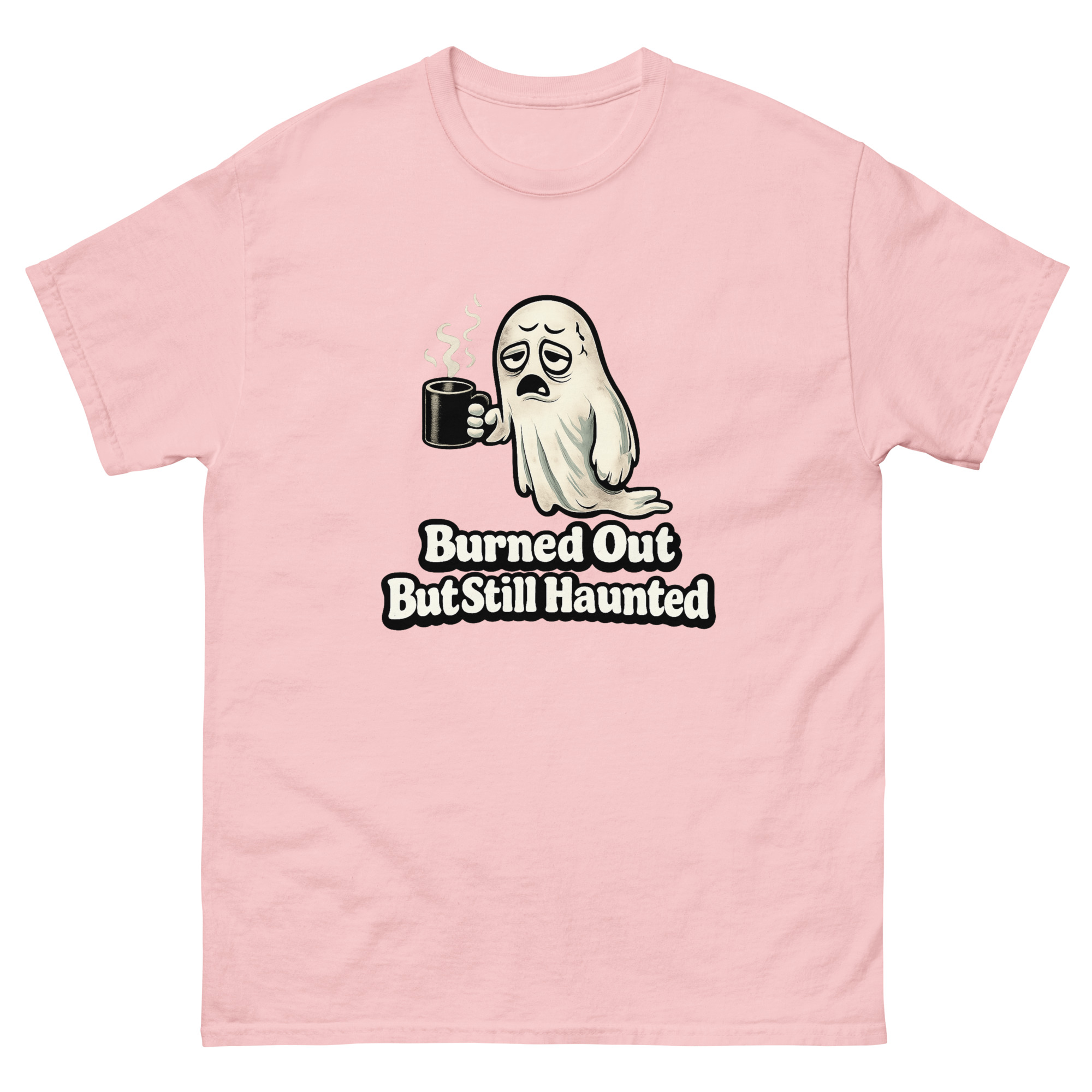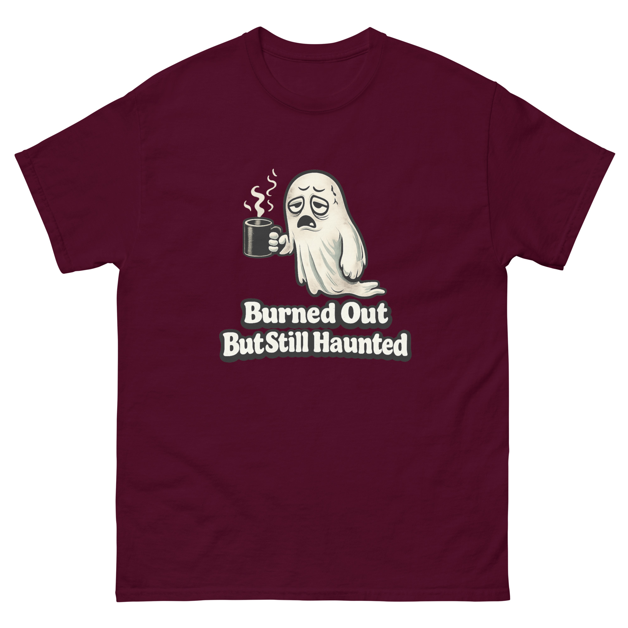 Burned Out But Still Haunted – An exhausted cartoon ghost slumps through another endless workday, clutching an oversized coffee mug, blending office humor with creepy-cute supernatural vibes for anyone who’s spiritually tired but still showing up.
