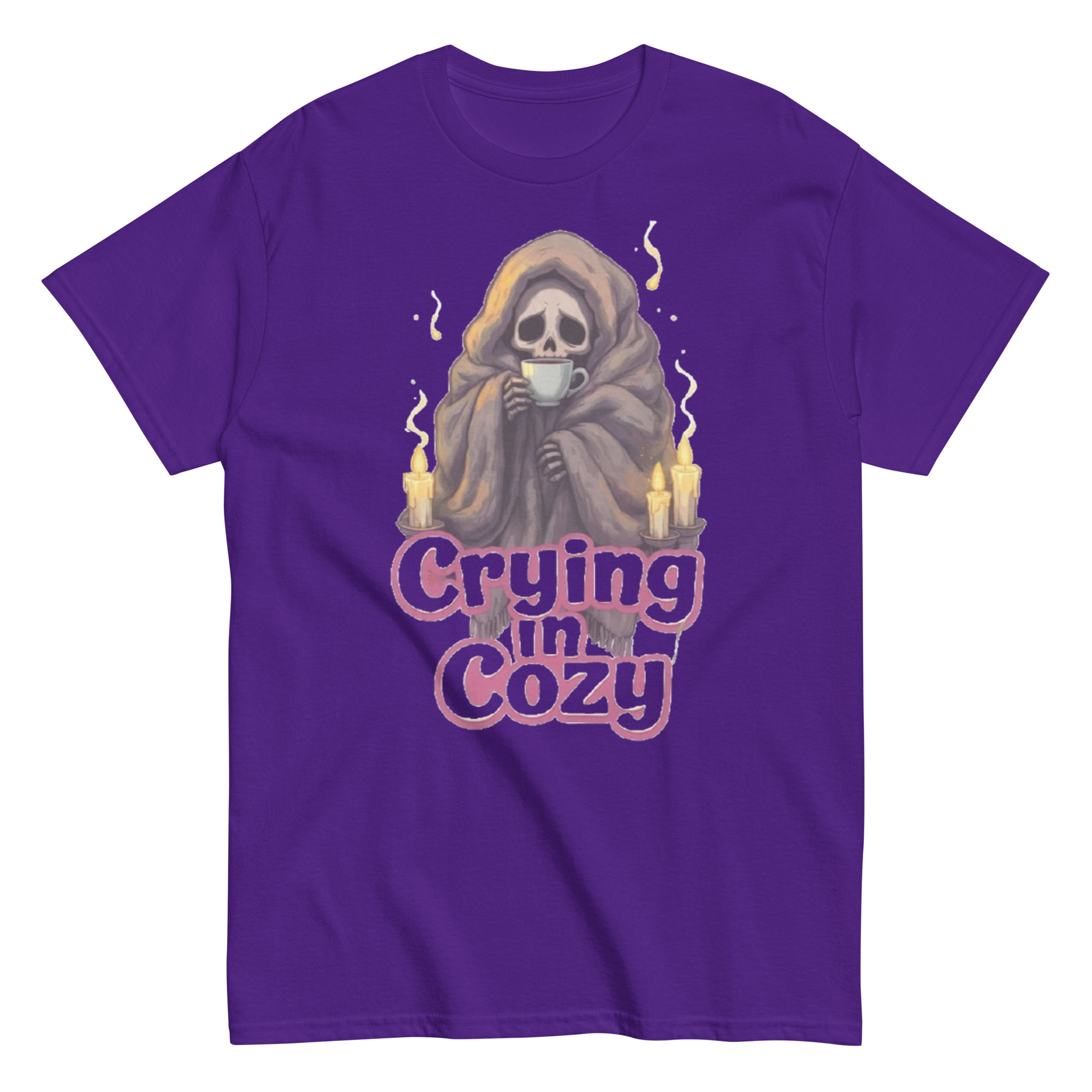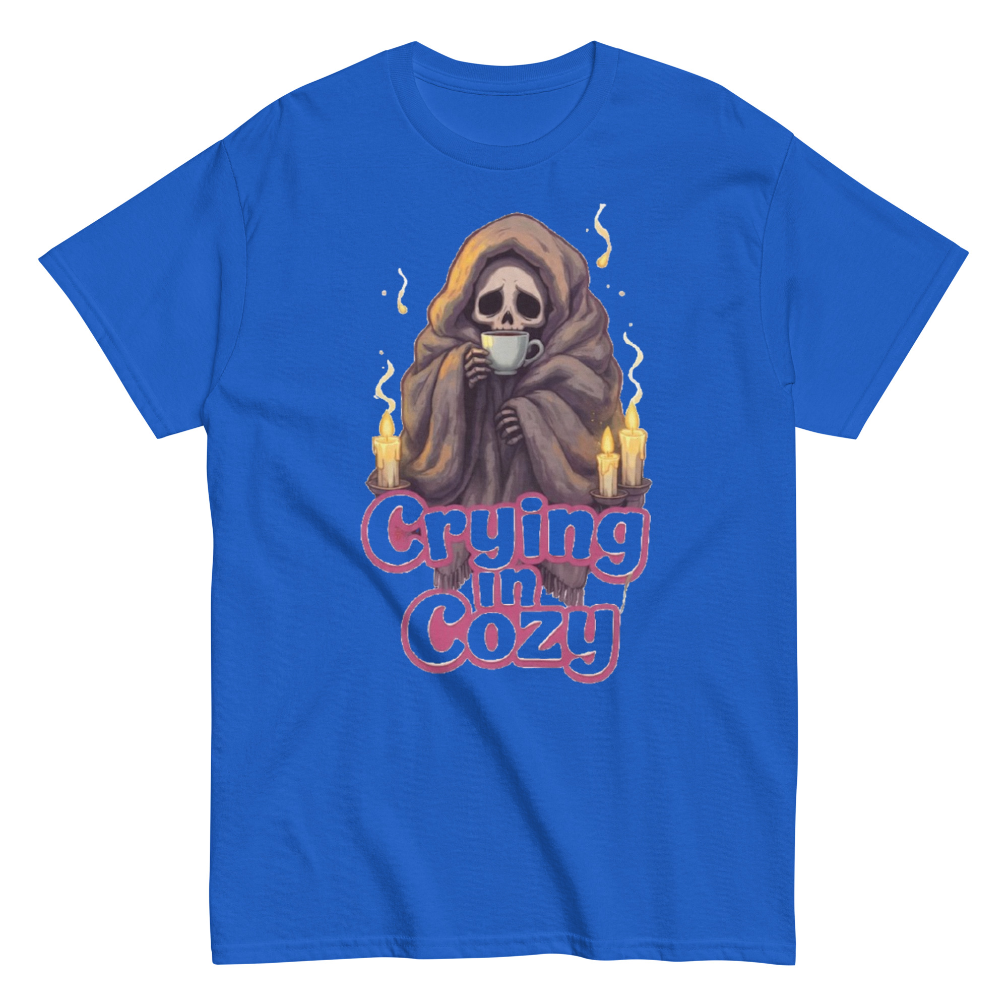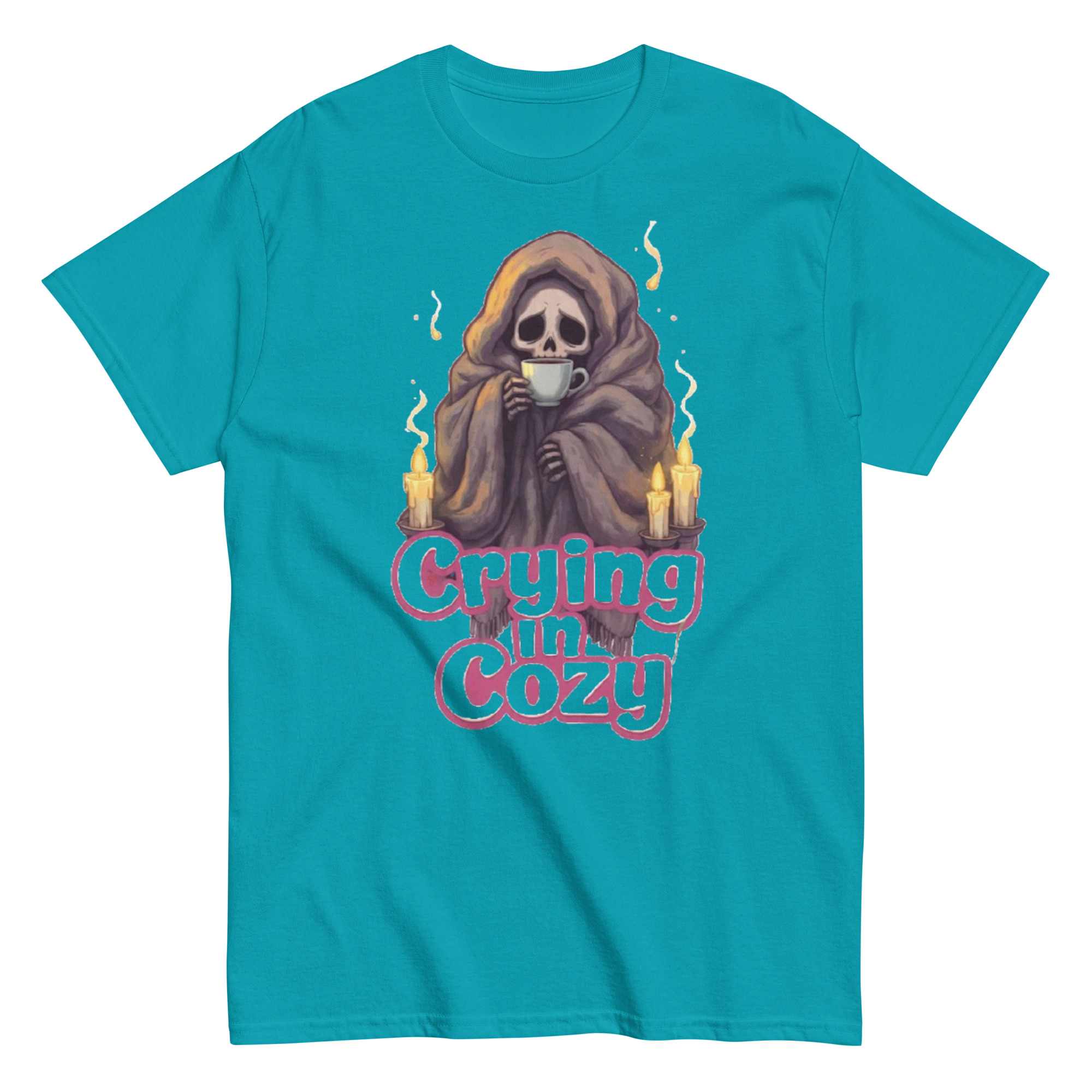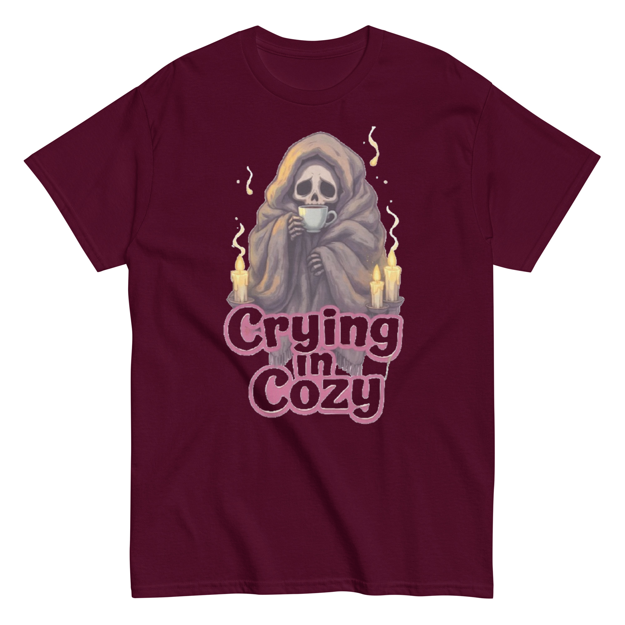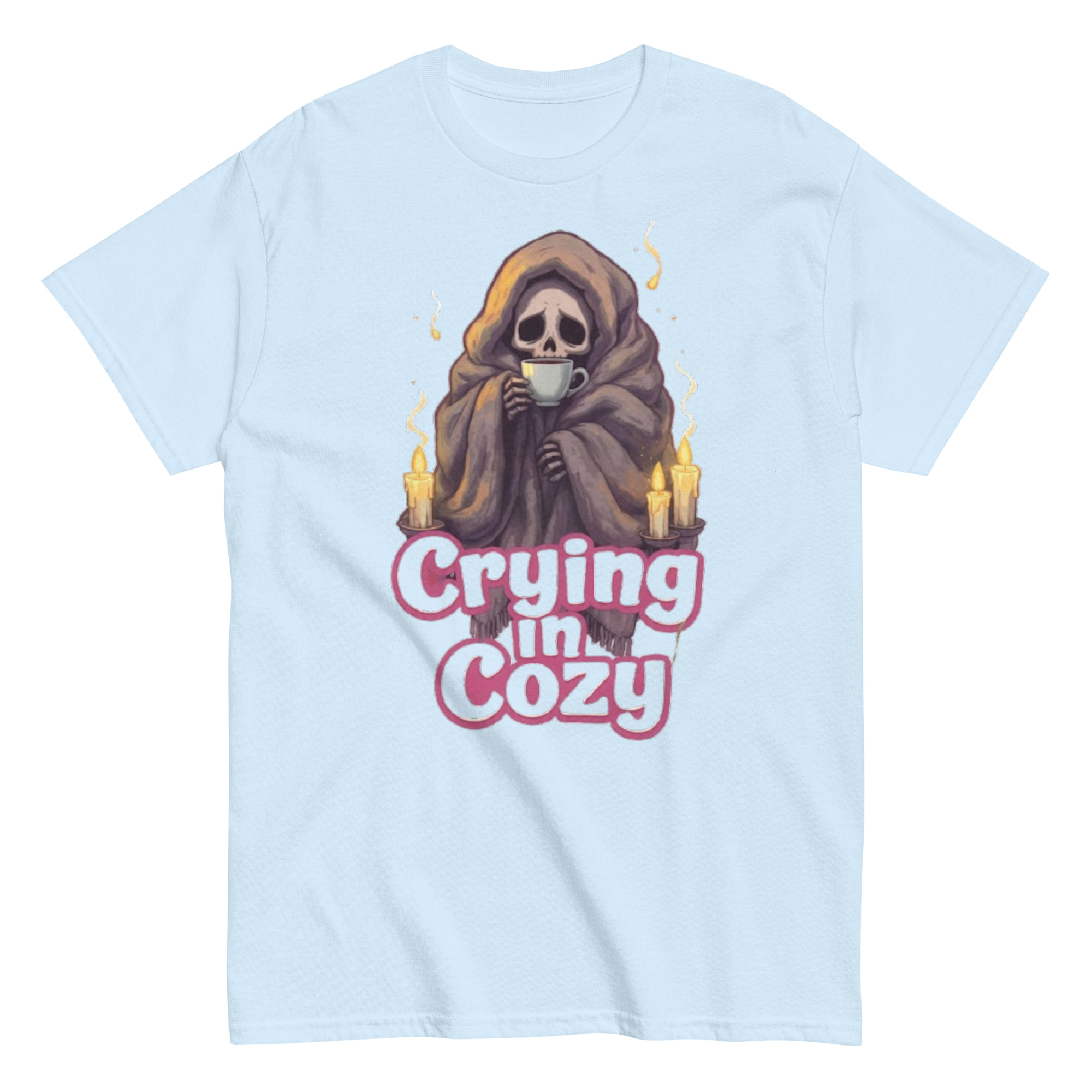 Crying in Cozy – A skeleton wrapped tightly in a soft blanket, cradling a warm cup of tea as candlelight flickers nearby. A winter sad-core scene that blends comfort and melancholy — gentle, relatable, and quietly emotional. Cozy goth energy with a touch of dark humor.