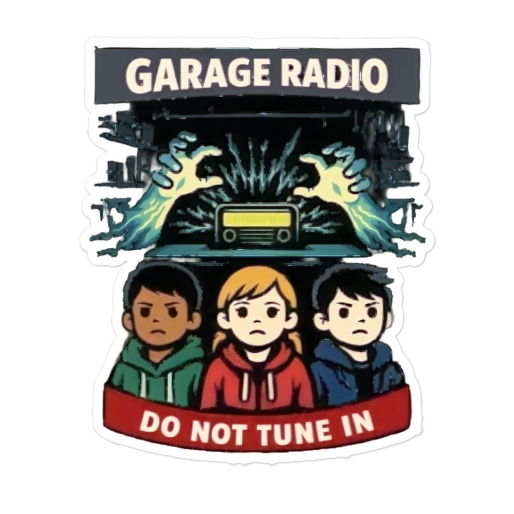 Garage Radio: Do Not Tune In – A vintage garage radio crackles with unseen presence while three uneasy kids linger below, caught between curiosity and dread.