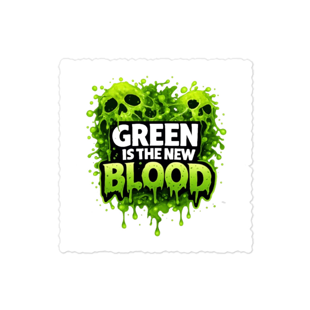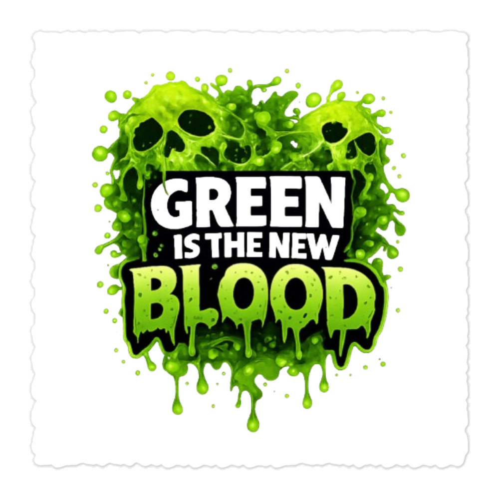 Green Is The New Blood ~ Bold neon-green slime drips from two melting skulls surrounding the phrase in dripping horror-style text. Toxic gore meets cult horror aesthetic.