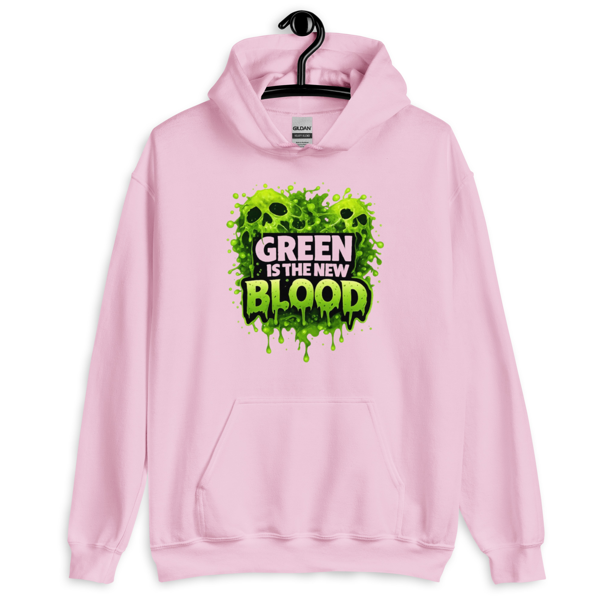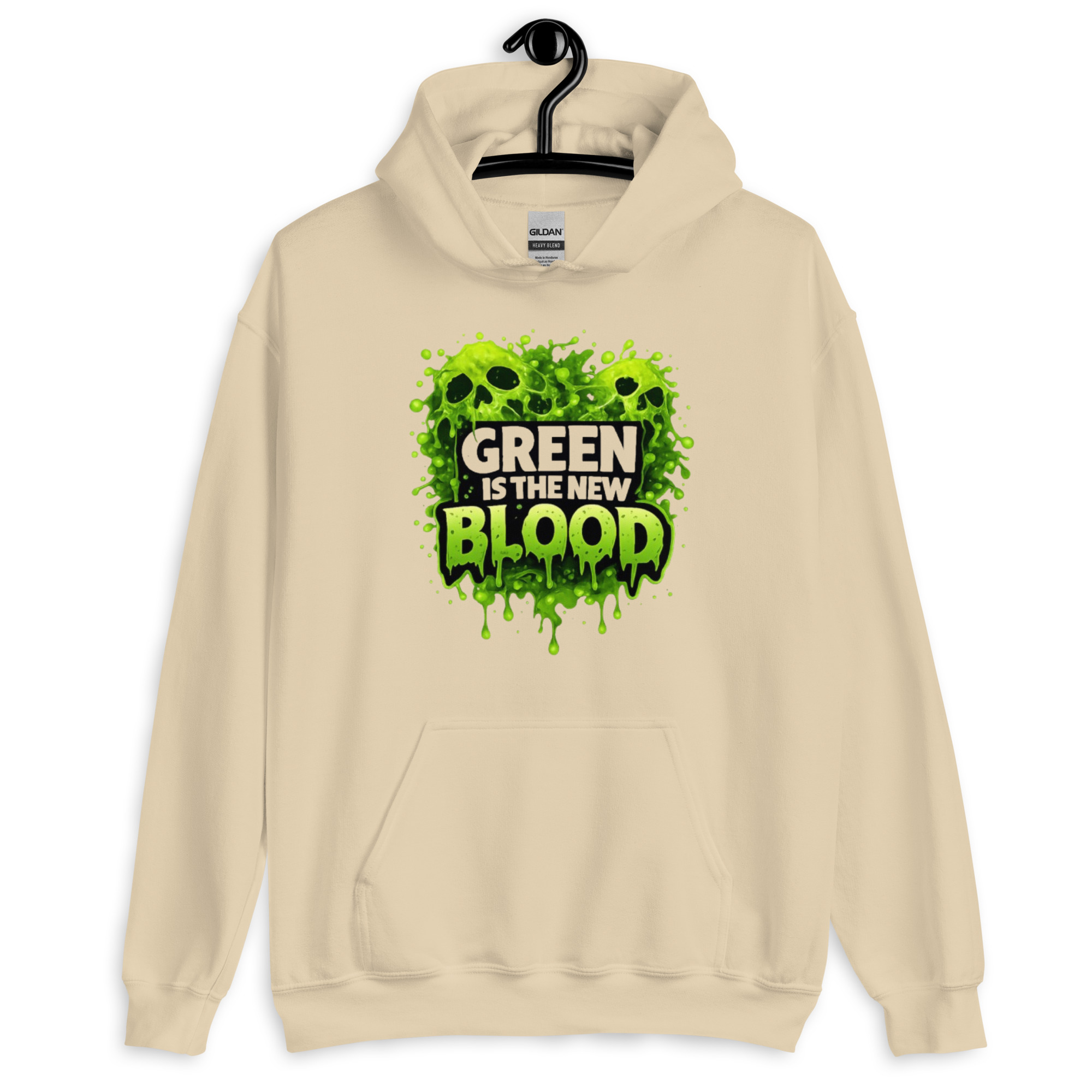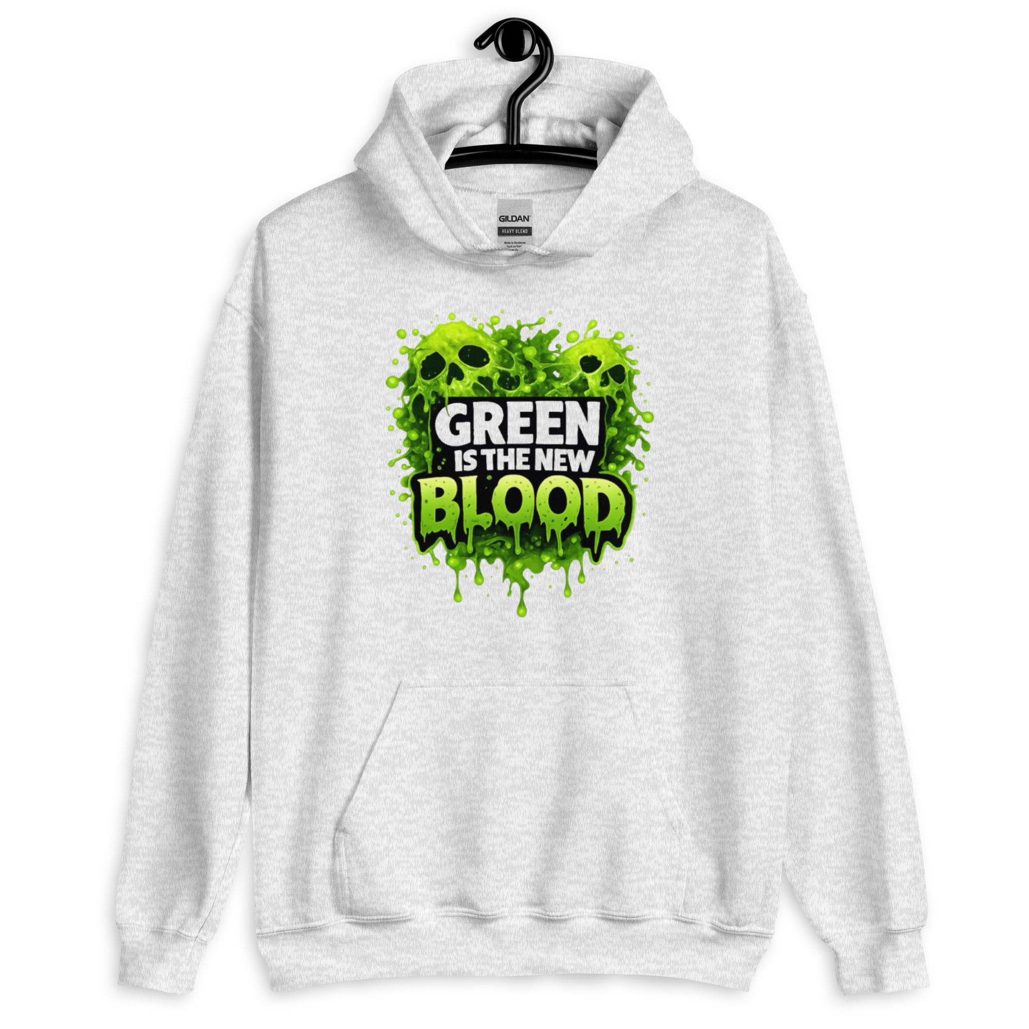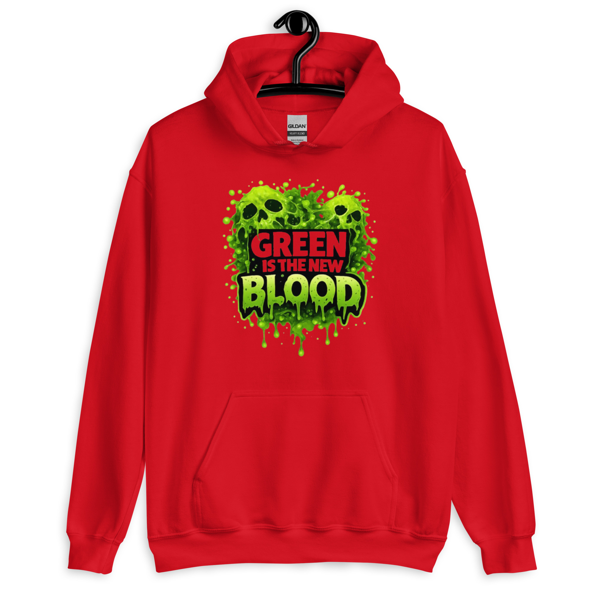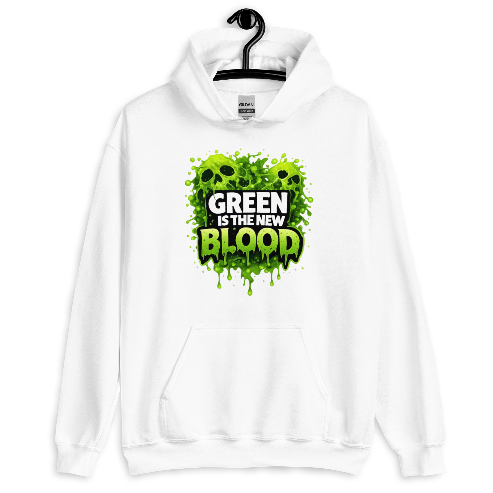Green Is The New Blood ~ Bold neon-green slime drips from two melting skulls surrounding the phrase in dripping horror-style text. Toxic gore meets cult horror aesthetic.