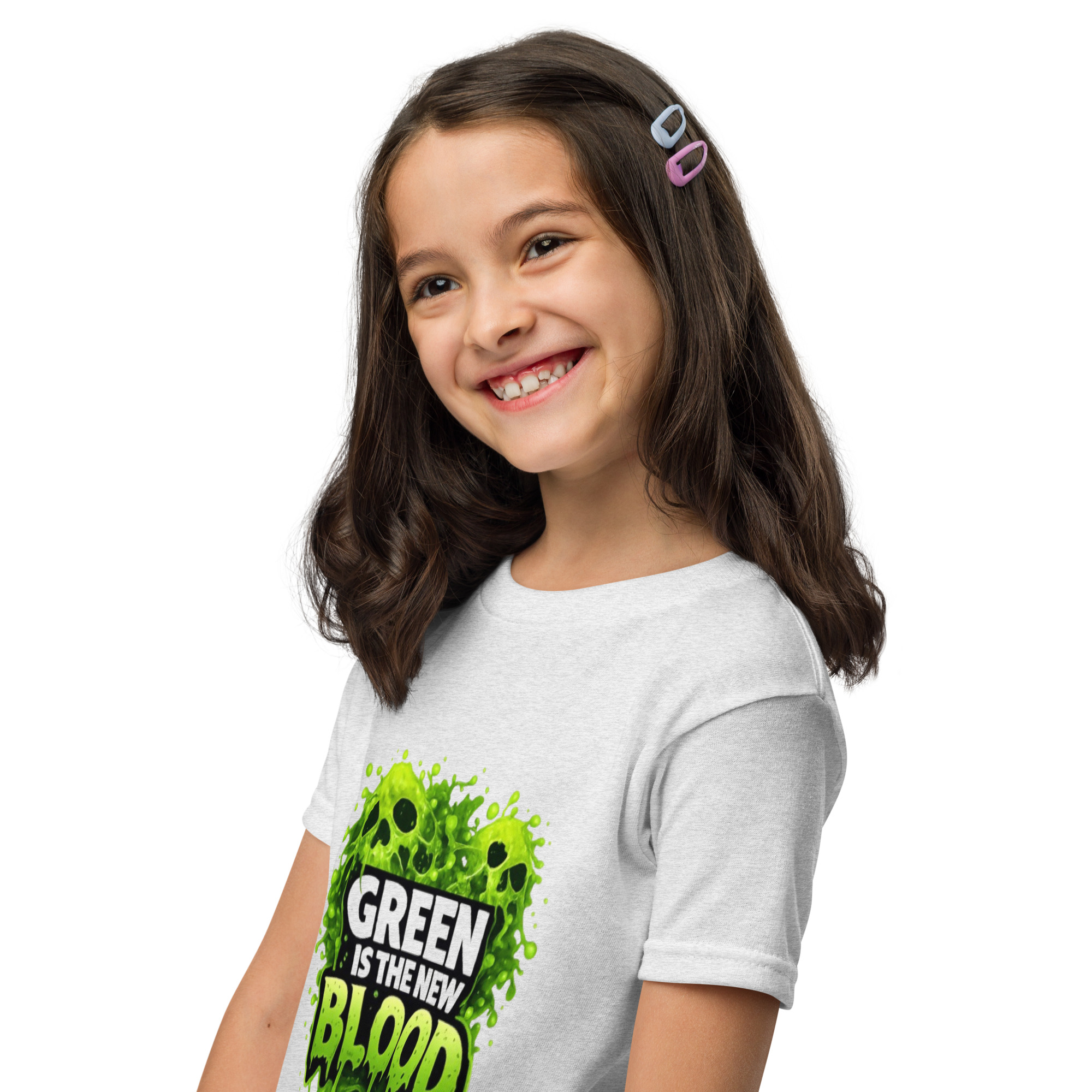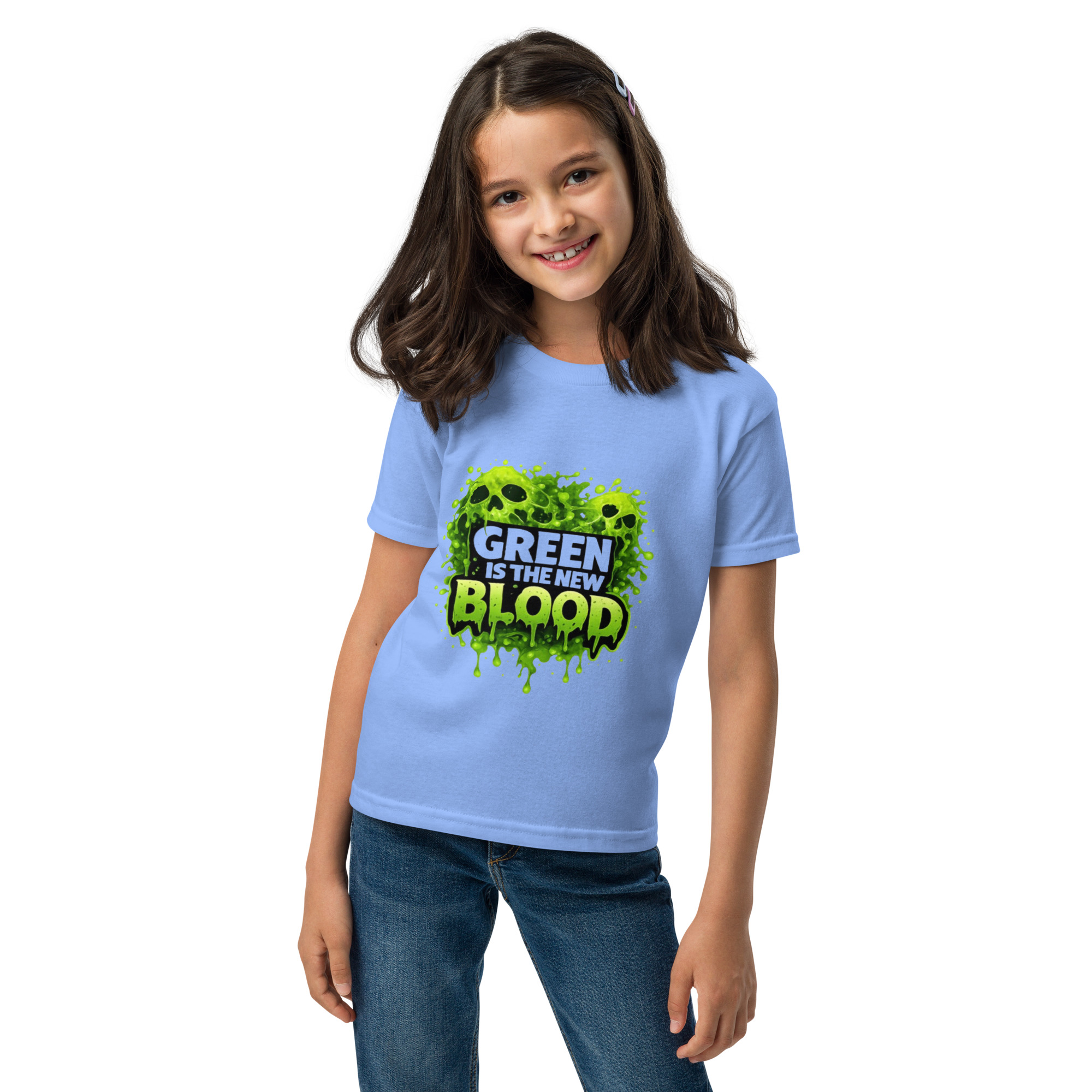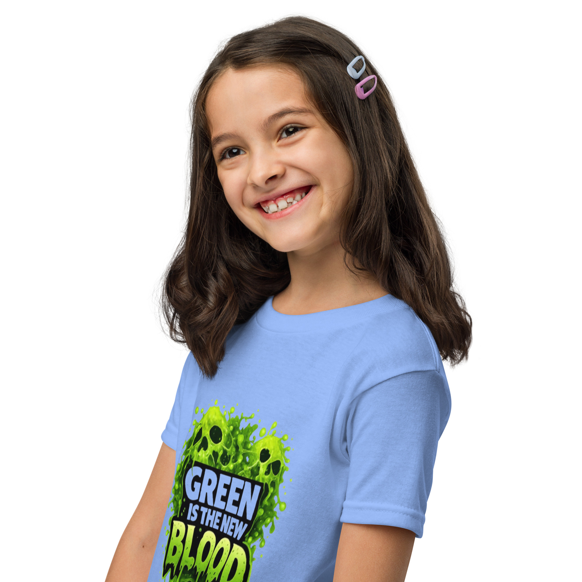 Green Is The New Blood ~ Bold neon-green slime drips from two melting skulls surrounding the phrase in dripping horror-style text. Toxic gore meets cult horror aesthetic.