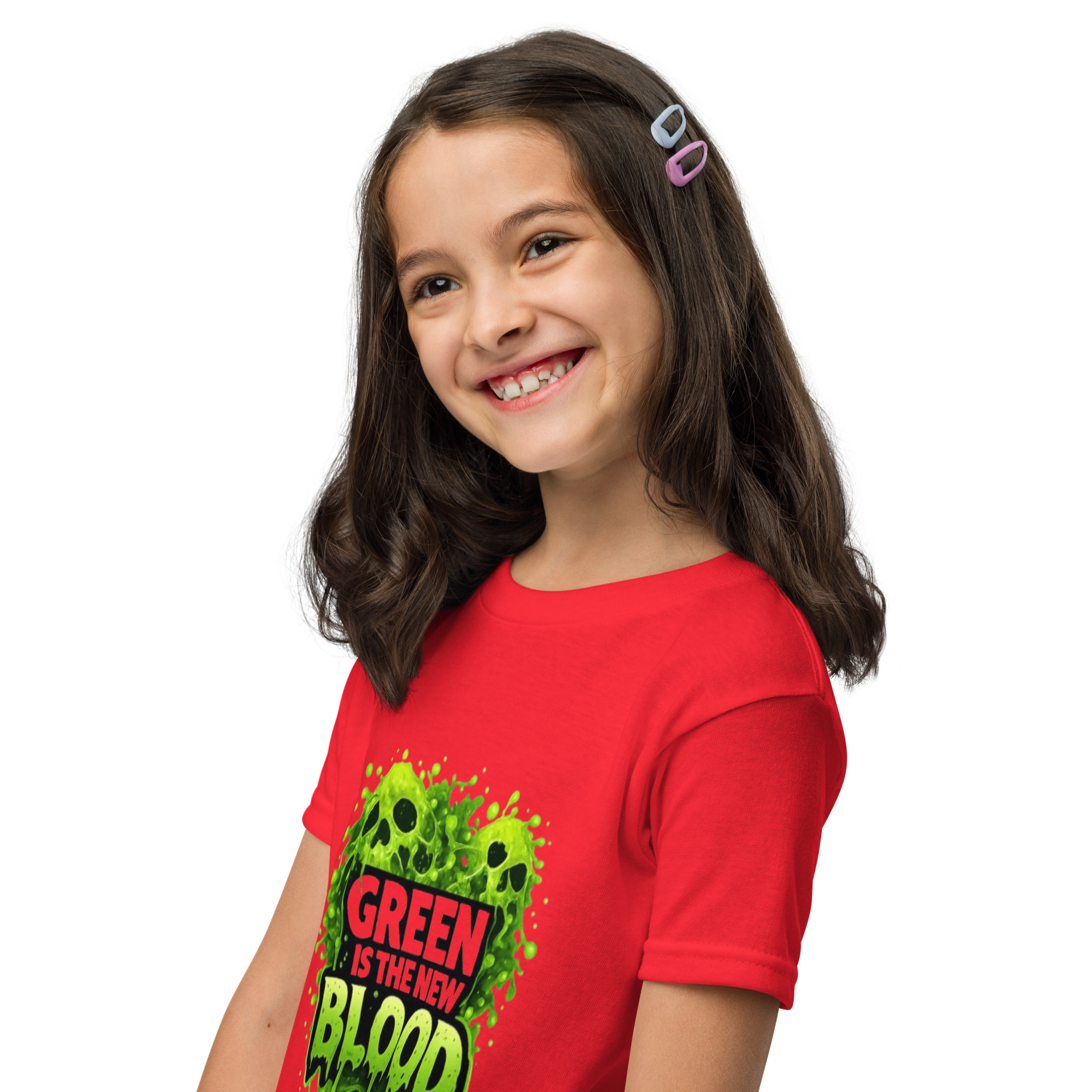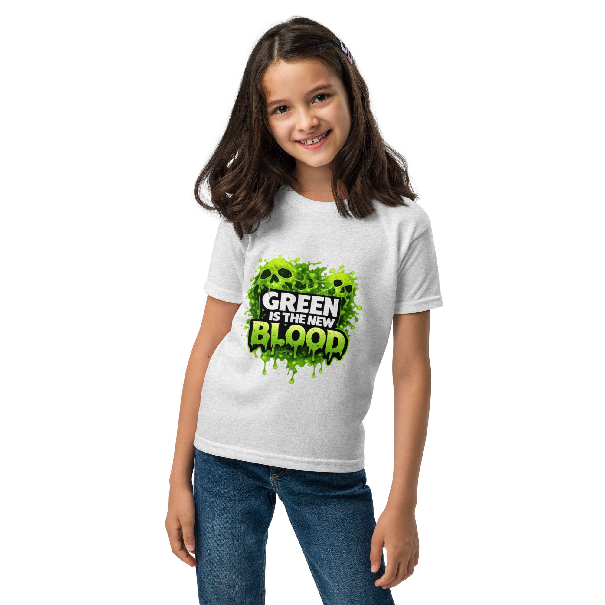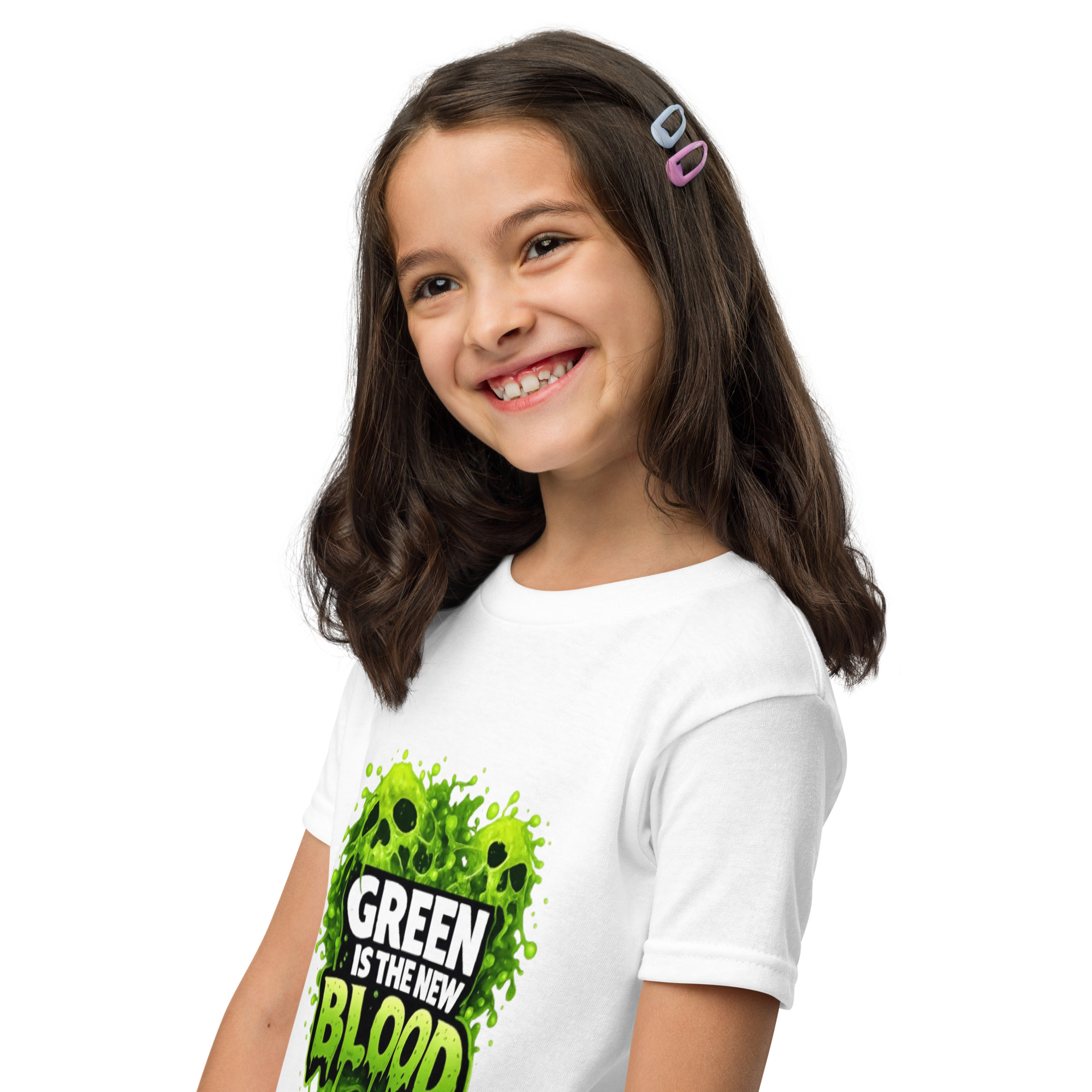 Green Is The New Blood ~ Bold neon-green slime drips from two melting skulls surrounding the phrase in dripping horror-style text. Toxic gore meets cult horror aesthetic.