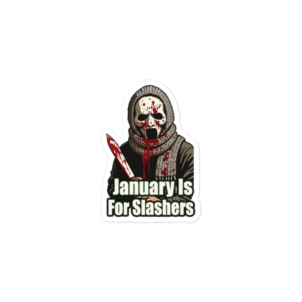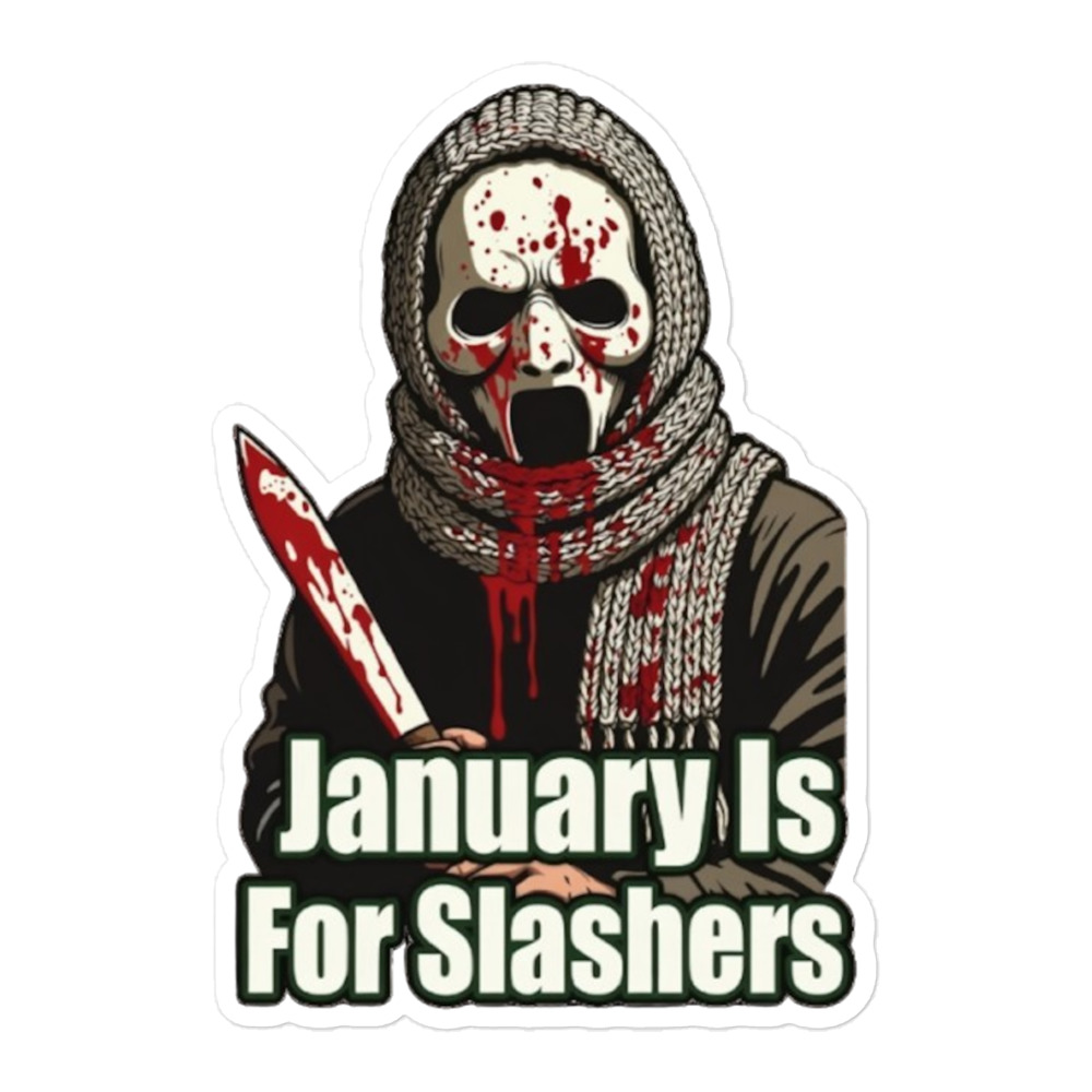January Is For Slashers – A blood-splattered winter scarf wrapped around a masked slasher’s neck in bold grindhouse style.