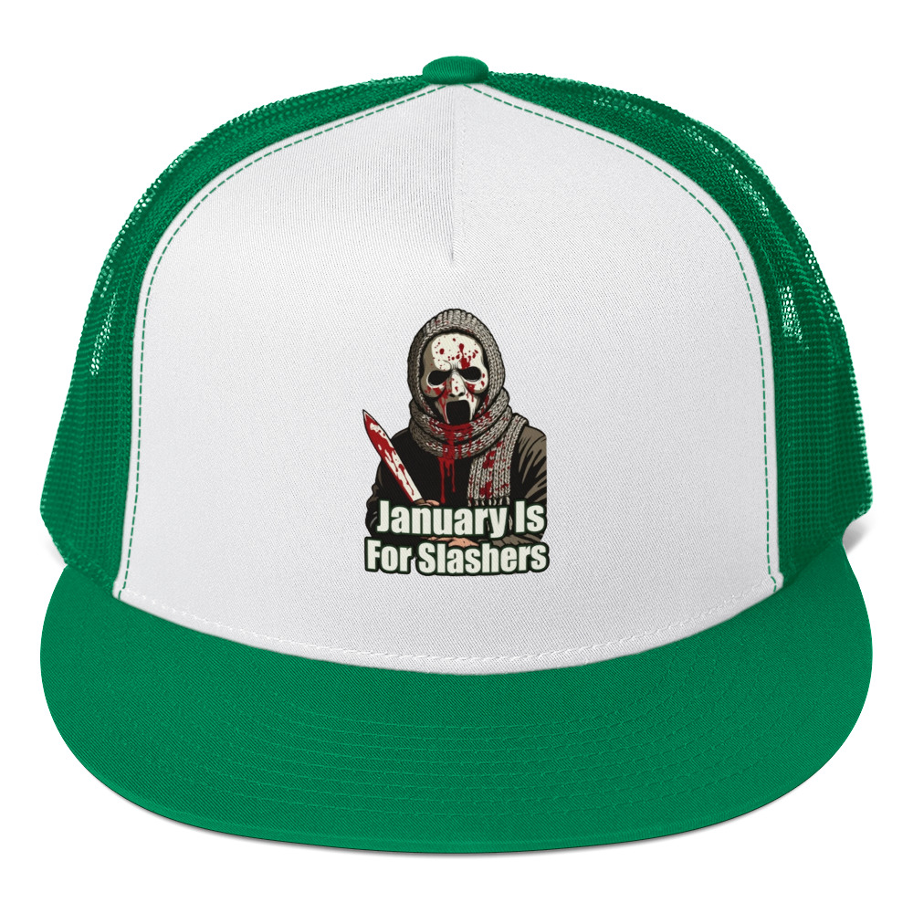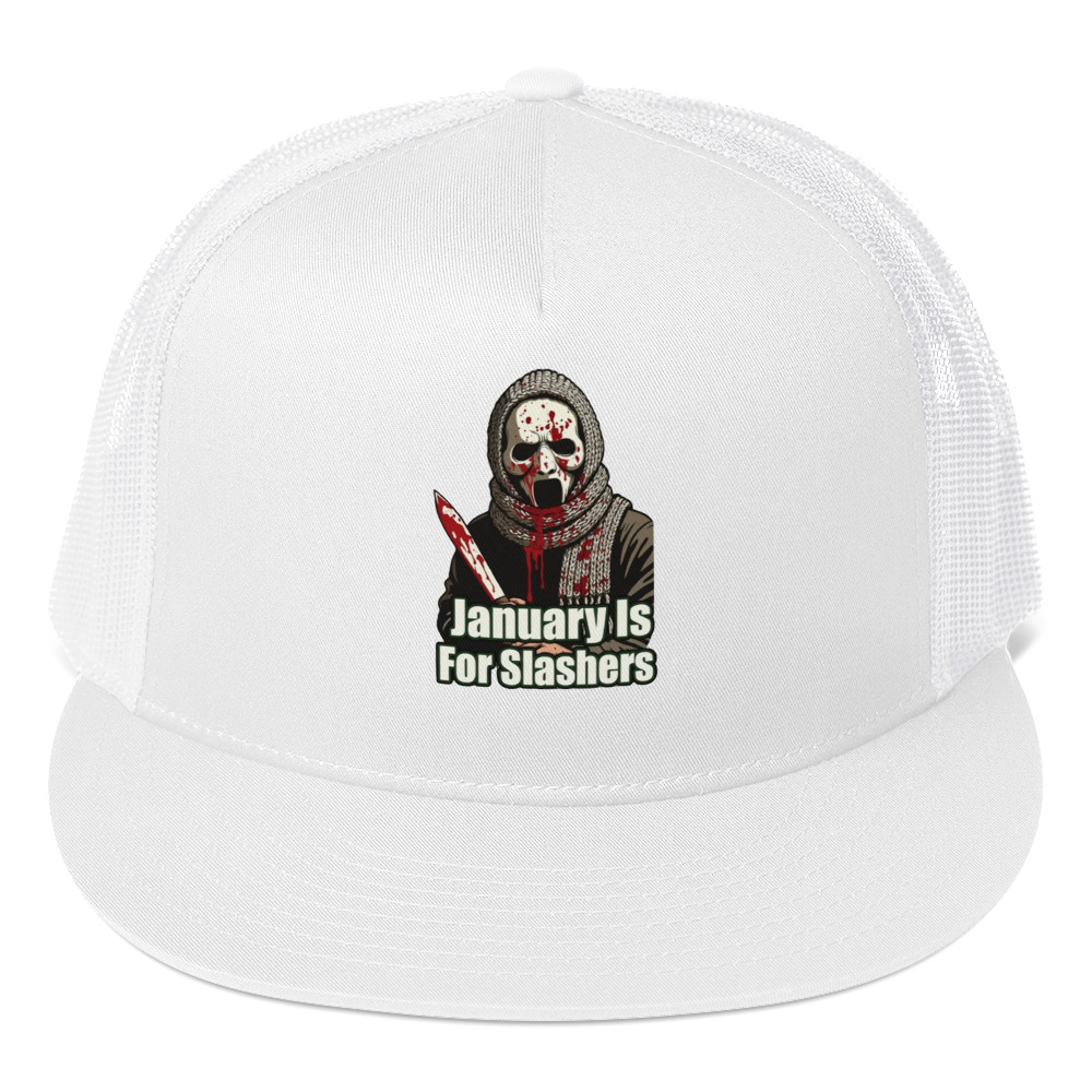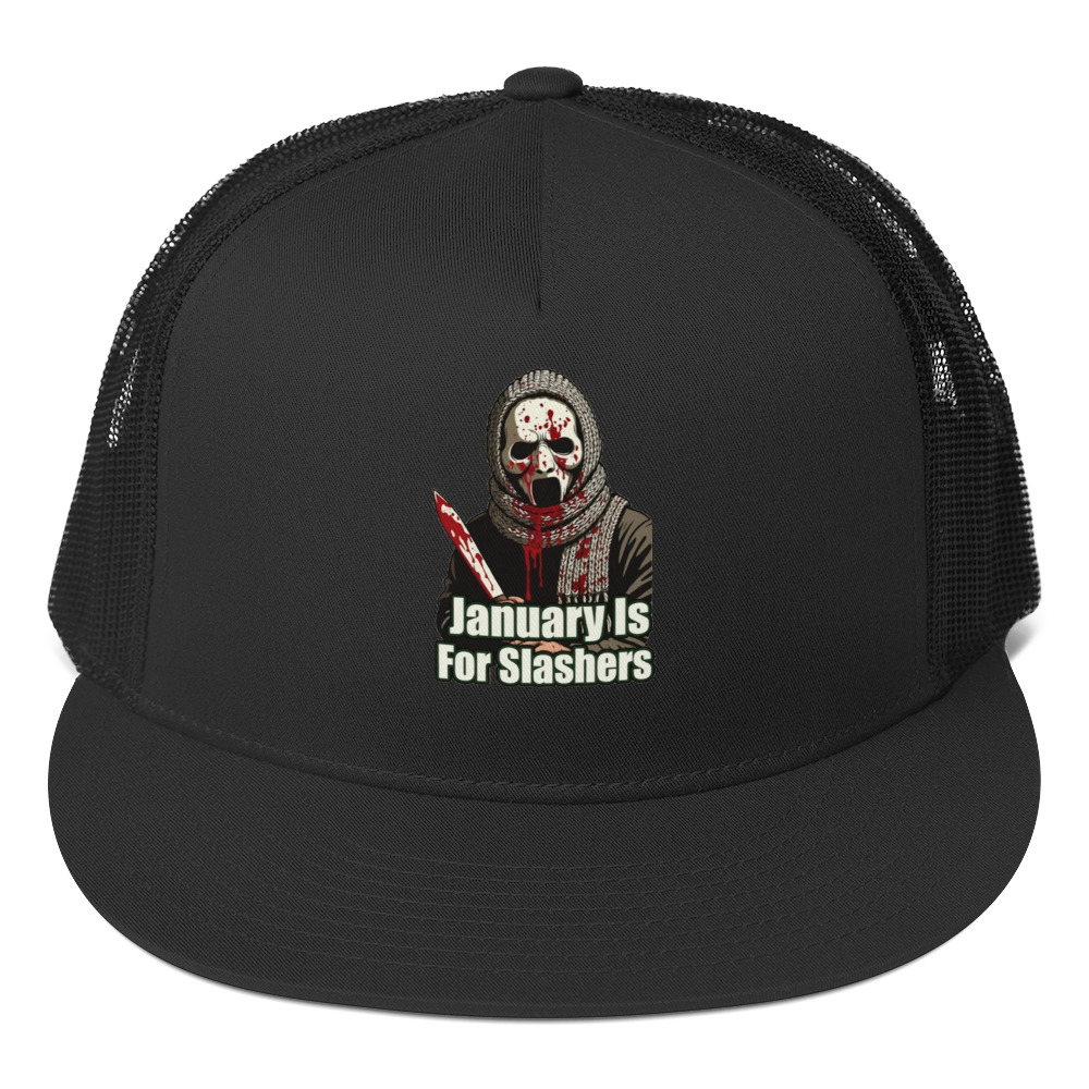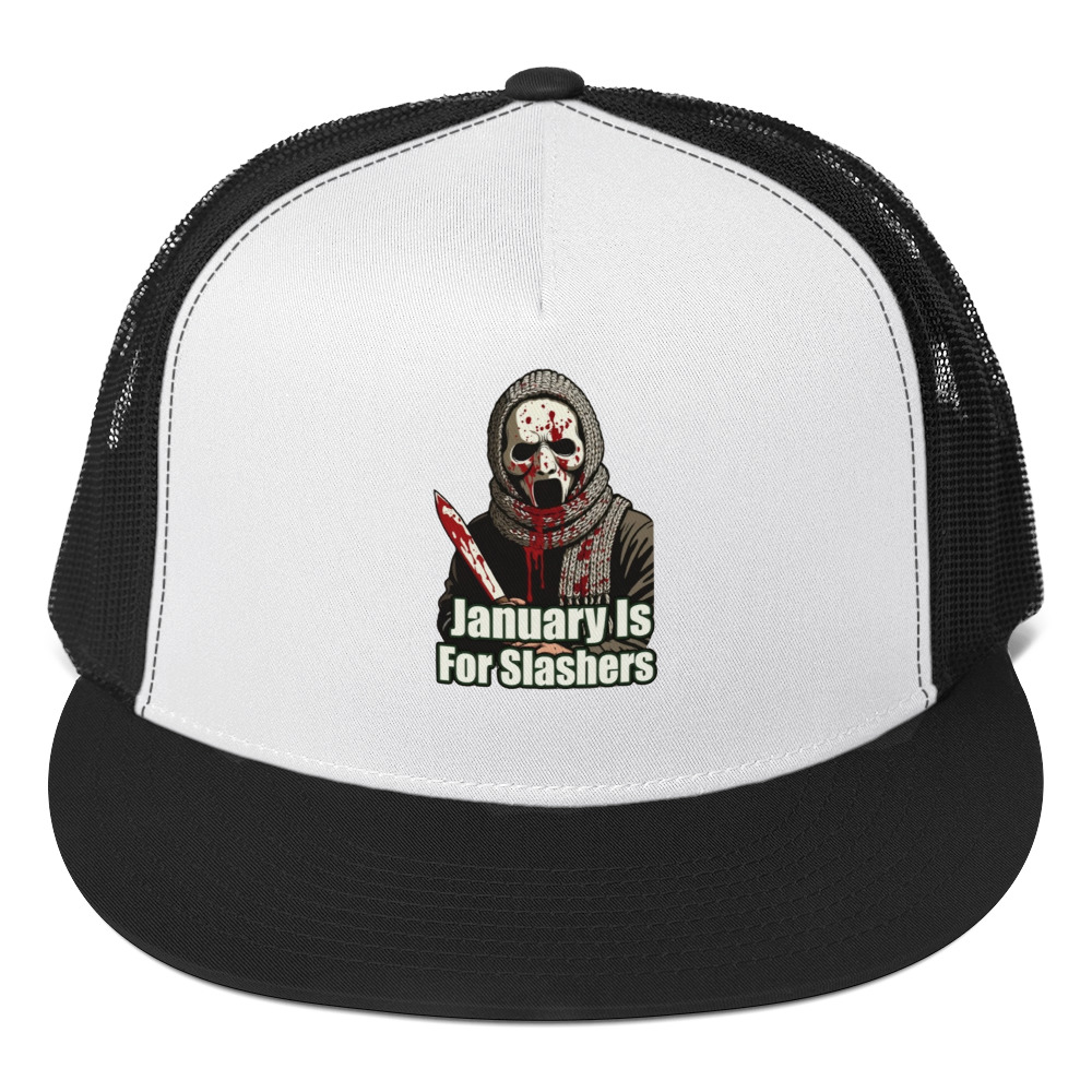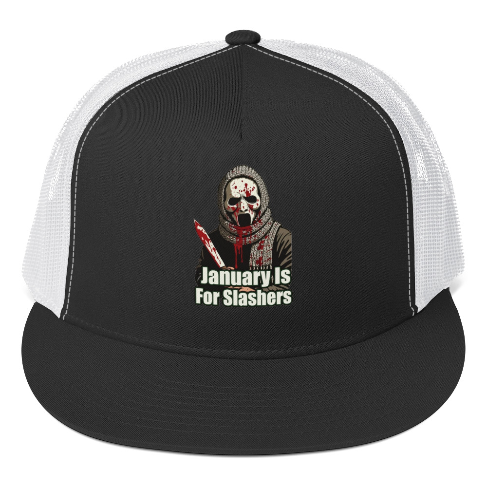 January Is For Slashers – A blood-splattered winter scarf wrapped around a masked slasher’s neck in bold grindhouse style.