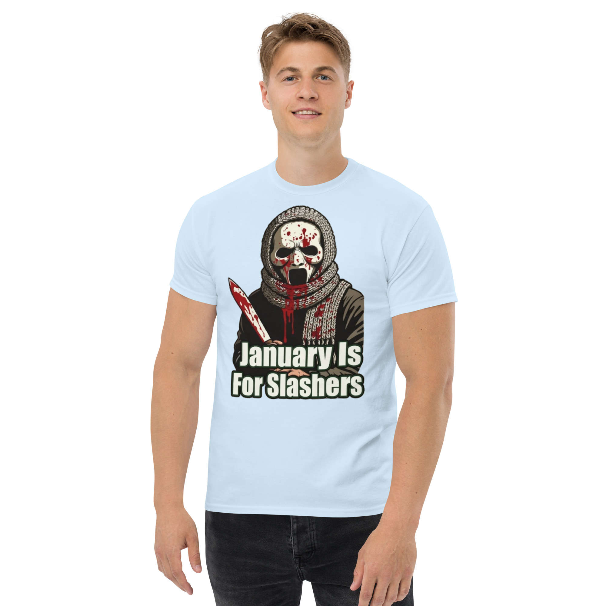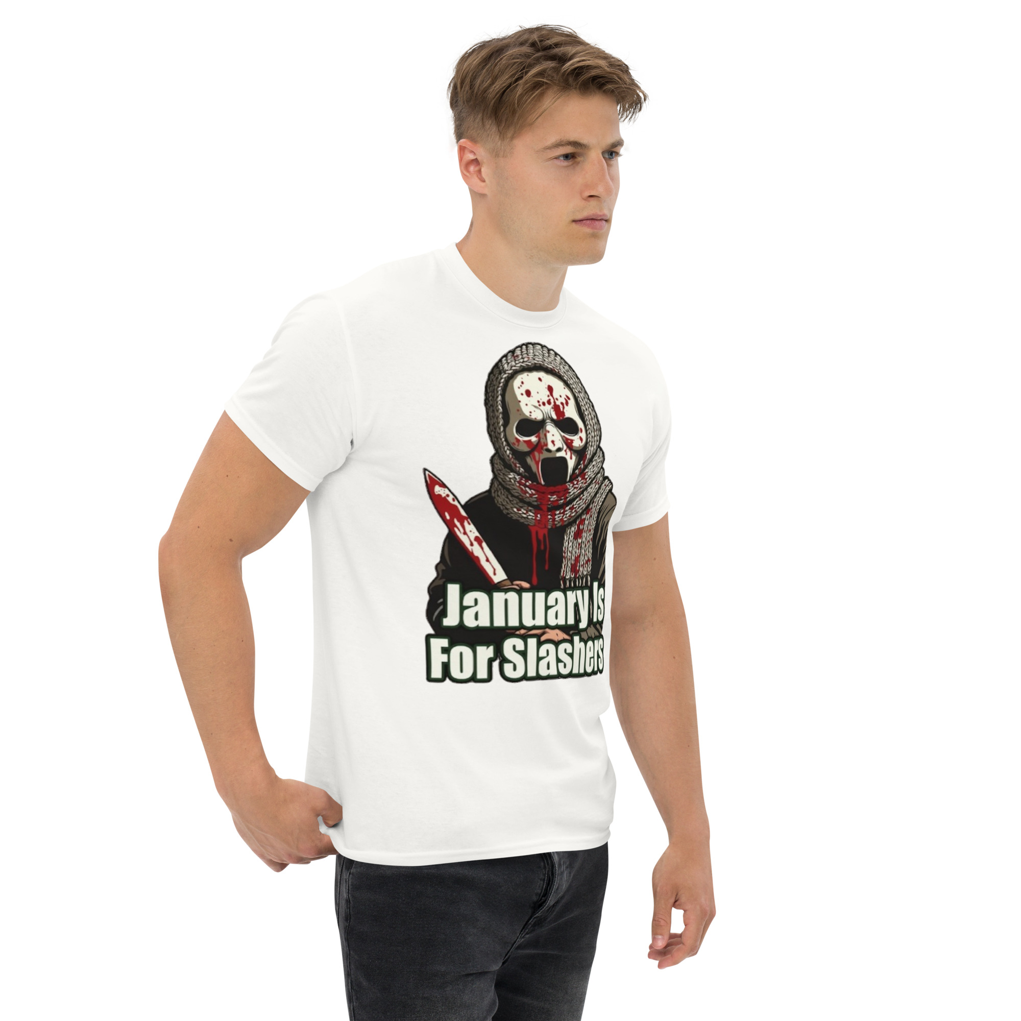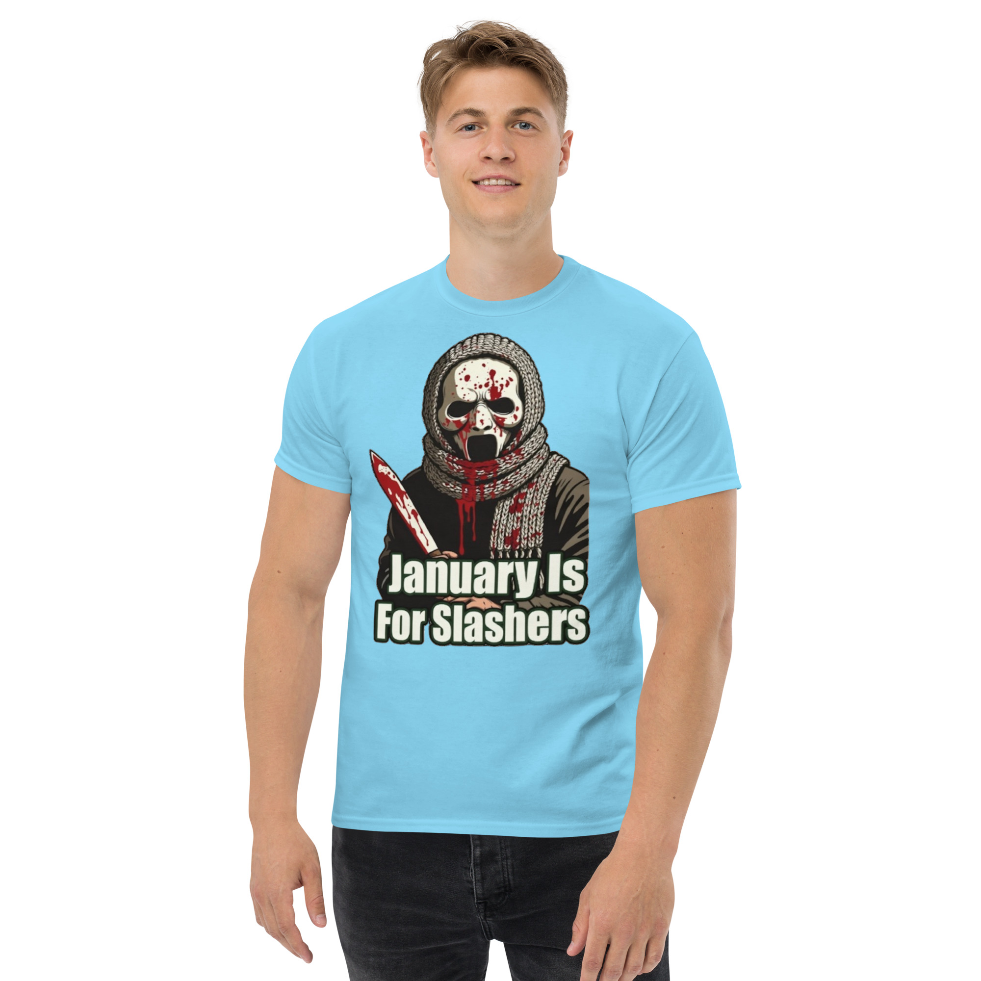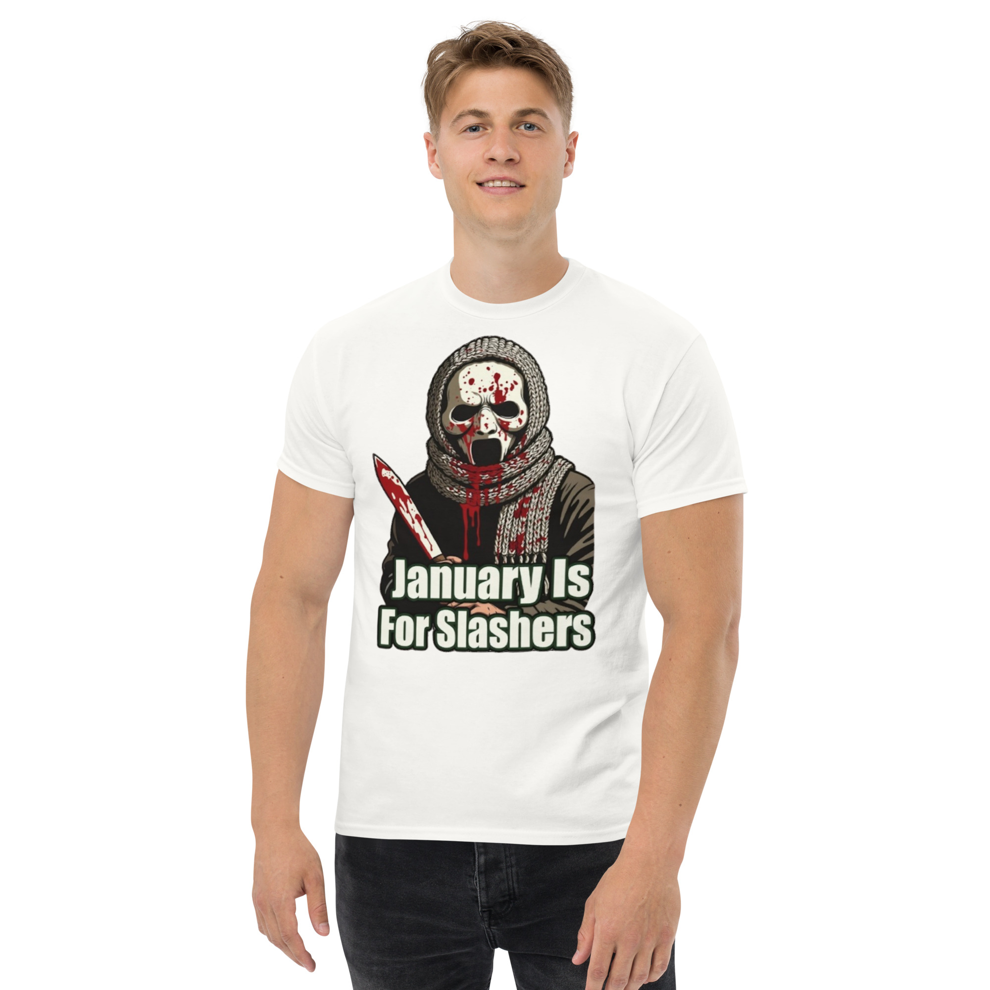 January Is For Slashers – A blood-splattered winter scarf wrapped around a masked slasher’s neck in bold grindhouse style.