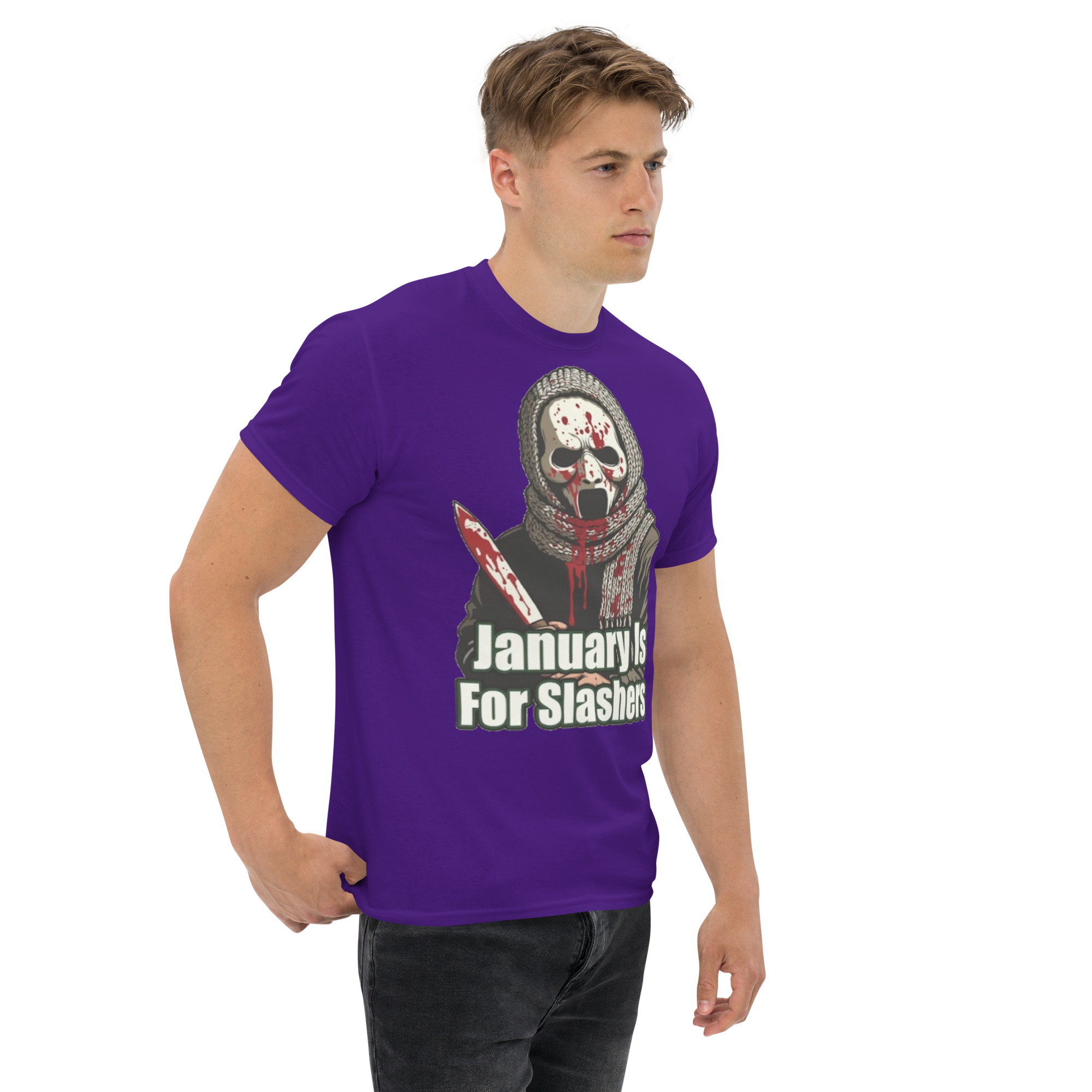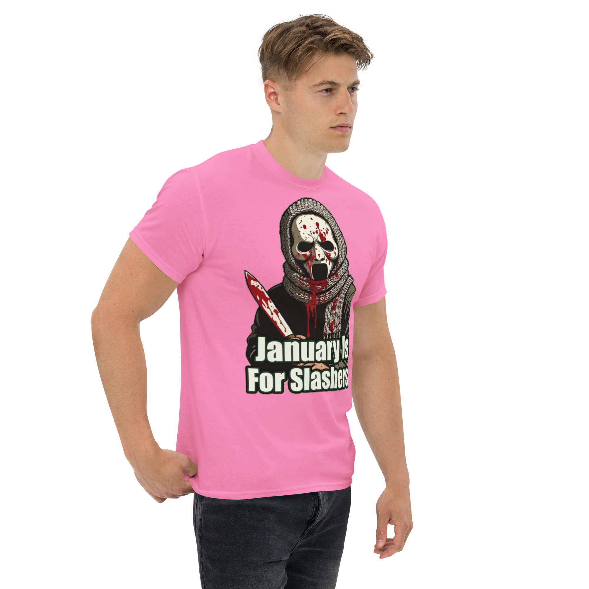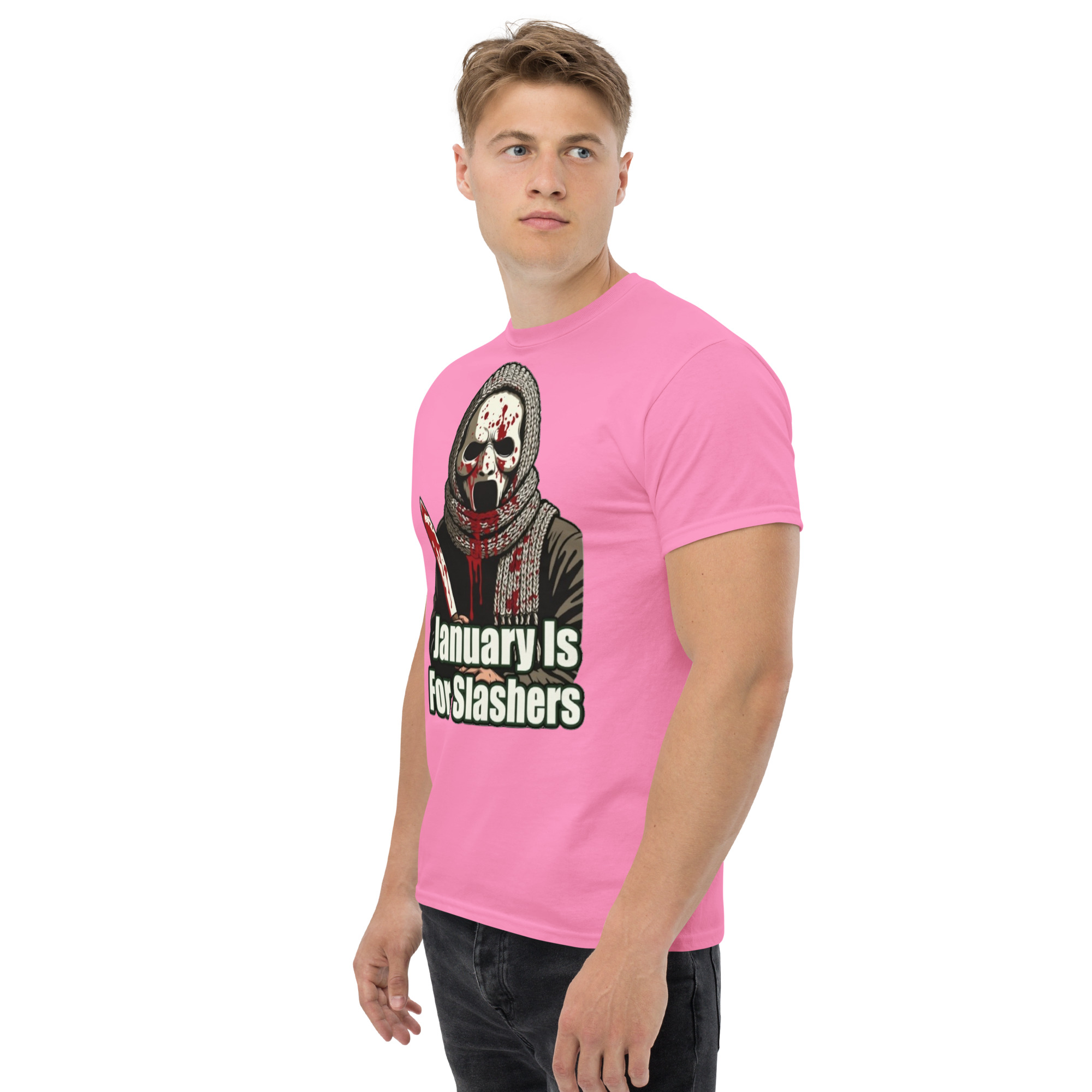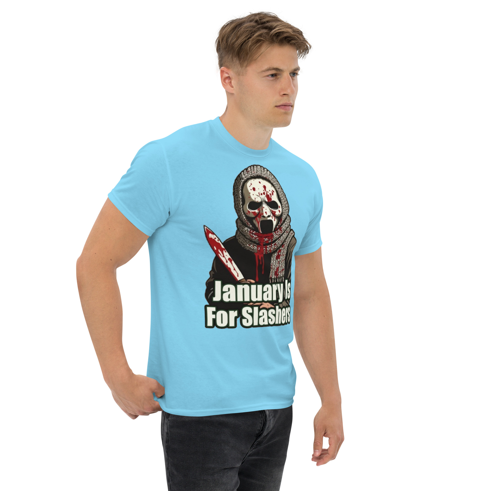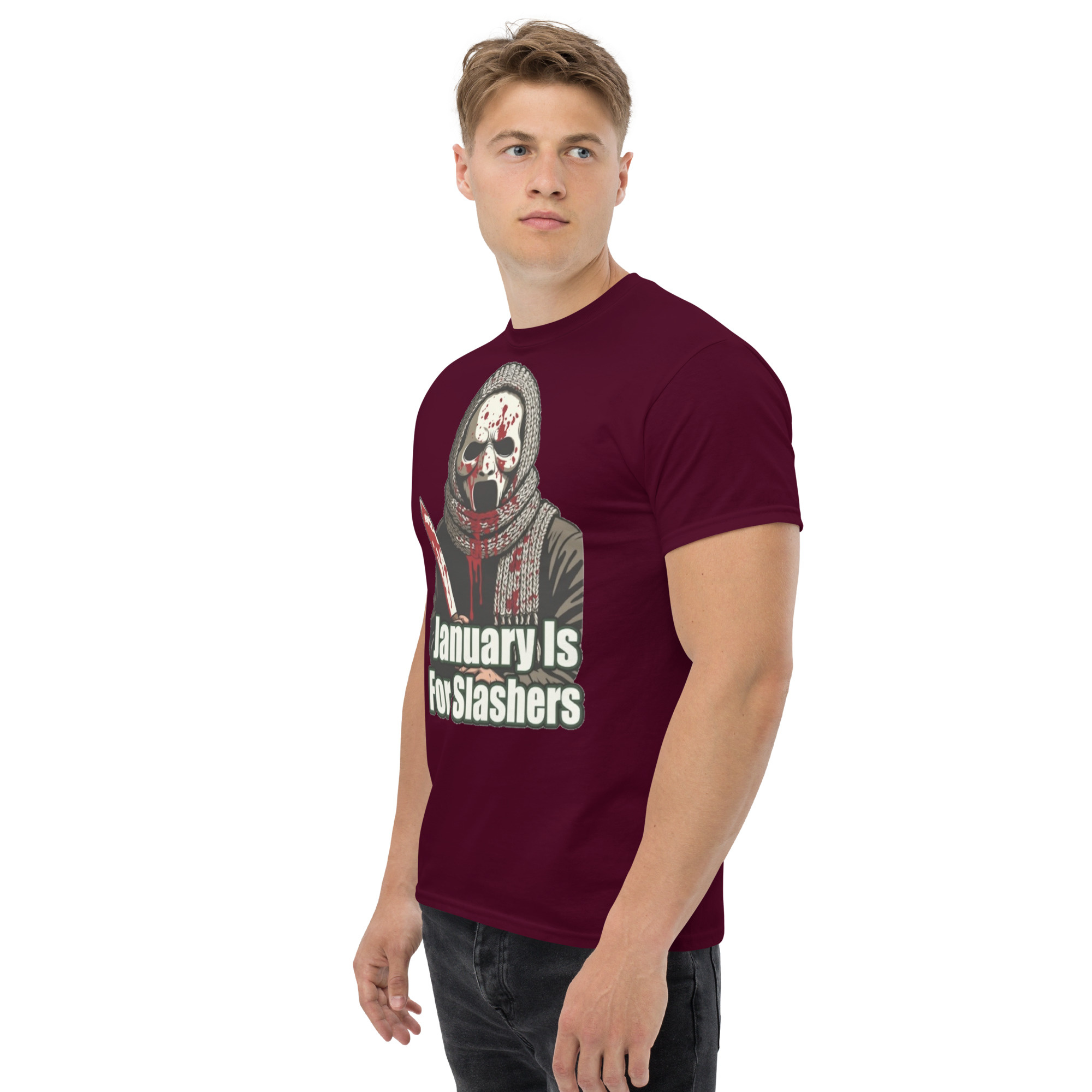 January Is For Slashers – A blood-splattered winter scarf wrapped around a masked slasher’s neck in bold grindhouse style.