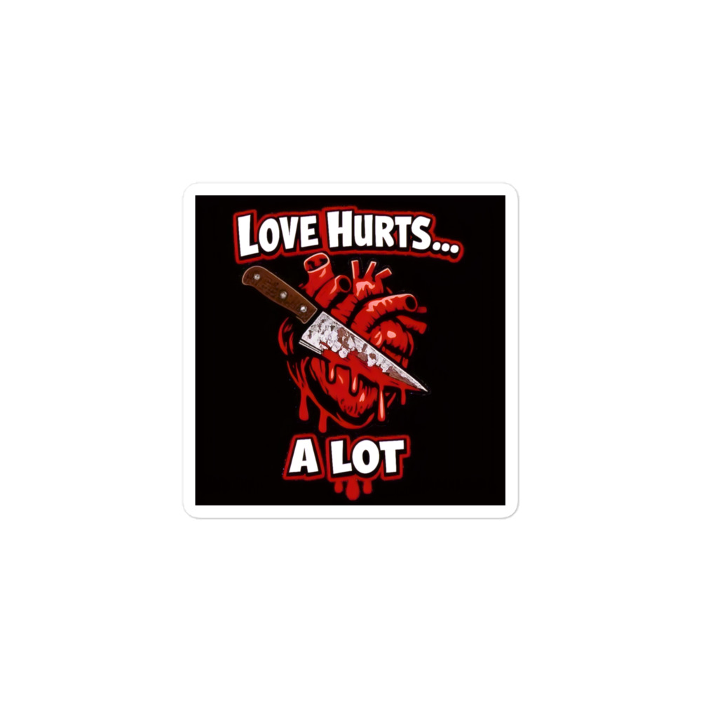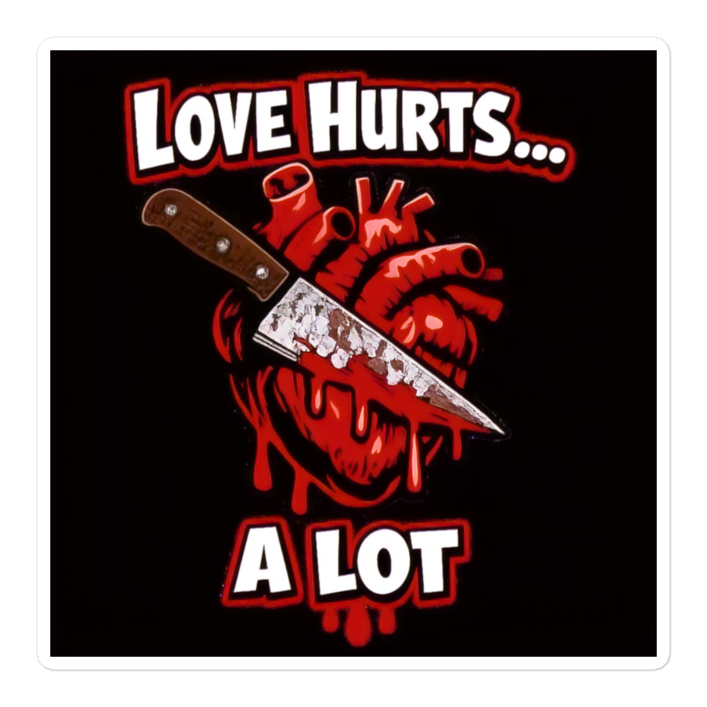 Love Hurts… A Lot – A dark gothic illustration of a bleeding anatomical heart pierced by a knife with the words “Love Hurts… A Lot,” symbolizing painful, twisted romance.