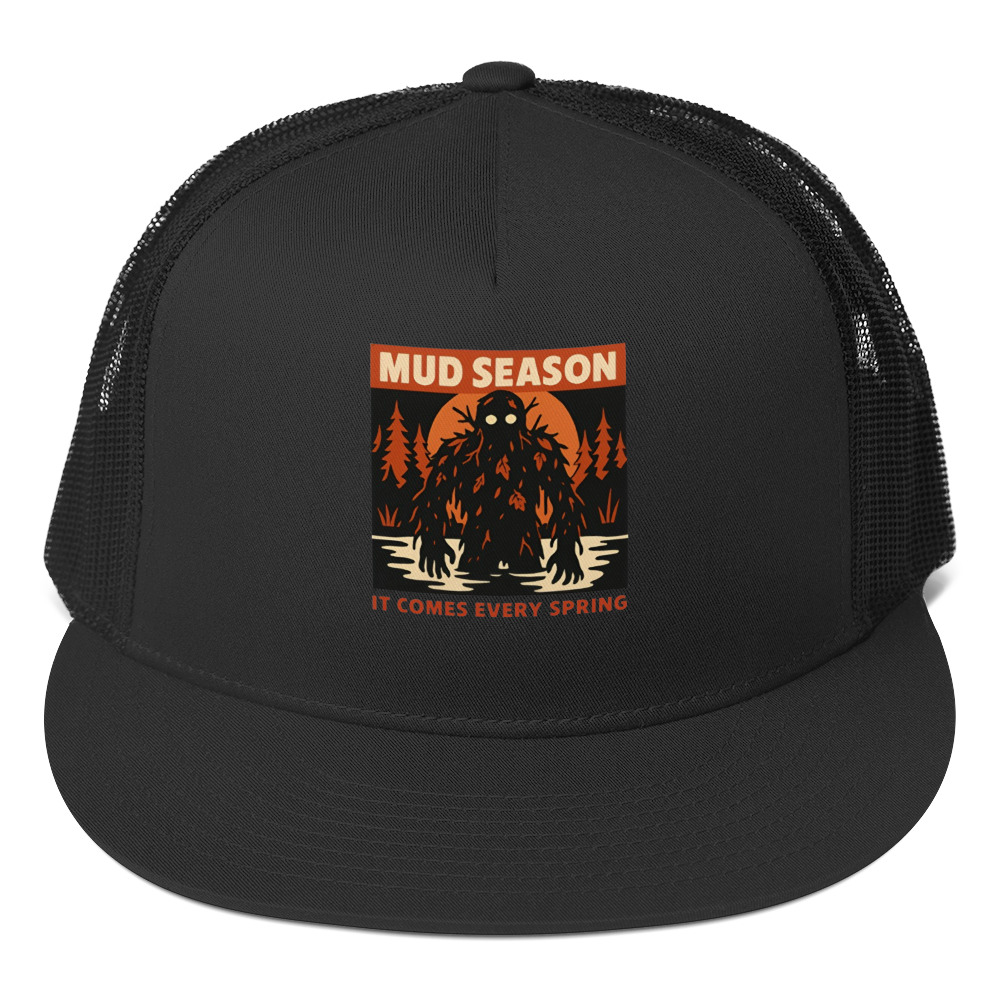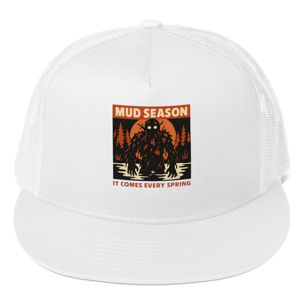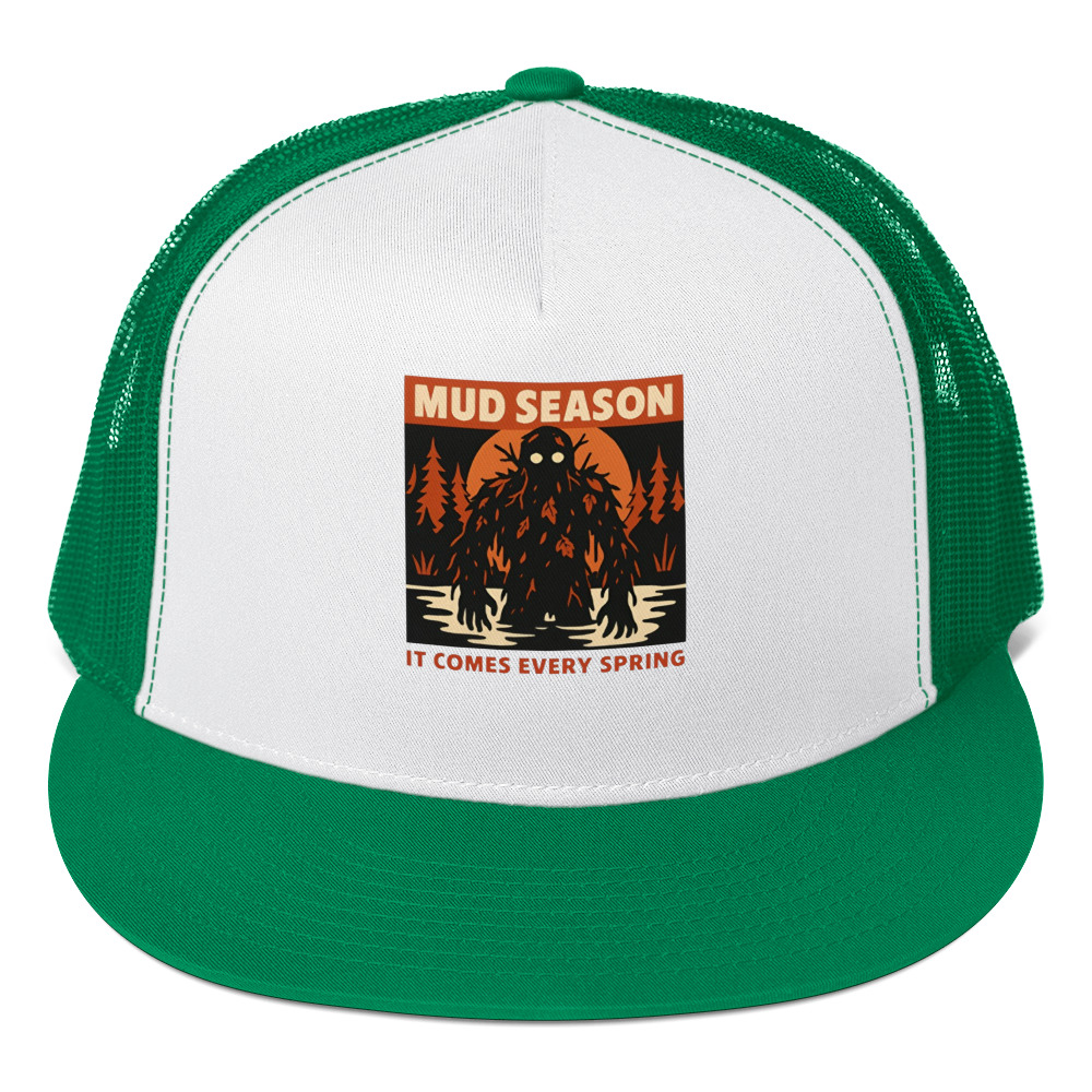 Mud Season: It Comes Every Spring – A towering swamp creature draped in dark mud, dead leaves, and twisted branches rises from a flooded river under a blood-orange moon, pale glowing eyes staring forward. Retro folk horror meets Canadian spring dread.