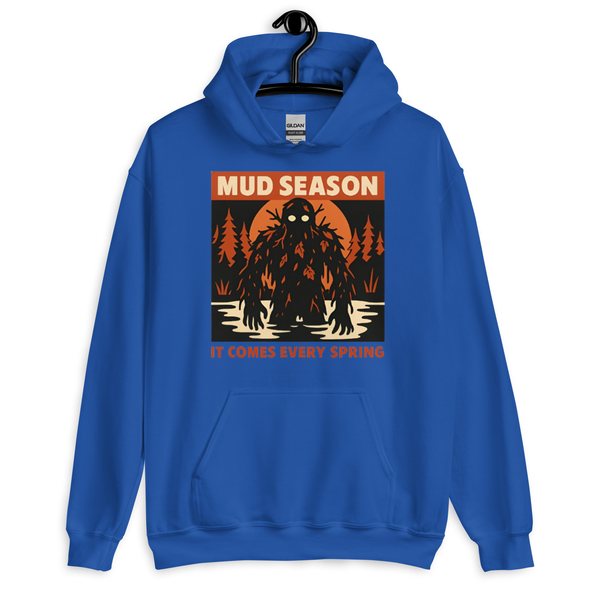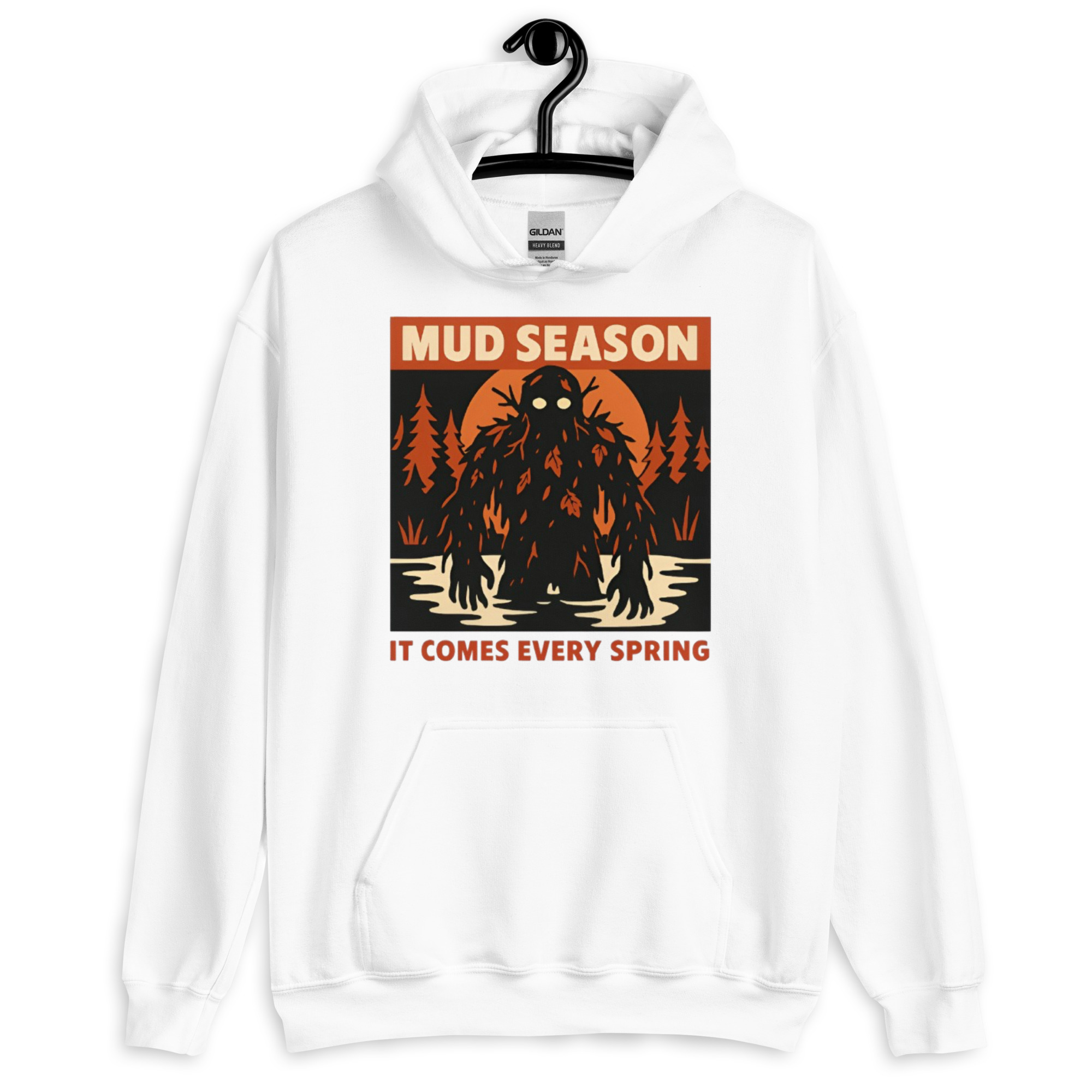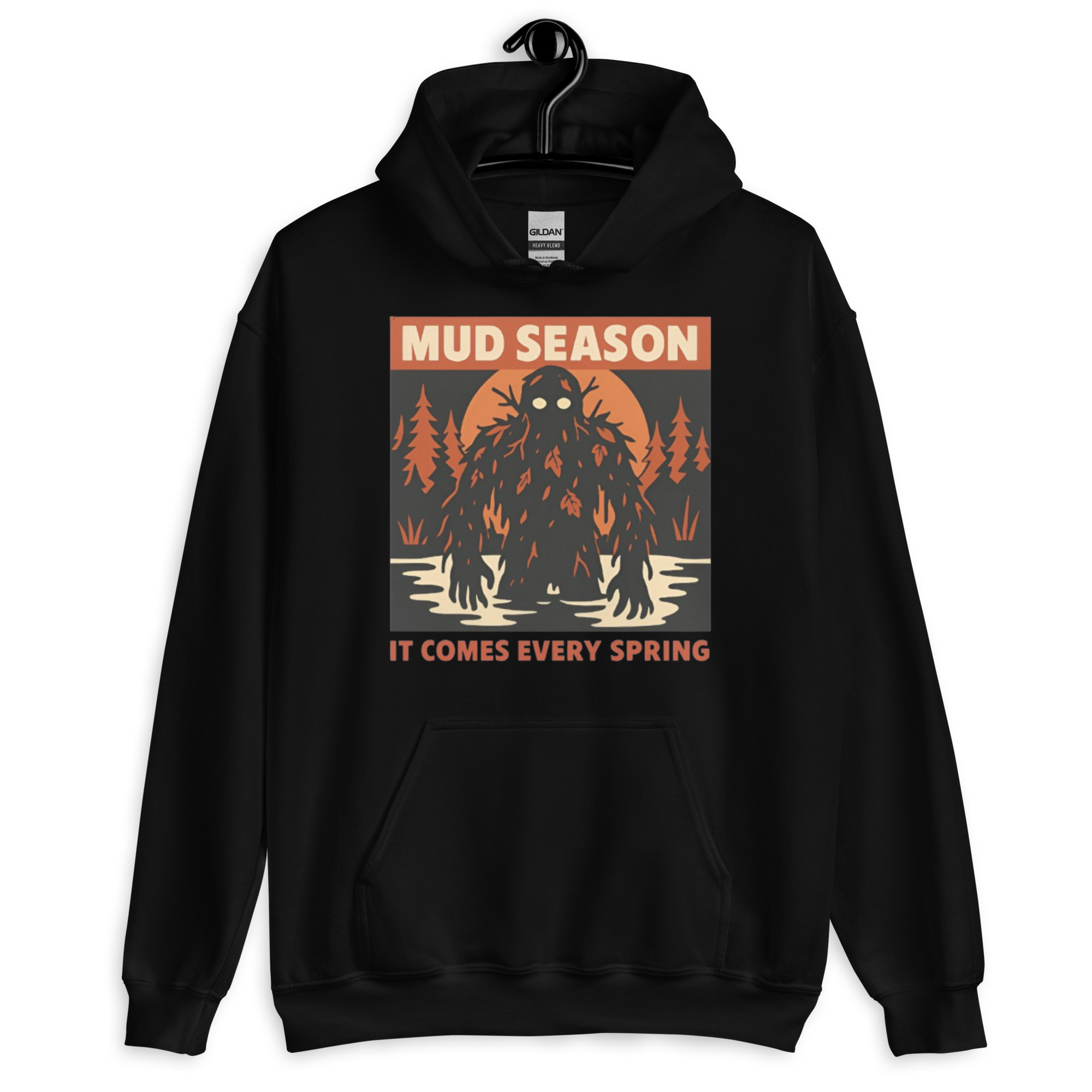Mud Season: It Comes Every Spring – A towering swamp creature draped in dark mud, dead leaves, and twisted branches rises from a flooded river under a blood-orange moon, pale glowing eyes staring forward. Retro folk horror meets Canadian spring dread.