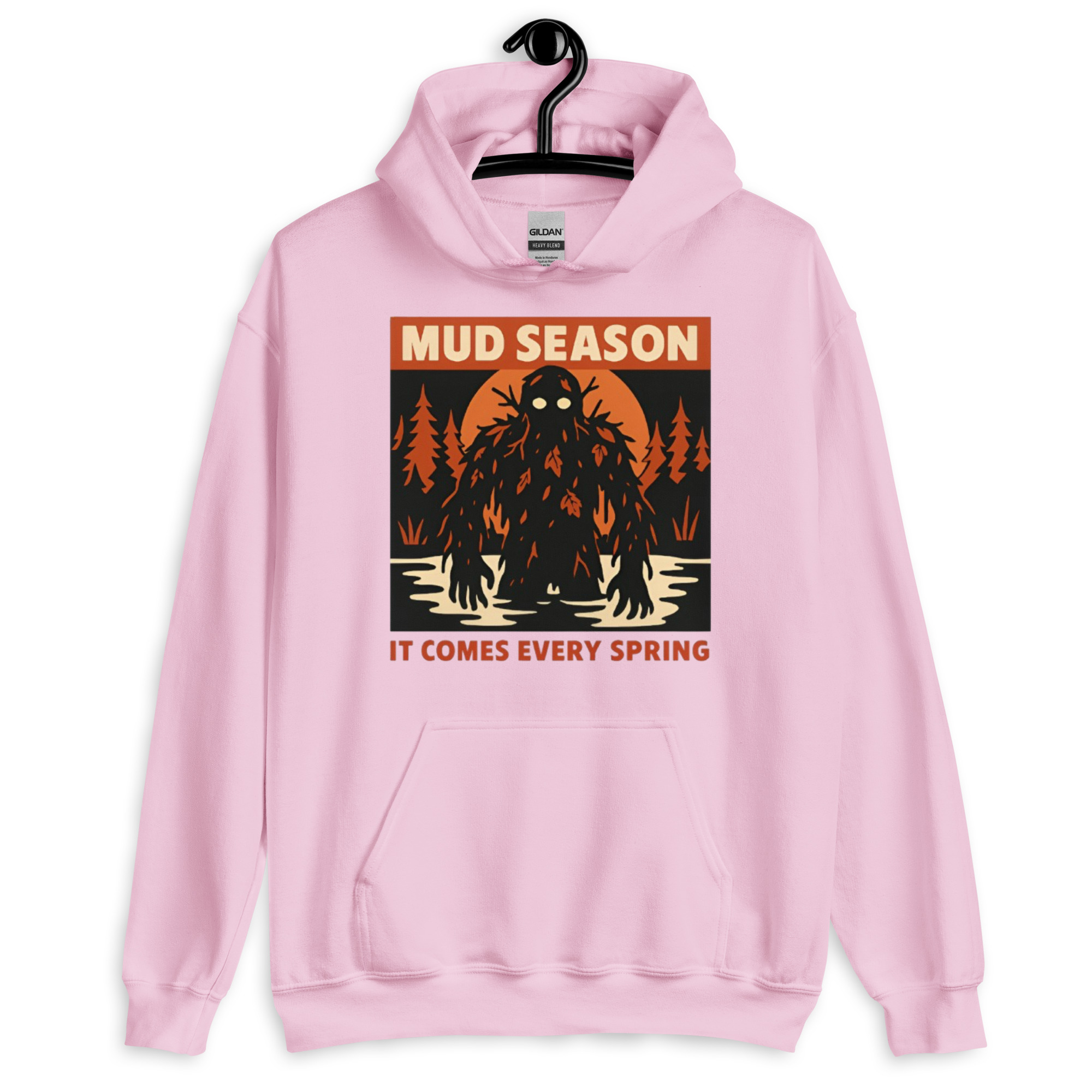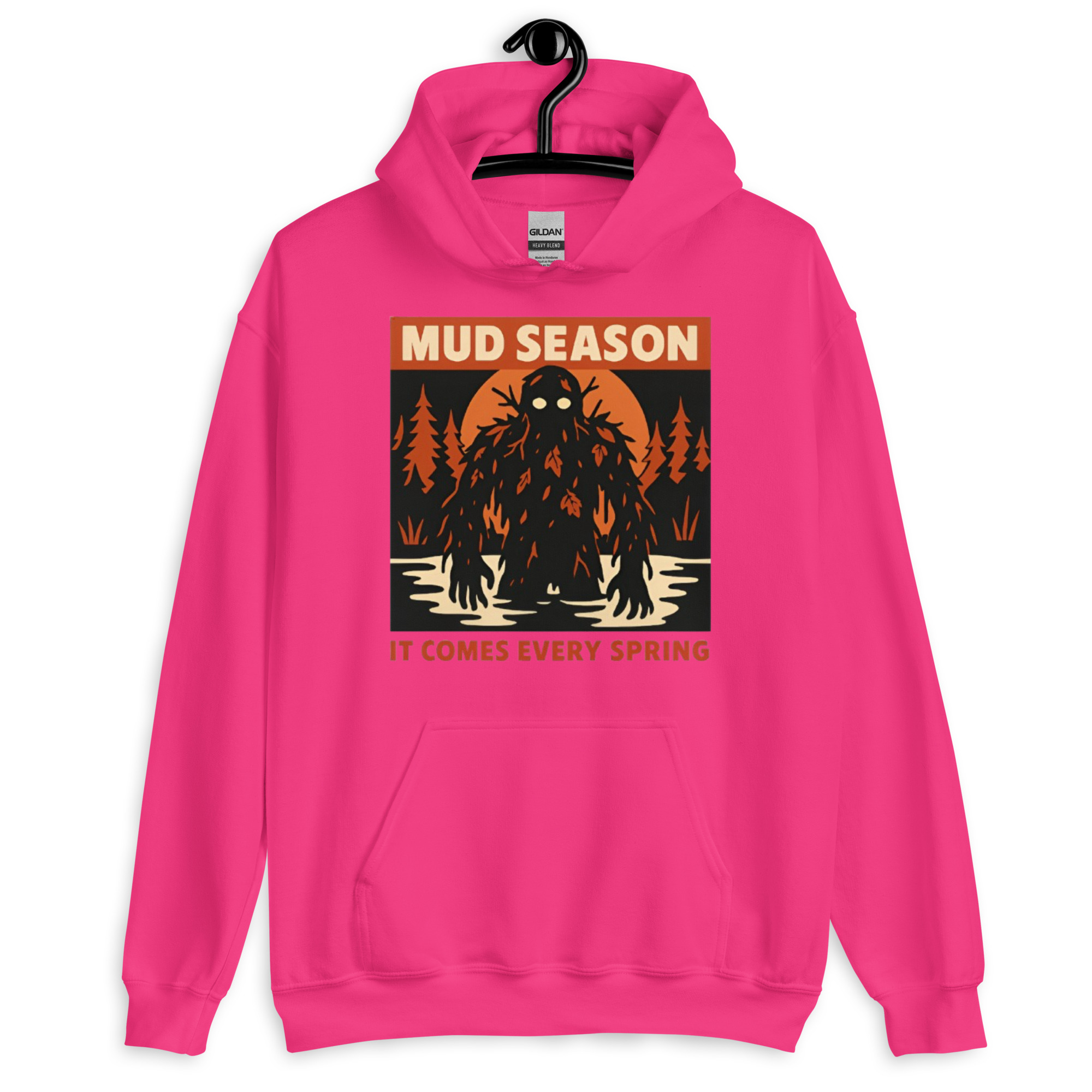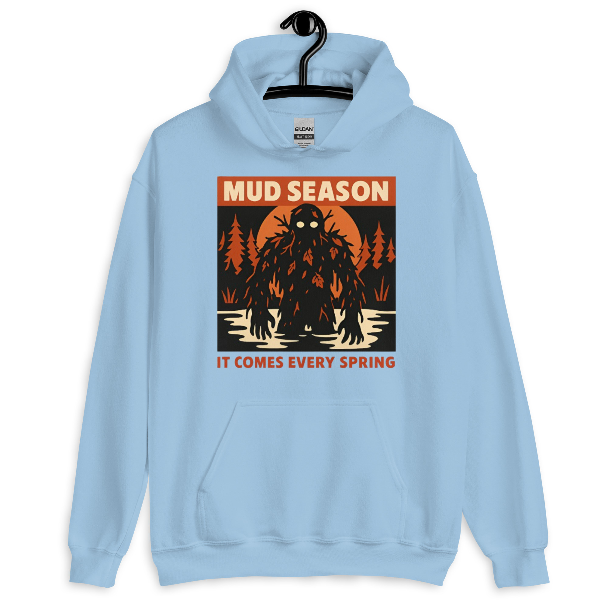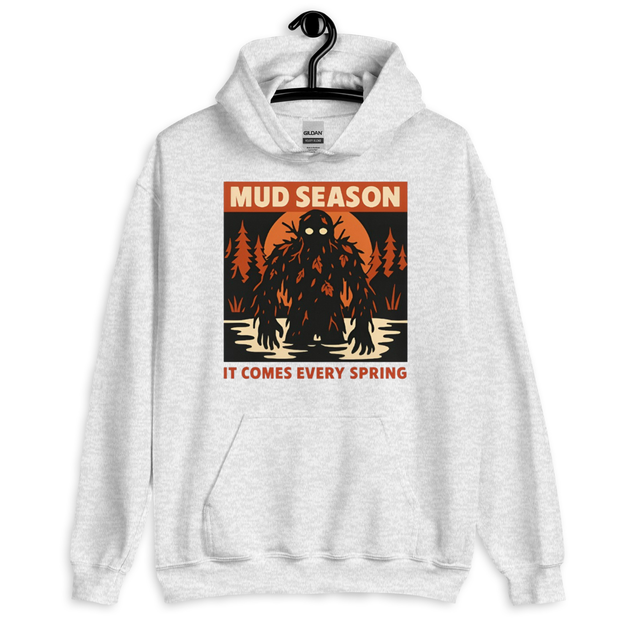 Mud Season: It Comes Every Spring – A towering swamp creature draped in dark mud, dead leaves, and twisted branches rises from a flooded river under a blood-orange moon, pale glowing eyes staring forward. Retro folk horror meets Canadian spring dread.