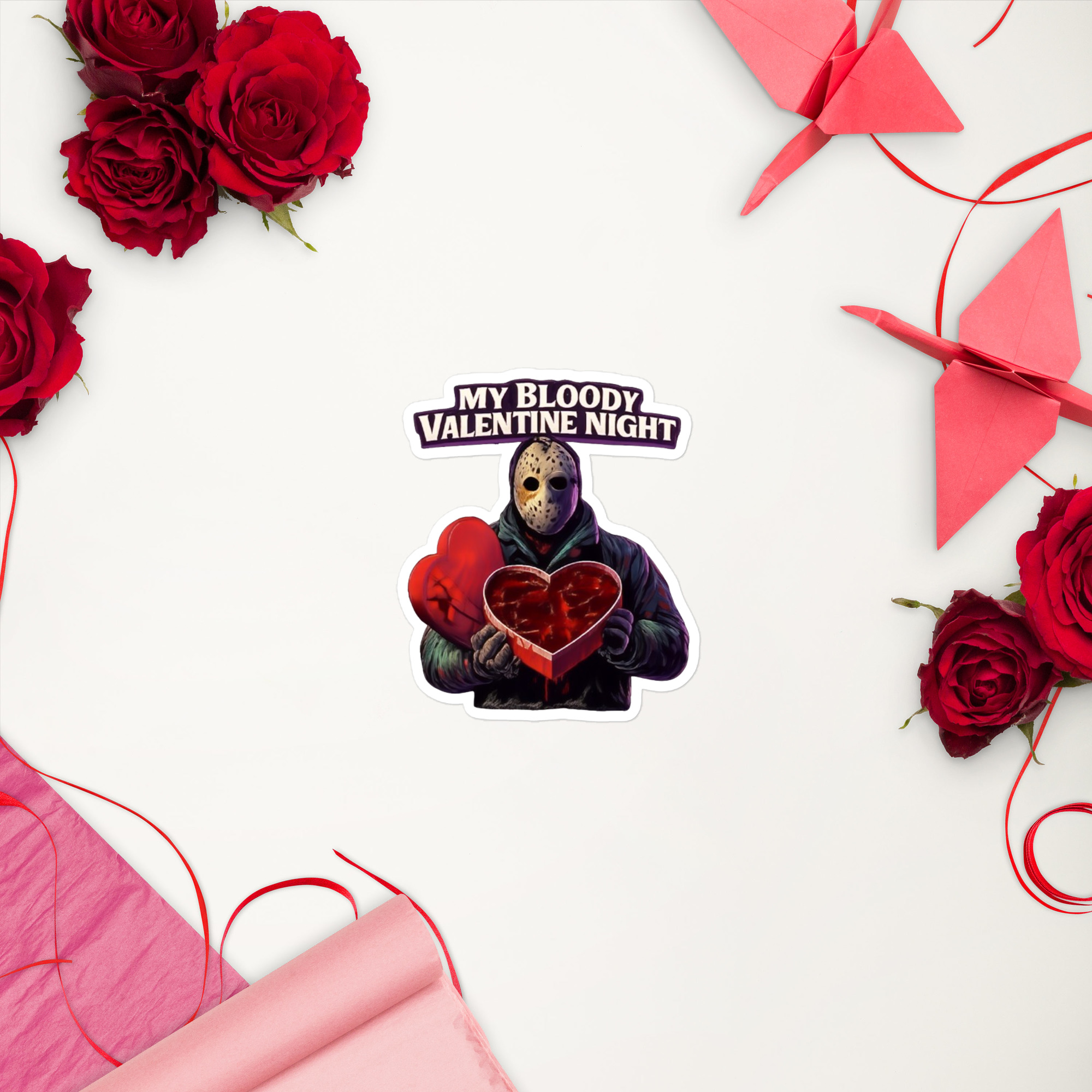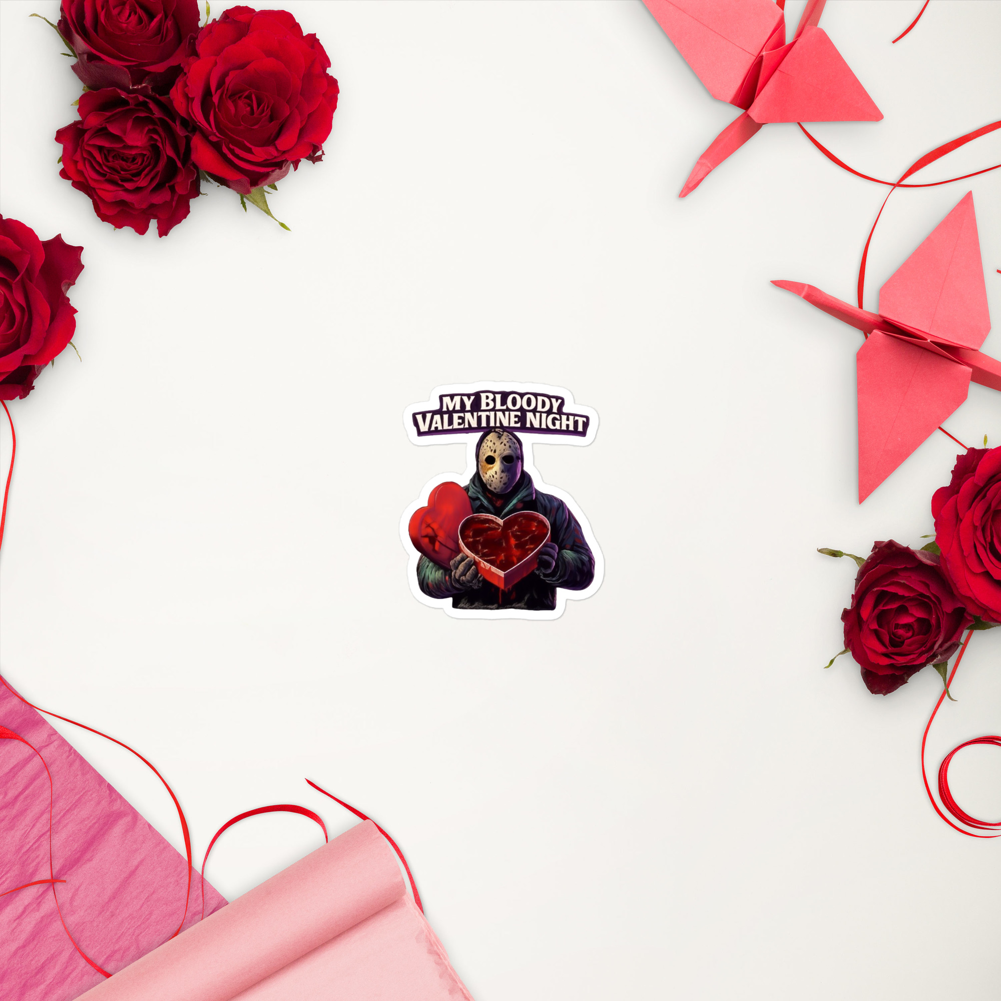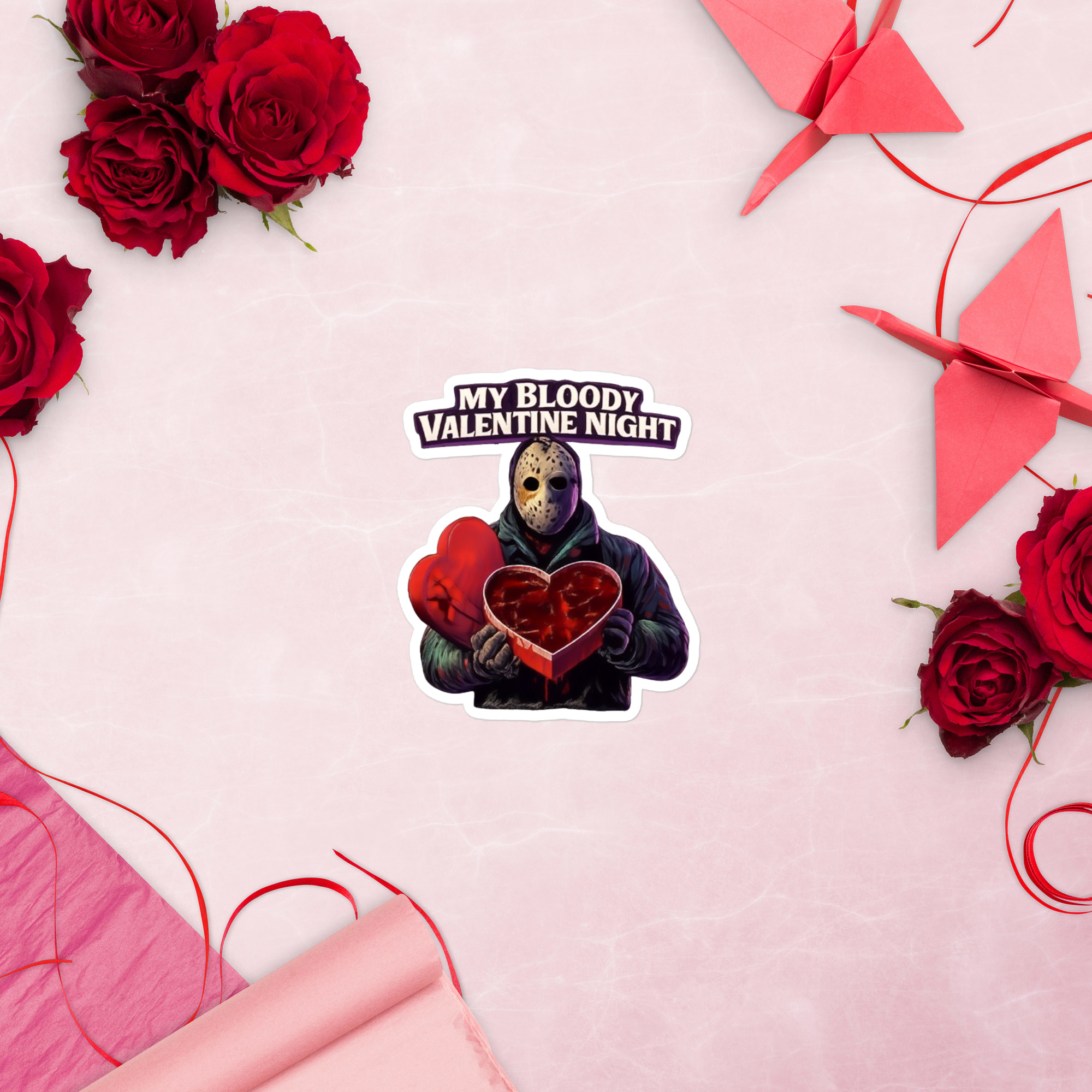 MY BLOODY VALENTINE NIGHT — A masked slasher stands beneath stark white lettering, holding an open, heart-shaped Valentine candy box that’s been emptied in the worst way possible, turning romance into menace.