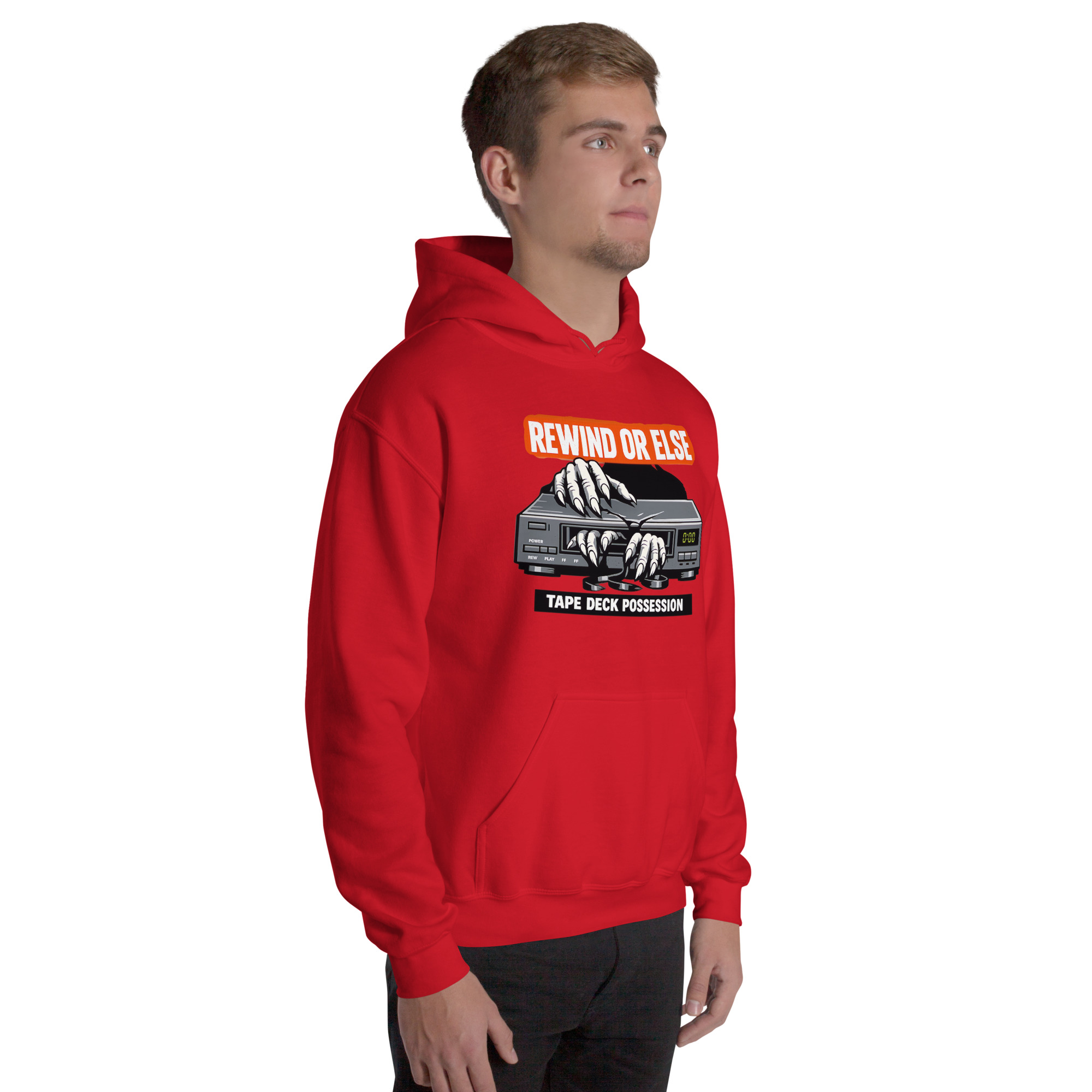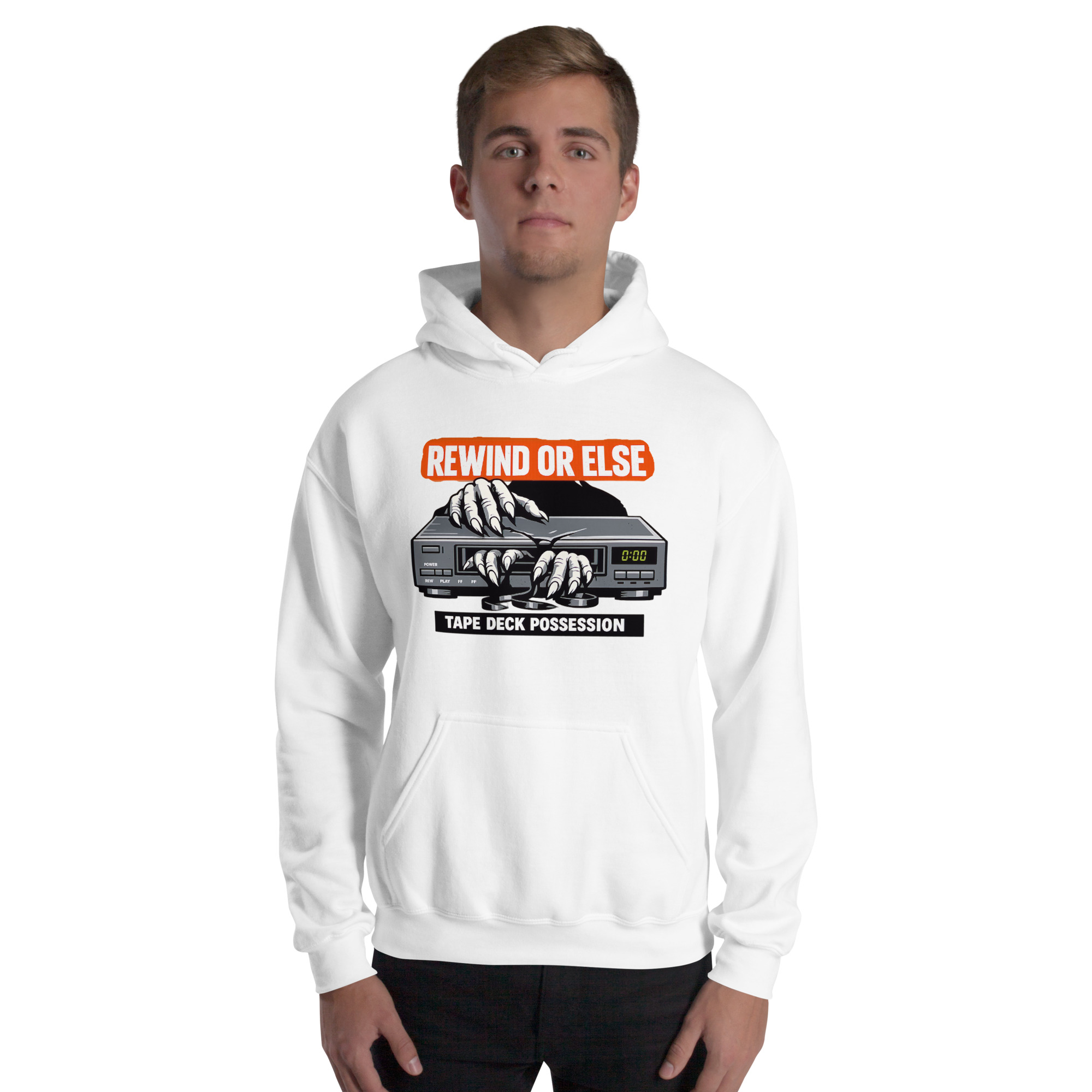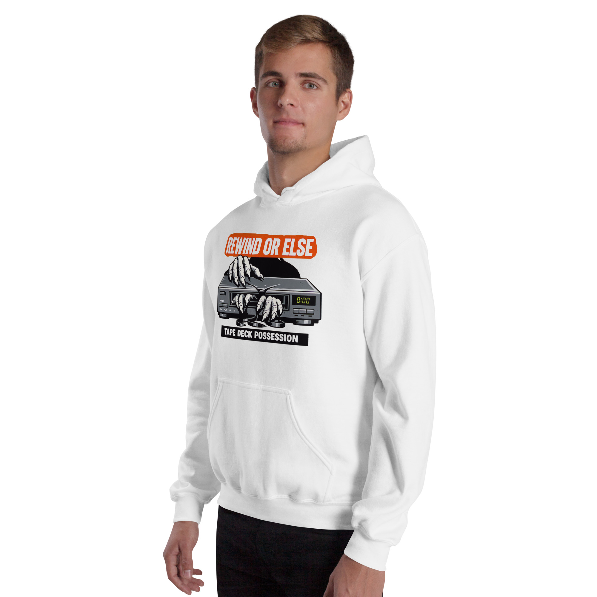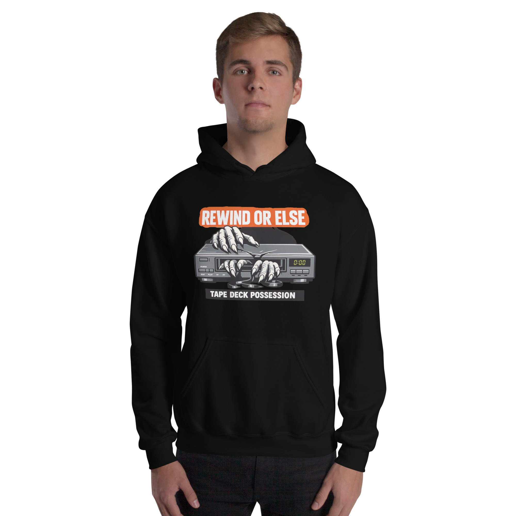 REWIND OR ELSE: Tape Deck Possession – A possessed VCR devours reaching hands through its tape slot, warning that forgotten rewinds come with consequences.