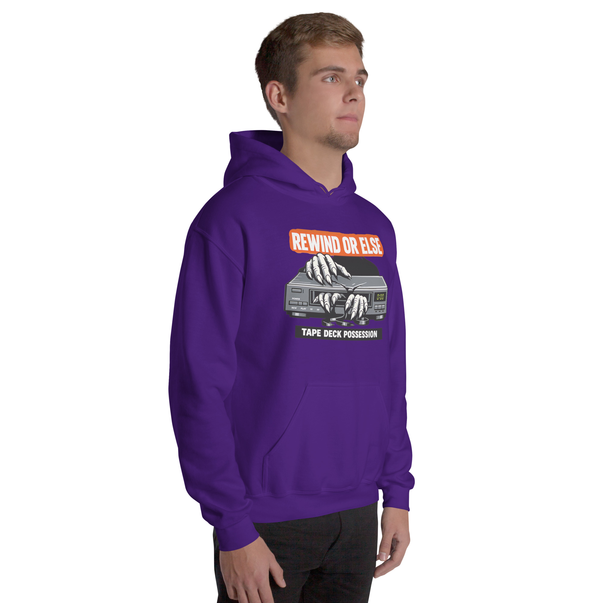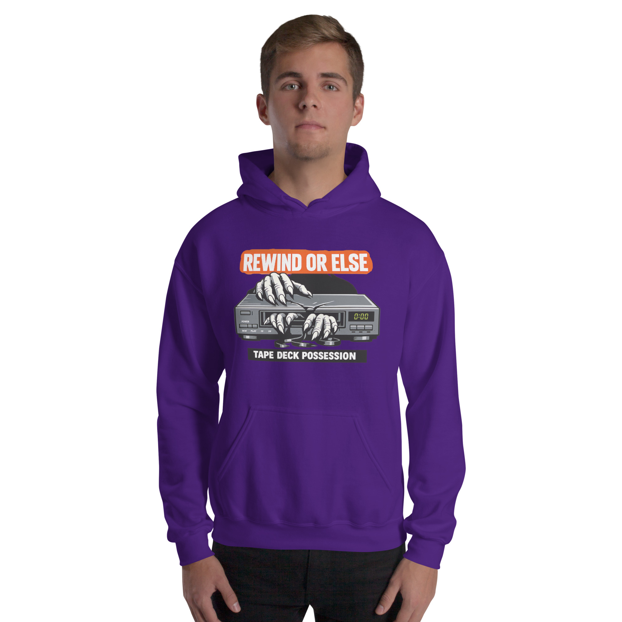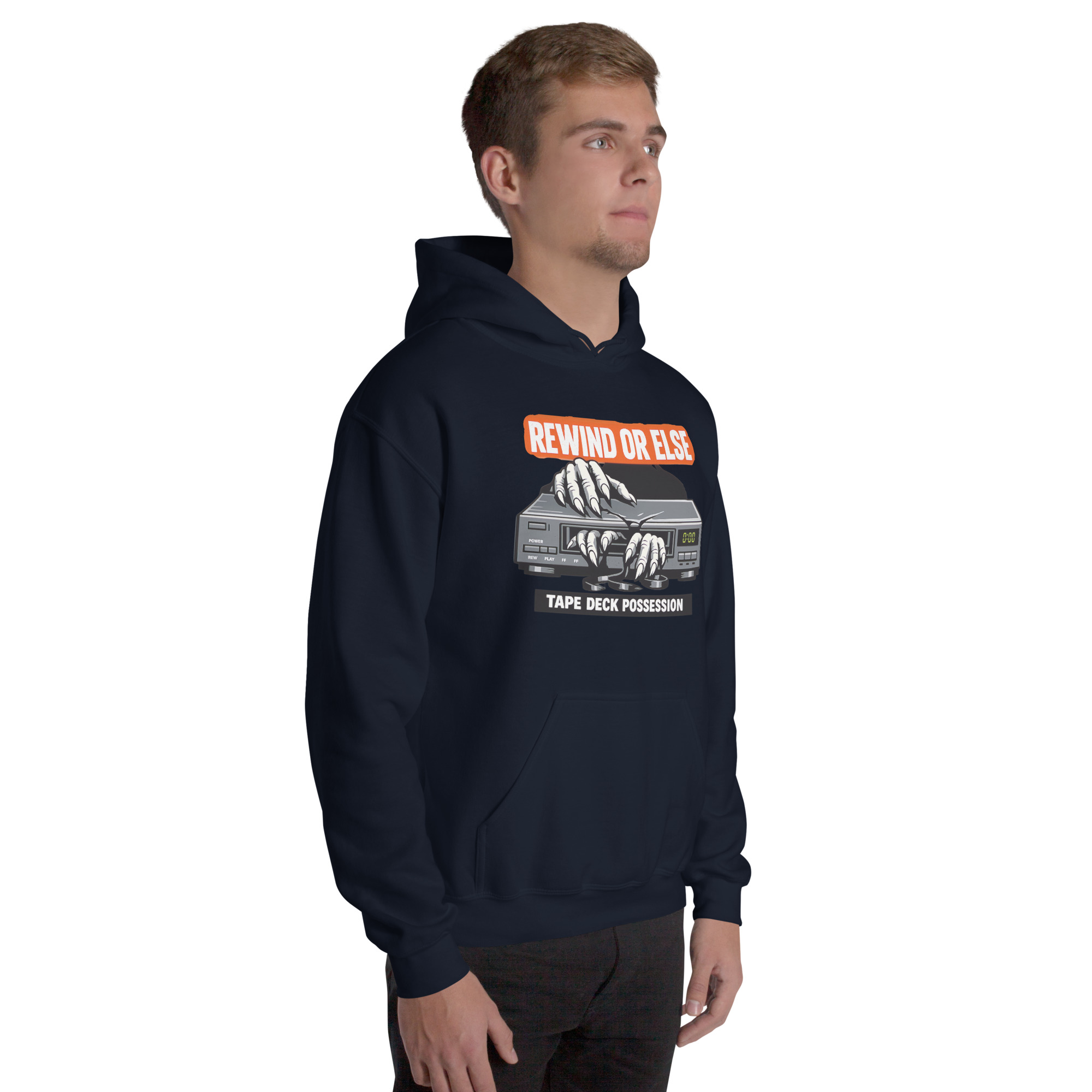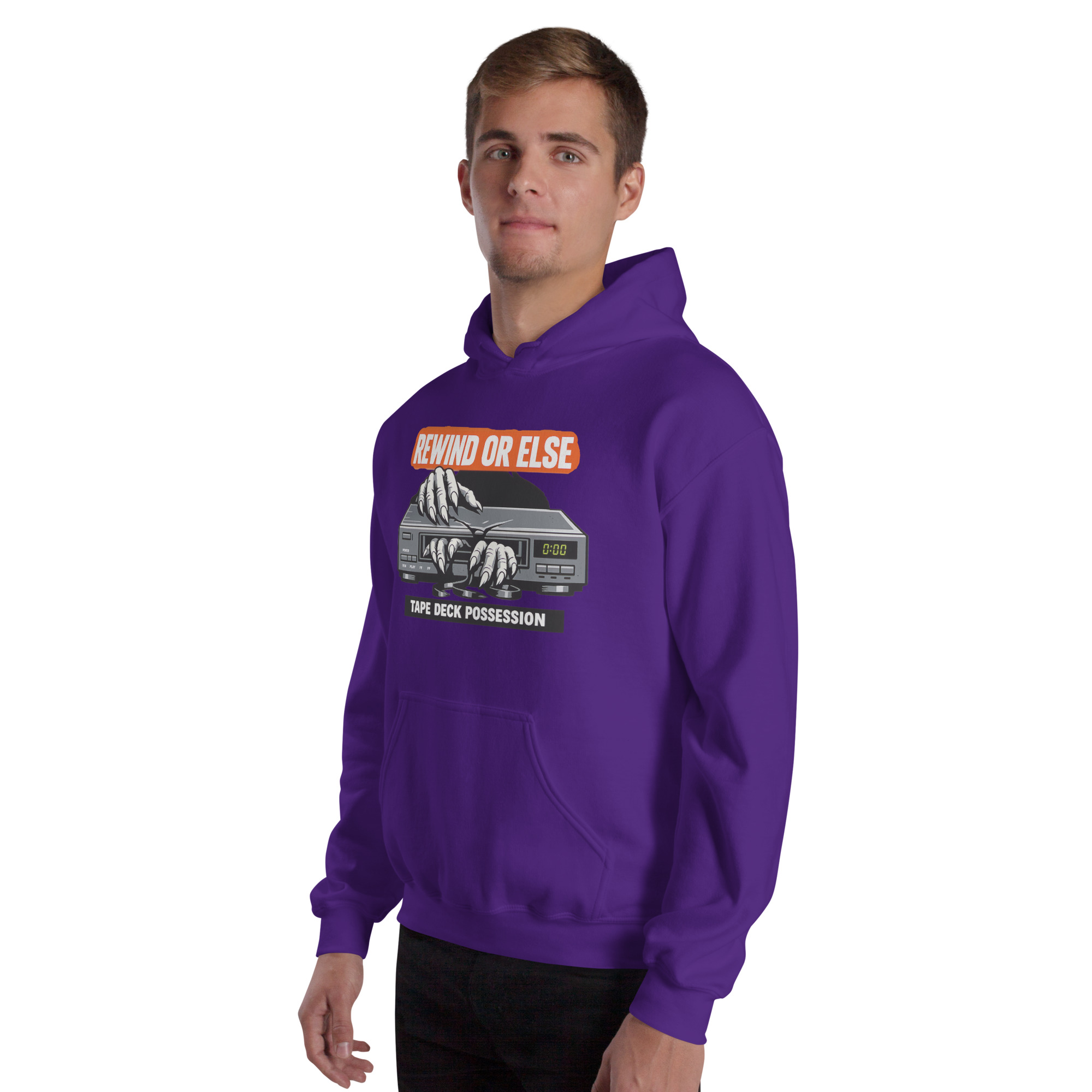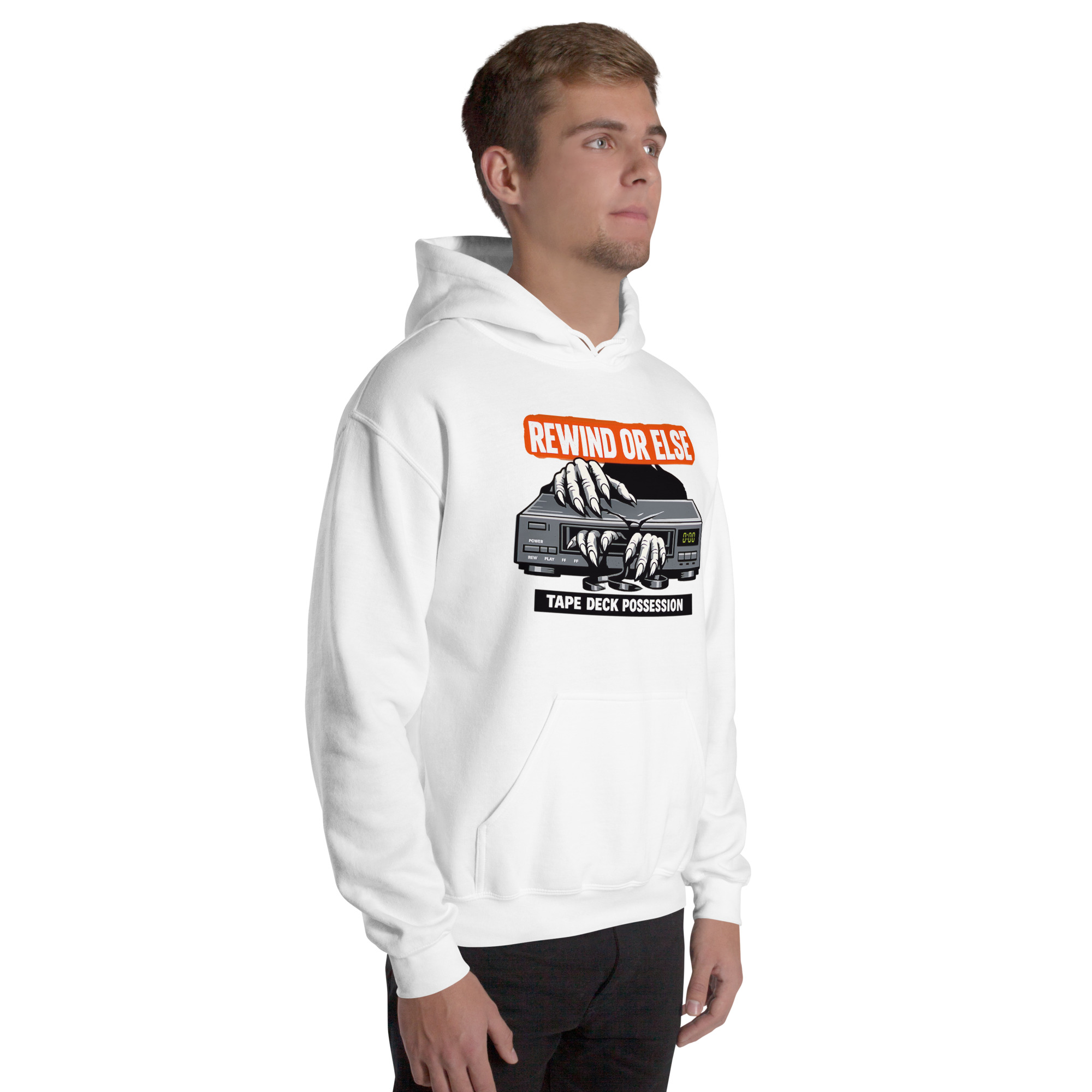 REWIND OR ELSE: Tape Deck Possession – A possessed VCR devours reaching hands through its tape slot, warning that forgotten rewinds come with consequences.