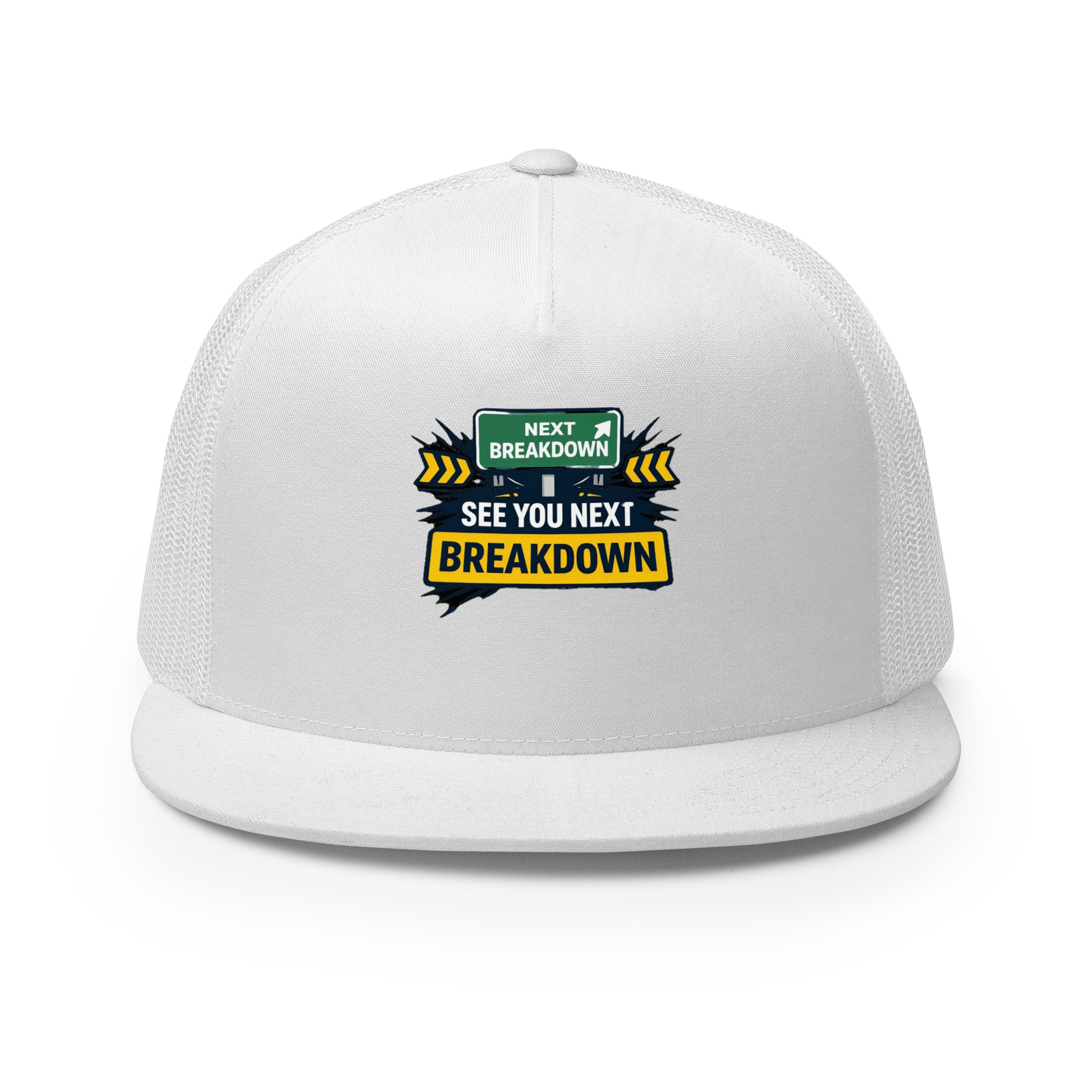 SEE YOU NEXT BREAKDOWN: The Cycle Continues — A cracked roadside wardning sign standing alone on a frozen highway at night, its message mocking endless burnout and late-night drives with quiet, unsettling dread.