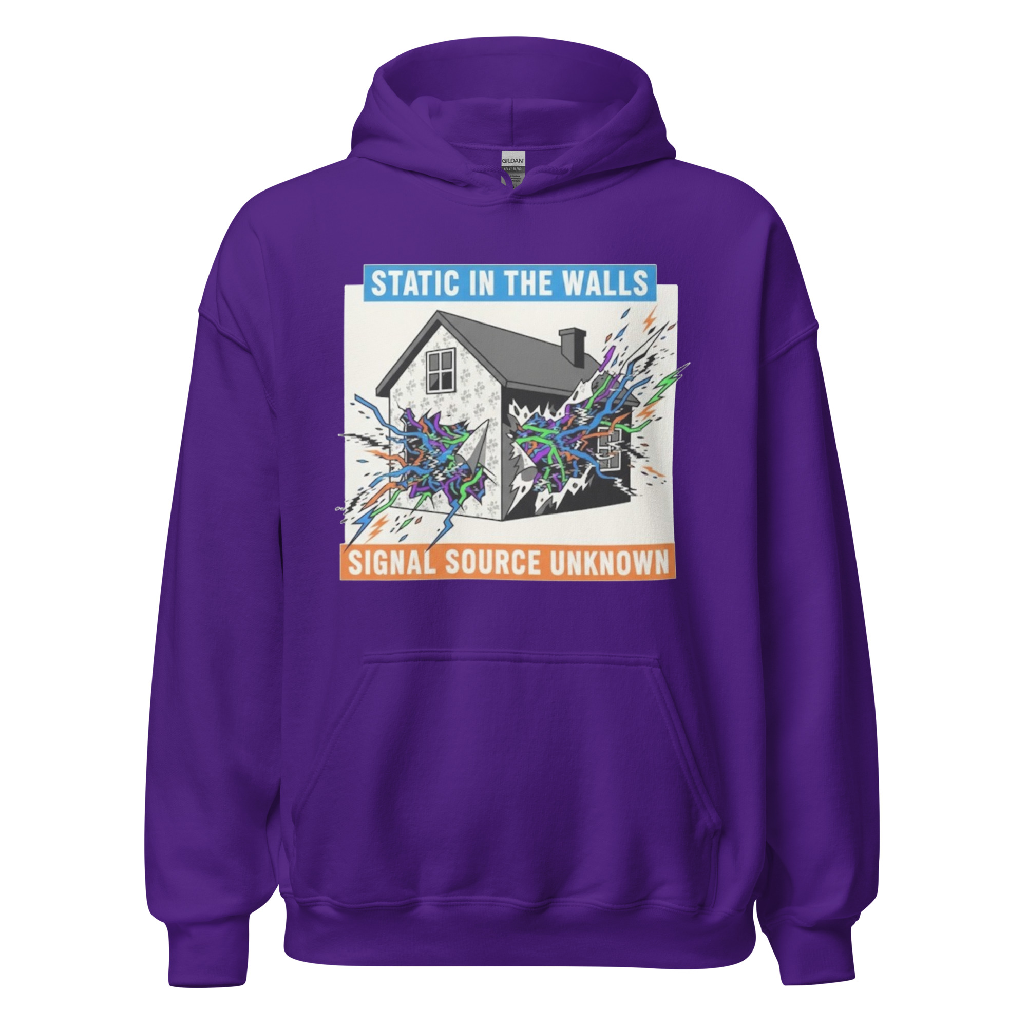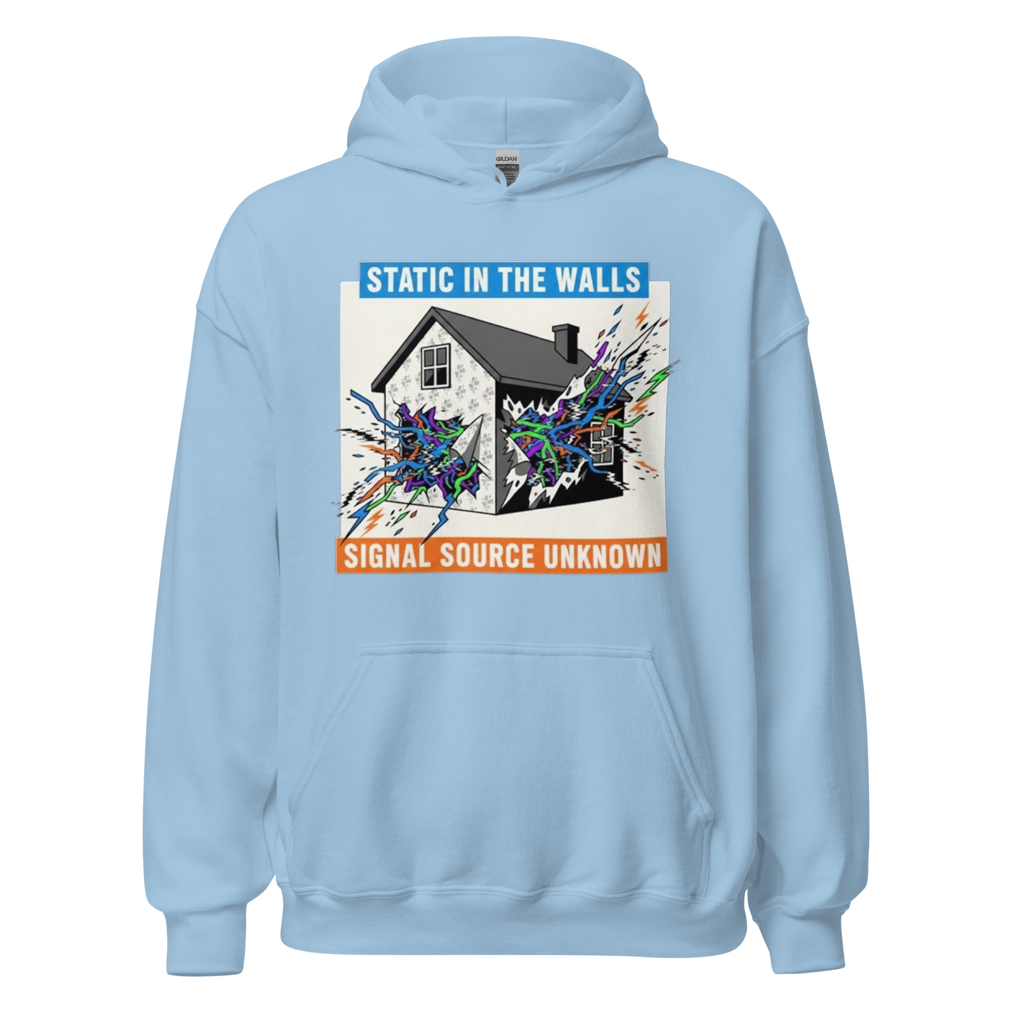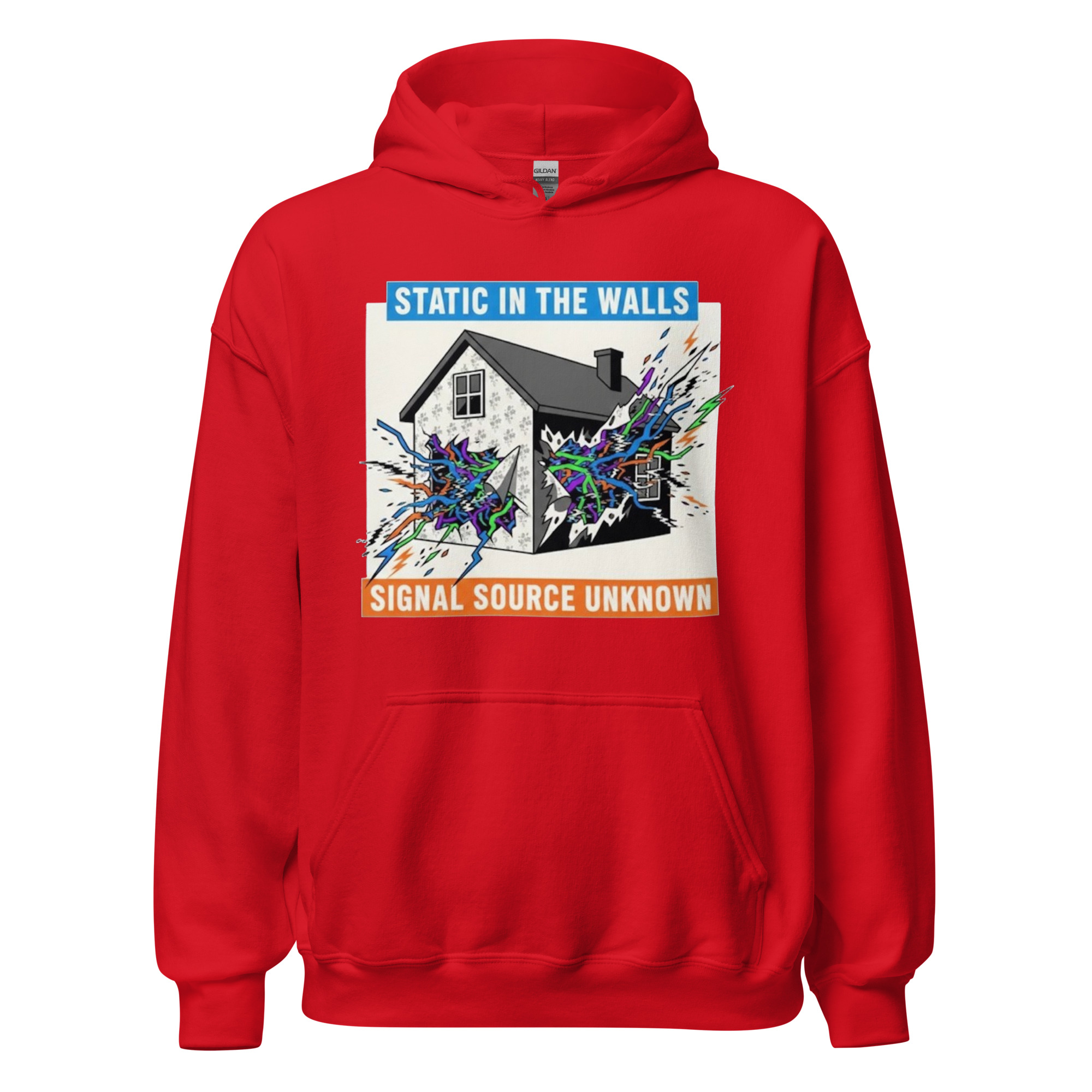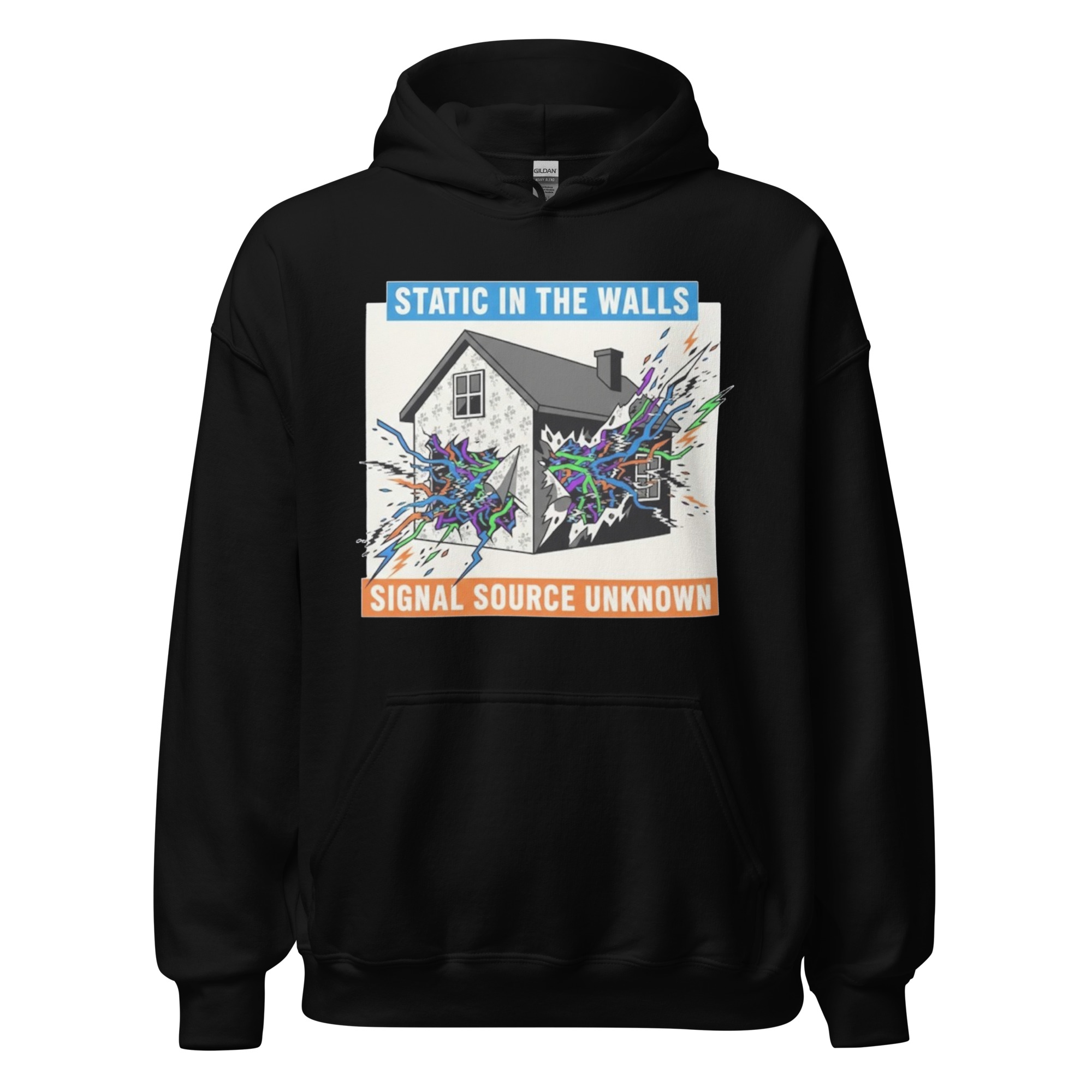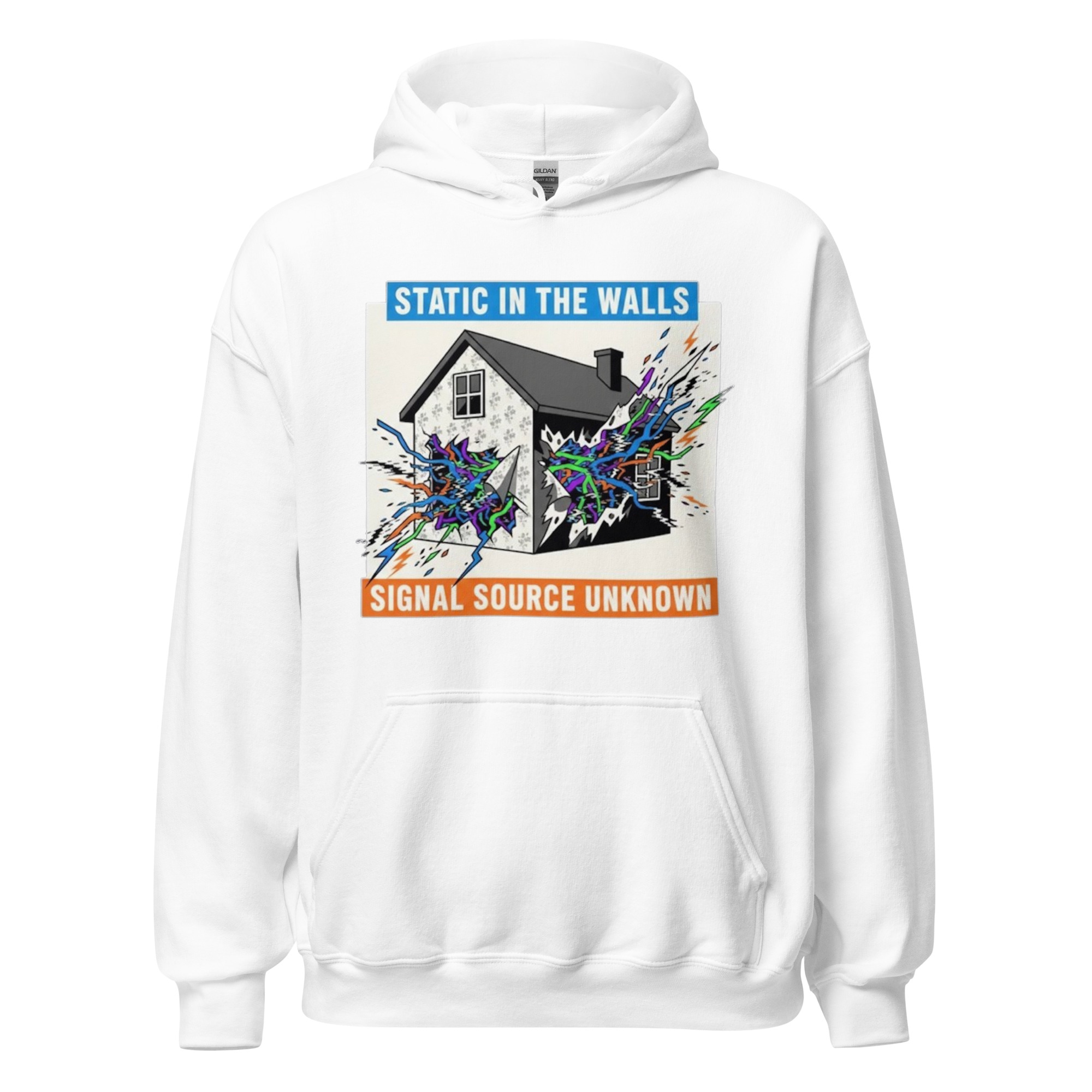 STATIC IN THE WALLS – Fan art of a suburban home cracking open to reveal eerie supernatural energy pulsing from within the walls. Everyone needs a cozy go-to hoodie to curl up in, so go for one that’s soft, smooth, and stylish. It’s the perfect choice for cooler evenings! • 50% pre-shrunk cotton, 50% polyester…