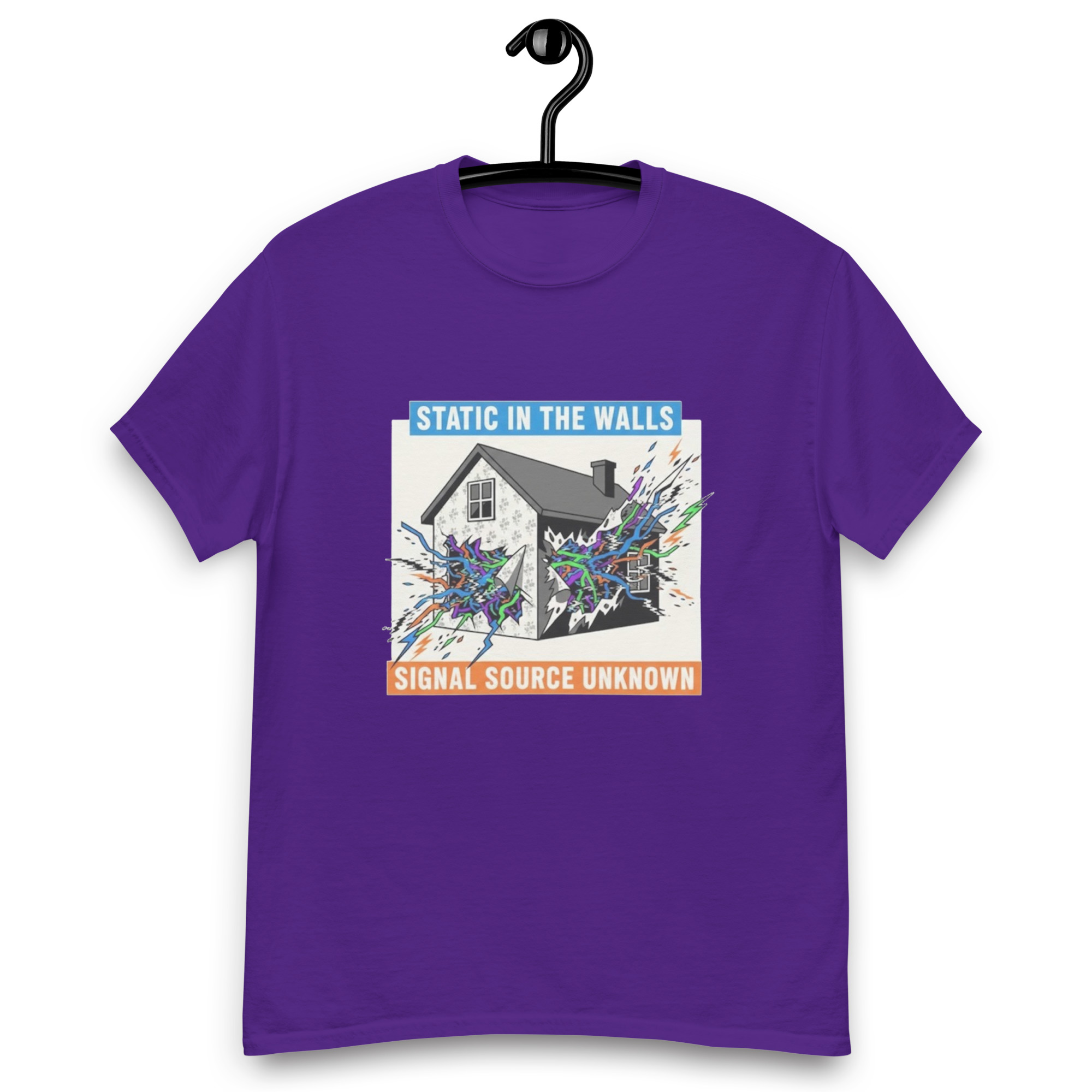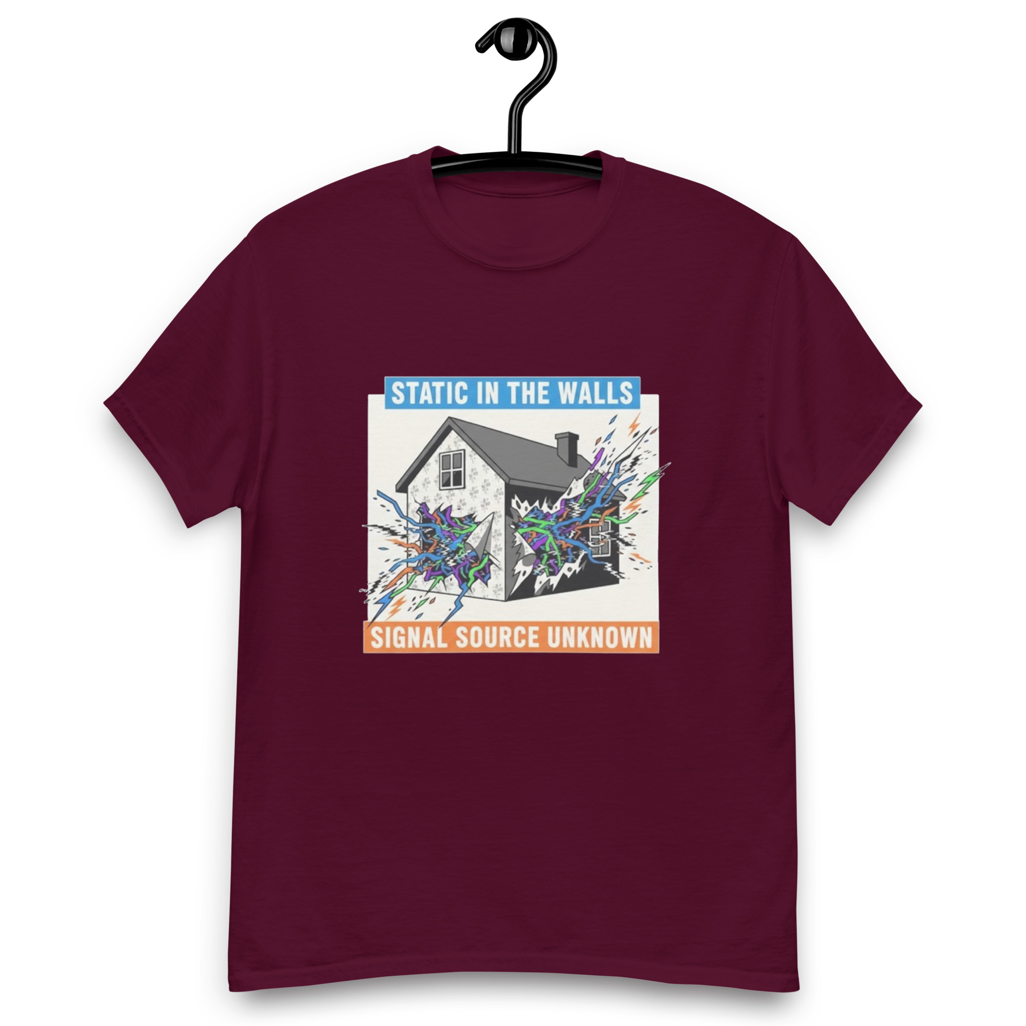 STATIC IN THE WALLS – Fan art of a suburban home cracking open to reveal eerie supernatural energy pulsing from within the walls. The 100% cotton unisex classic tee will help you land a more structured look. It sits nicely, maintains sharp lines around the edges, and goes perfectly with layered streetwear outfits. Plus, it’s…