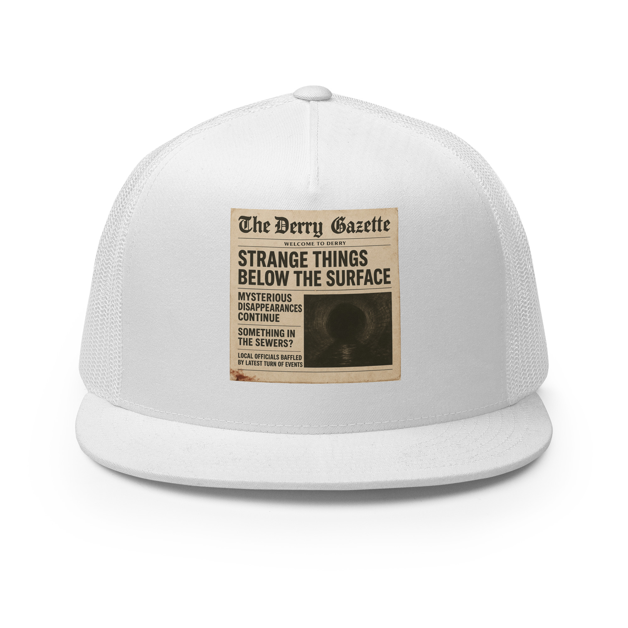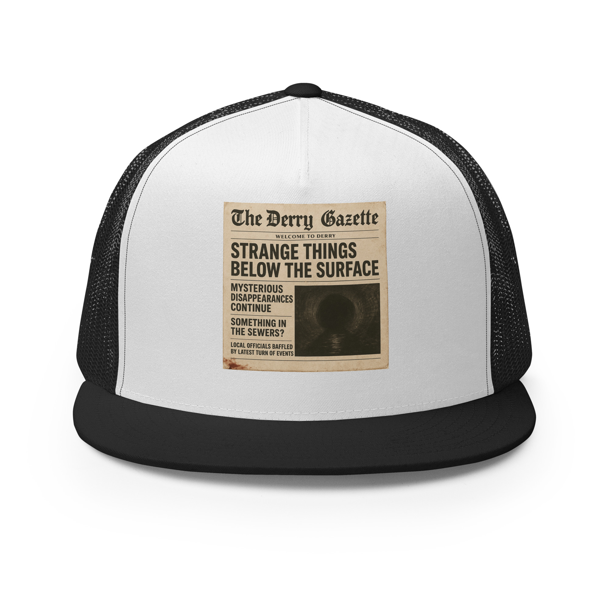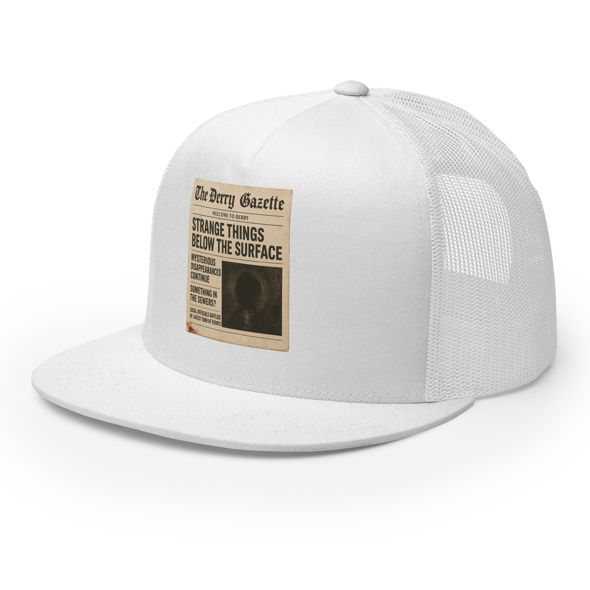 “The Derry Gazette” (Strange Things Below the Surface) – A vintage newspaper headline detailing mysterious disappearances and unsettling sightings from the quietest, scariest town in Maine. Classic trucker cap style with a cool fabric blend. • 47% cotton, 28% nylon, 25% polyester • Structured, five-panel, high profile • Flat bill • Snapback closure • Head…
