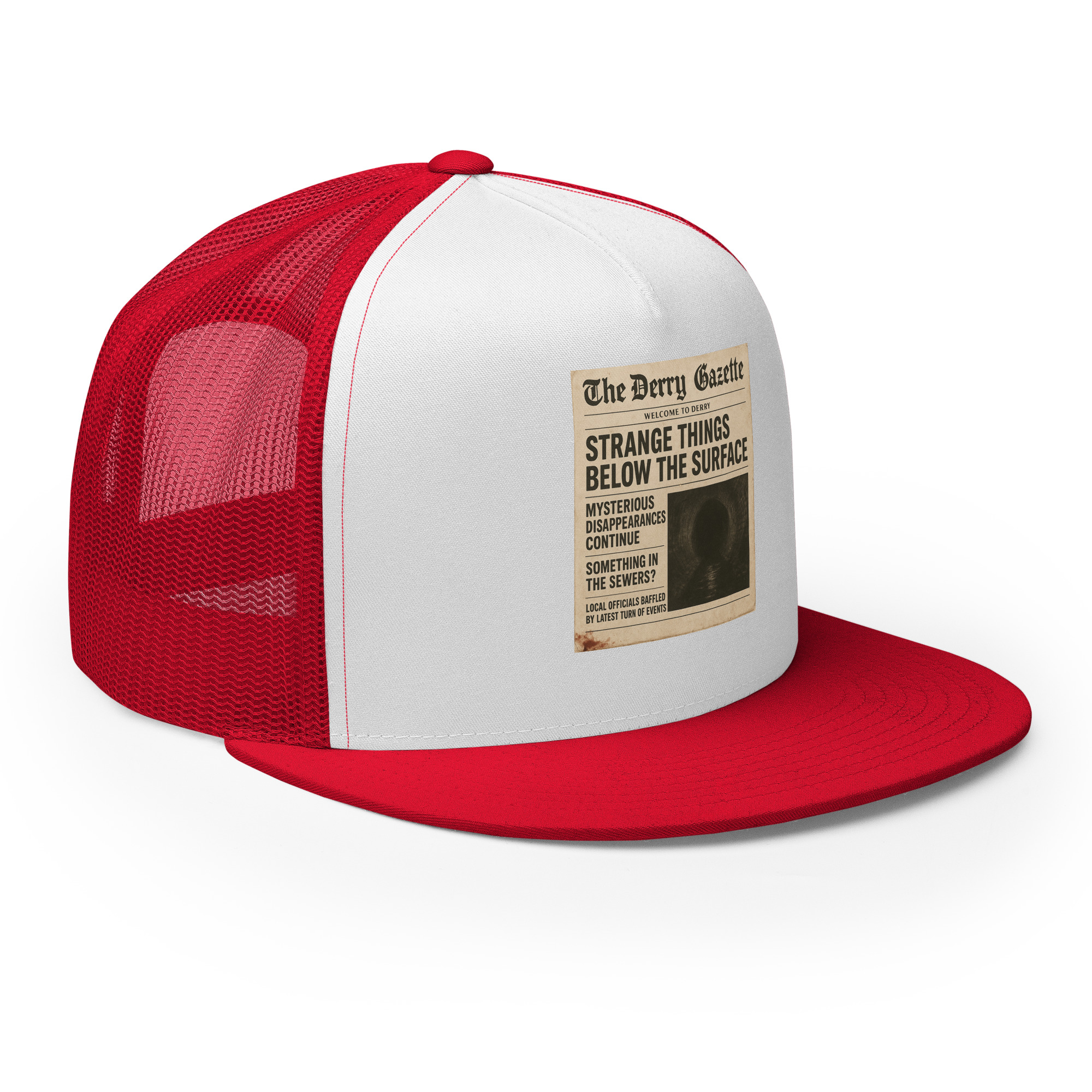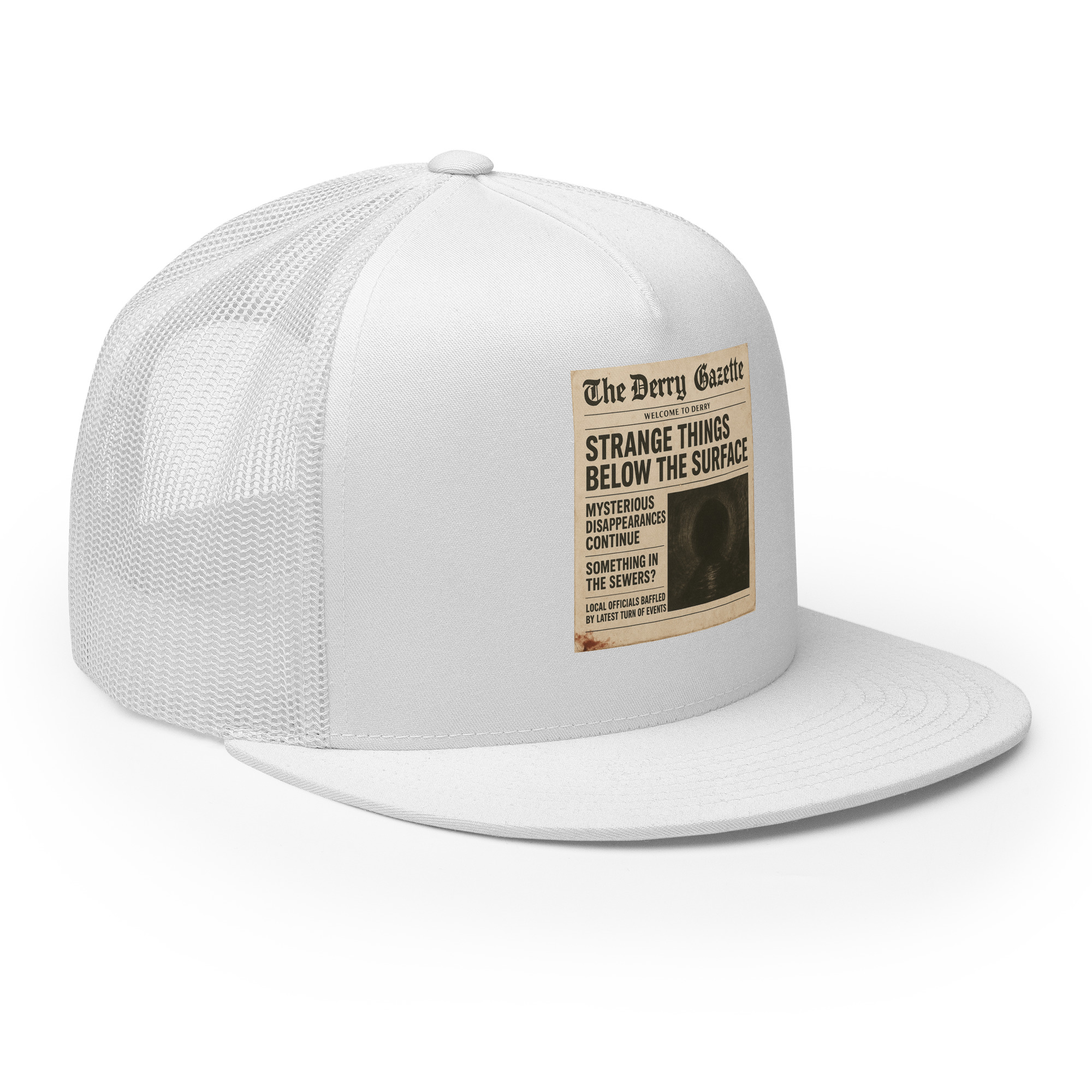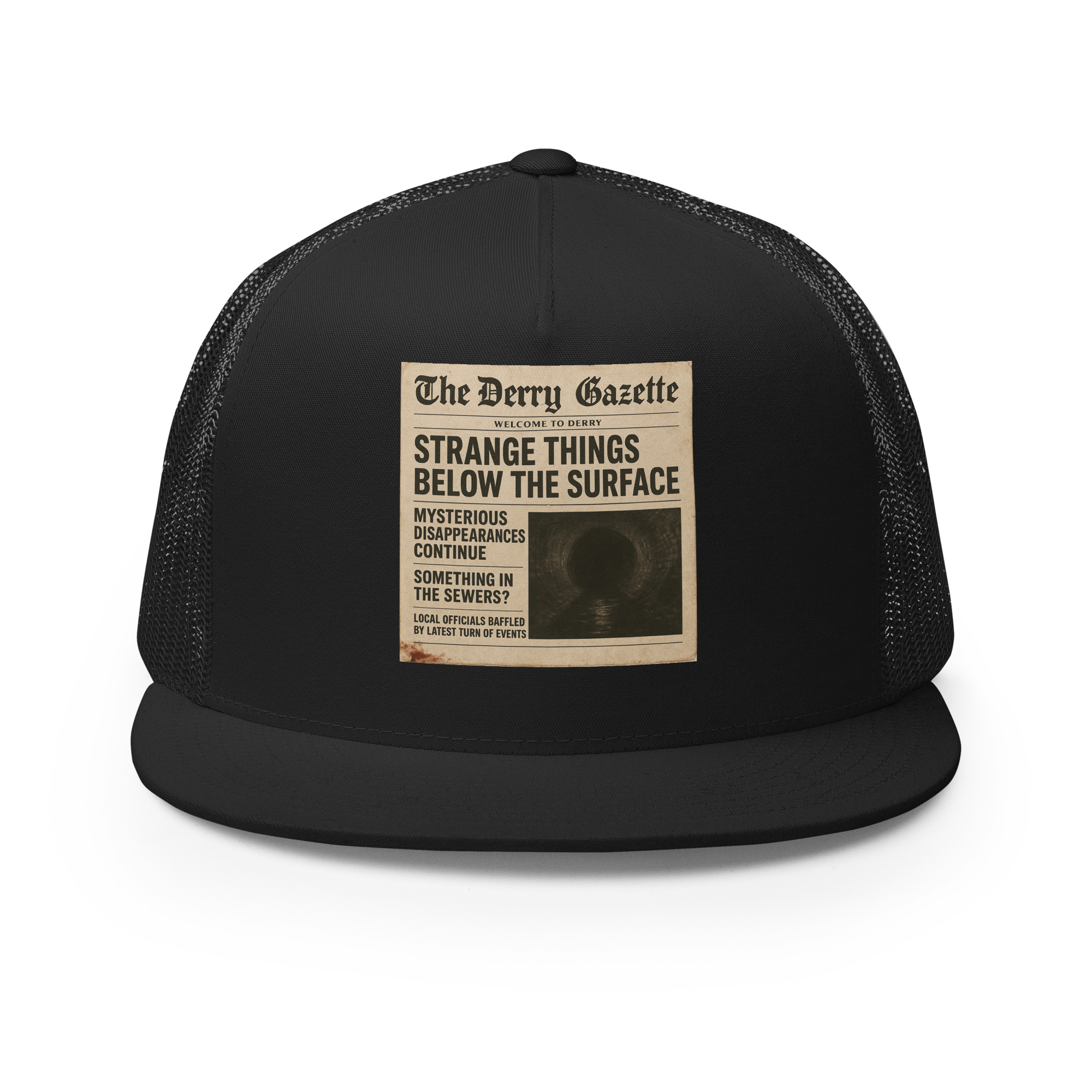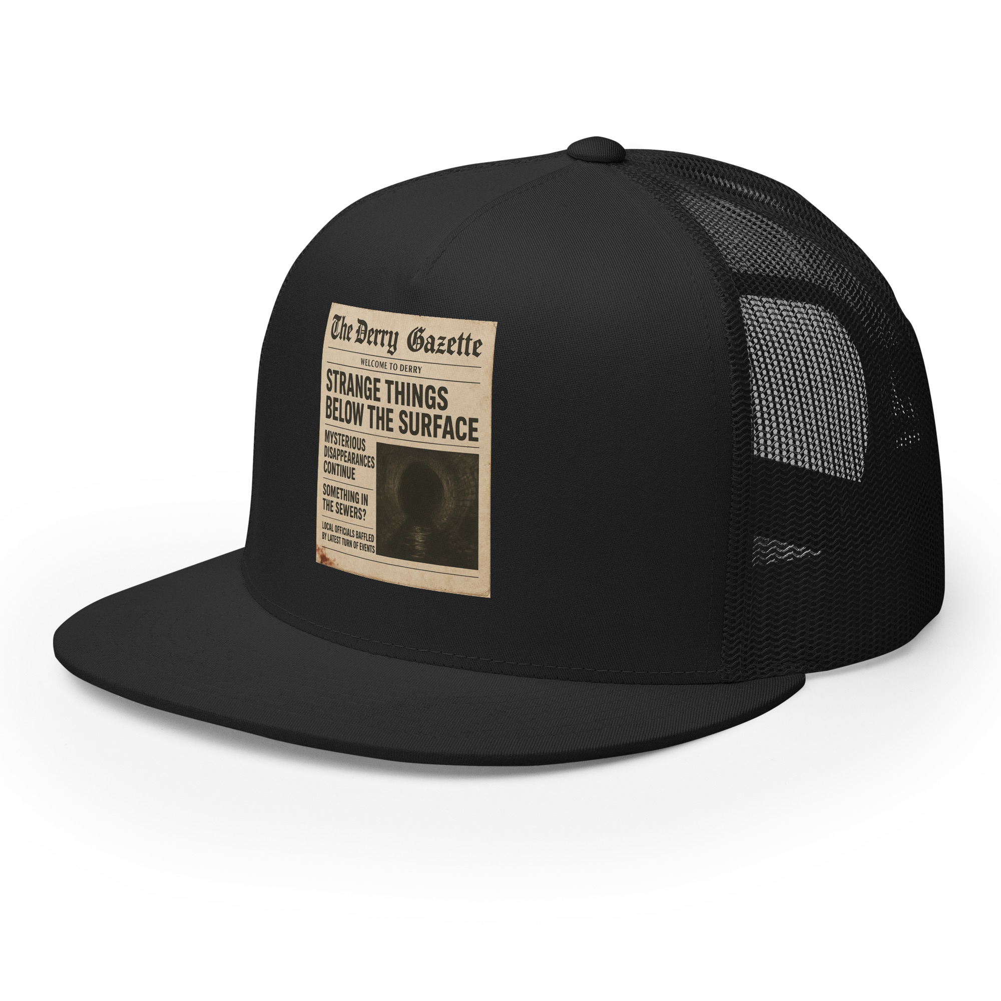 “The Derry Gazette” (Strange Things Below the Surface) – A vintage newspaper headline detailing mysterious disappearances and unsettling sightings from the quietest, scariest town in Maine. Classic trucker cap style with a cool fabric blend. • 47% cotton, 28% nylon, 25% polyester • Structured, five-panel, high profile • Flat bill • Snapback closure • Head…