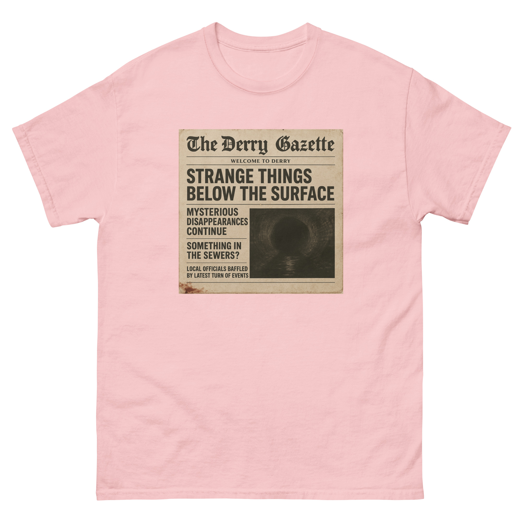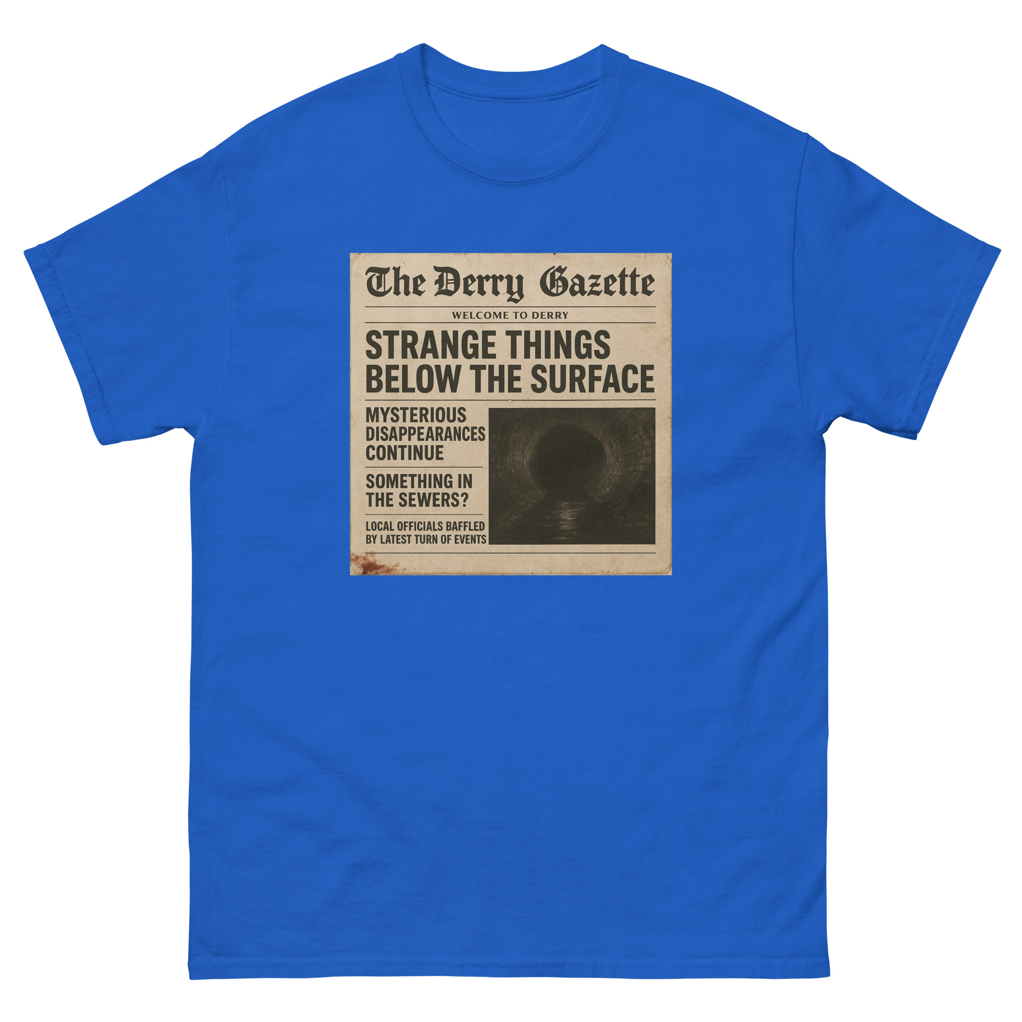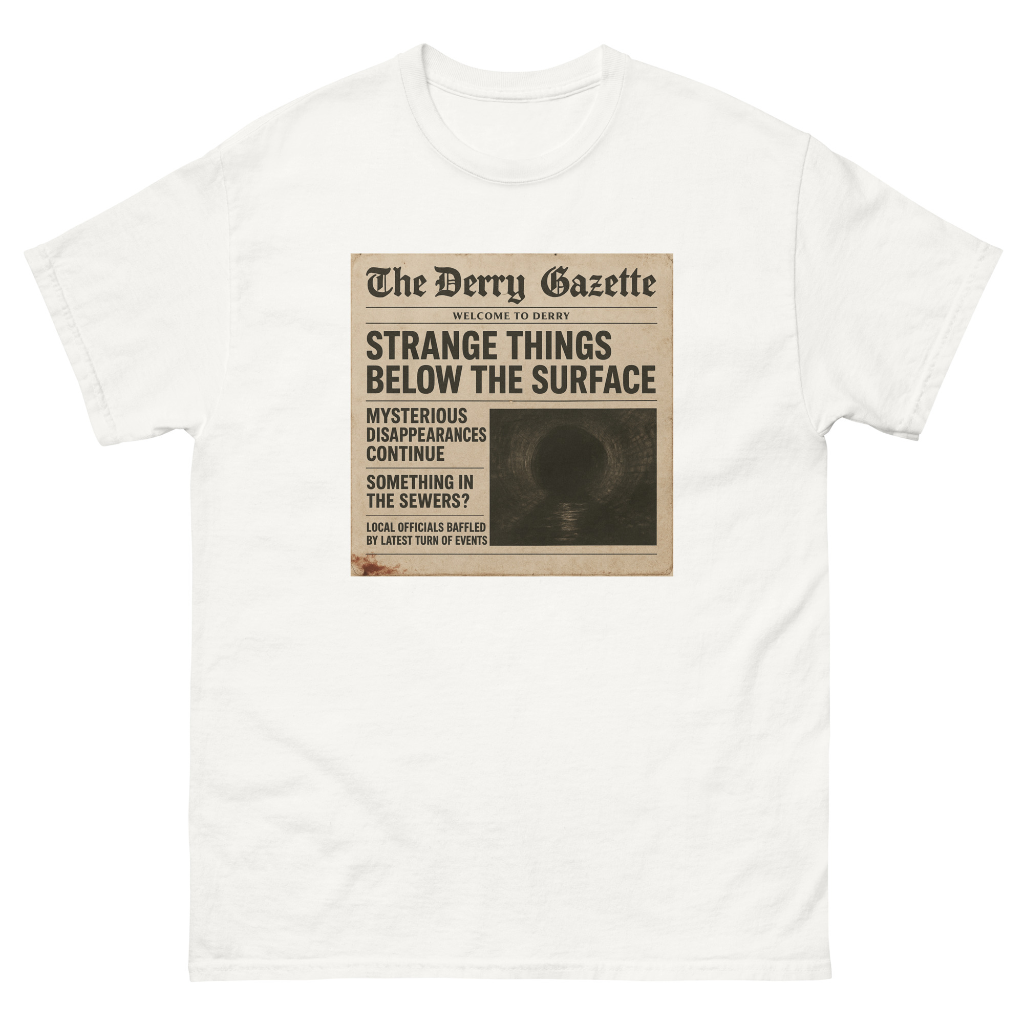 “The Derry Gazette” (Strange Things Below the Surface) – A vintage newspaper headline detailing mysterious disappearances and unsettling sightings from the quietest, scariest town in Maine. The 100% cotton unisex classic tee will help you land a more structured look. It sits nicely, maintains sharp lines around the edges, and goes perfectly with layered streetwear…