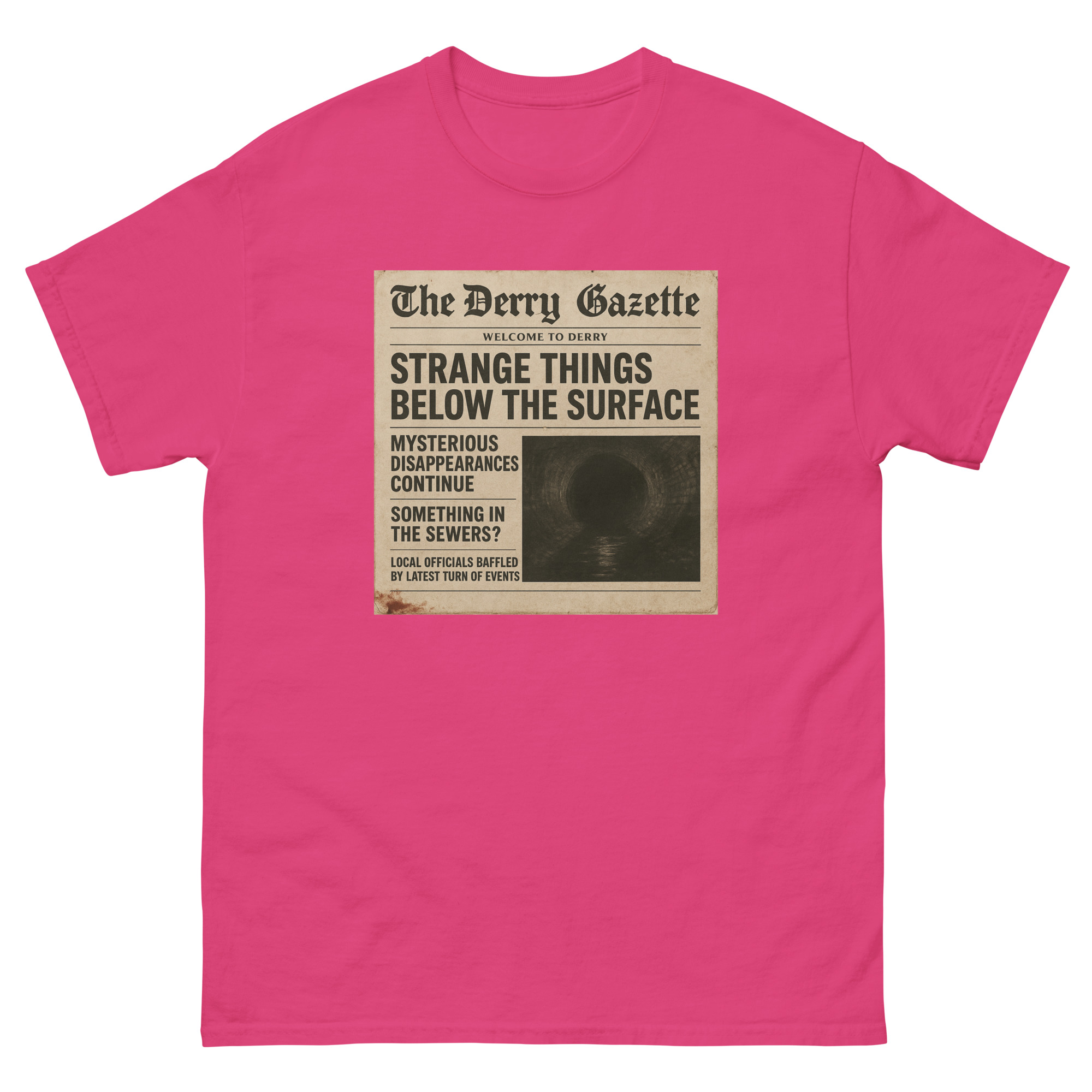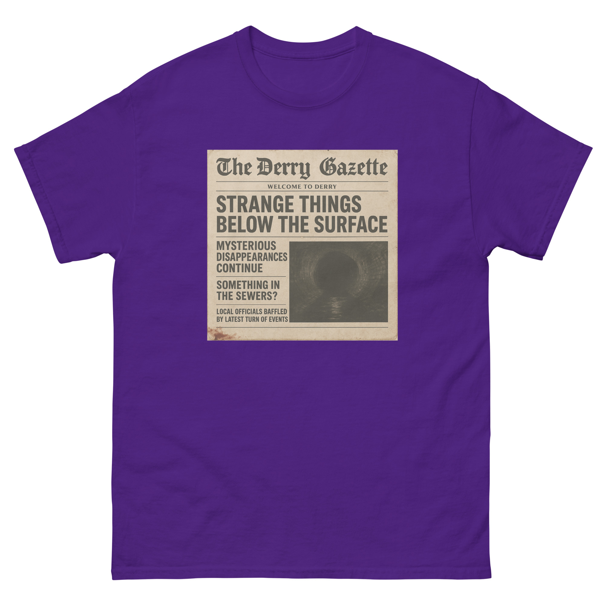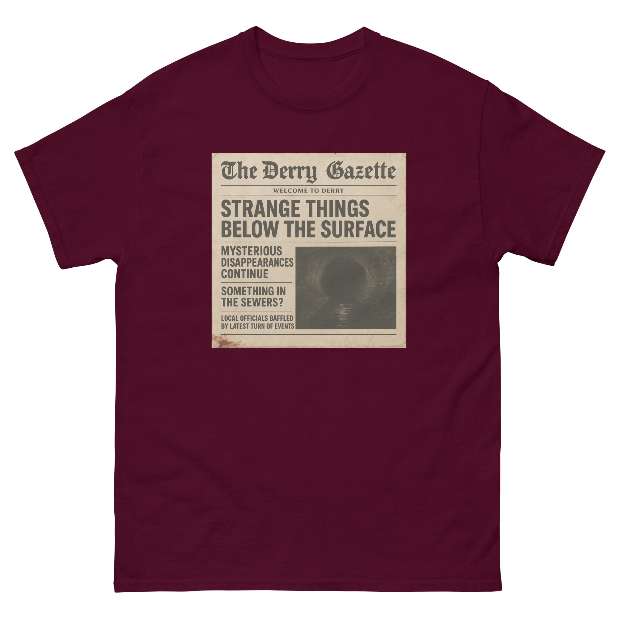 “The Derry Gazette” (Strange Things Below the Surface) – A vintage newspaper headline detailing mysterious disappearances and unsettling sightings from the quietest, scariest town in Maine. The 100% cotton unisex classic tee will help you land a more structured look. It sits nicely, maintains sharp lines around the edges, and goes perfectly with layered streetwear…