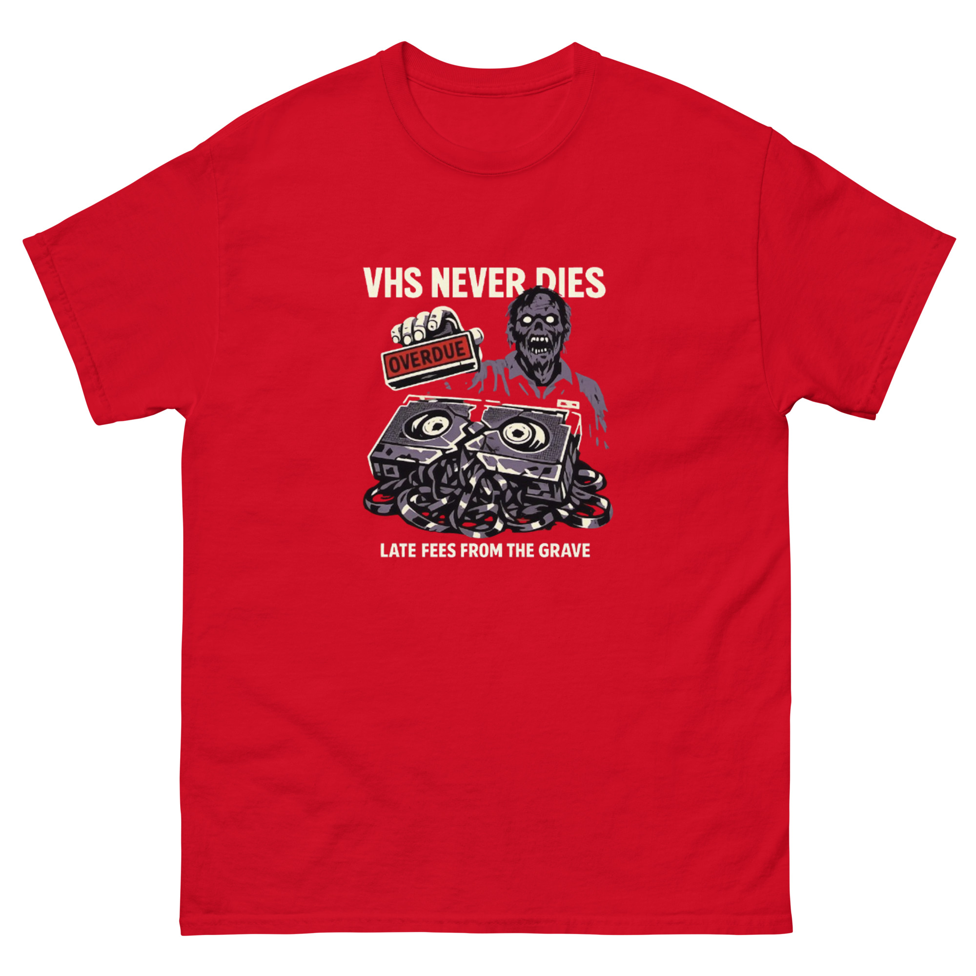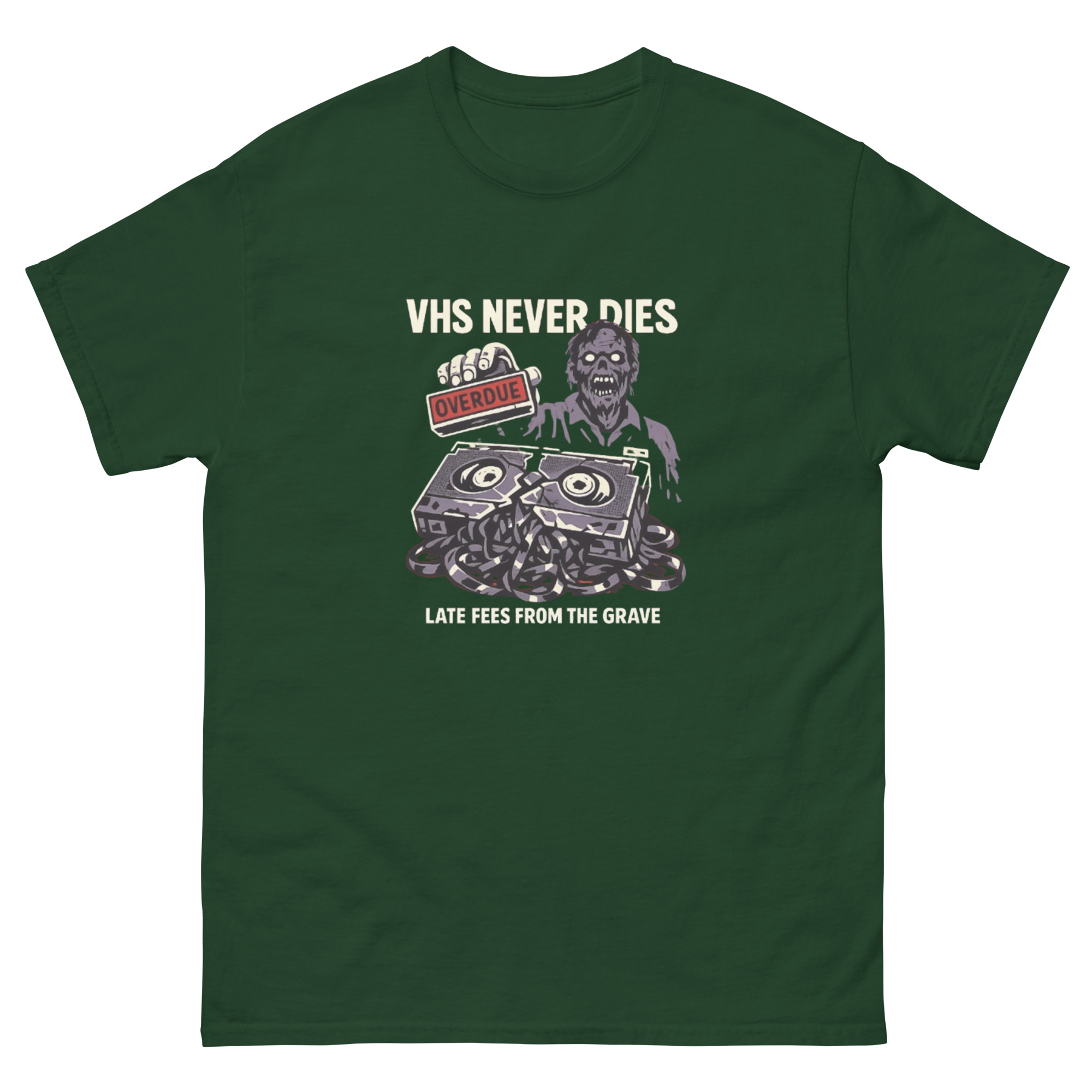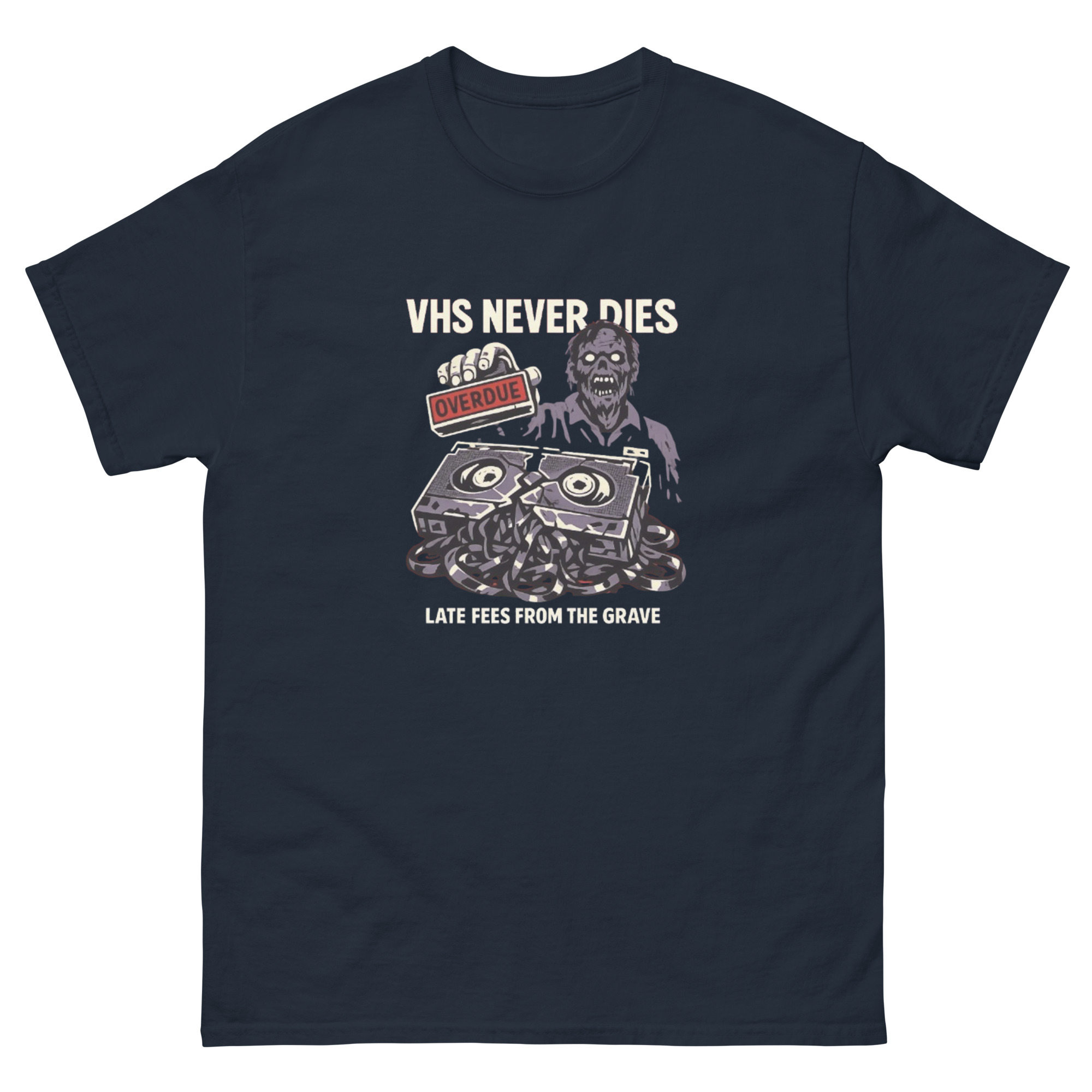 VHS NEVER DIES: Late Fees From the Grave – A cracked VHS cassette spills tangled tape while an undead rental clerk looms behind it, stamping OVERDUE like a death sentence in a dead video store.