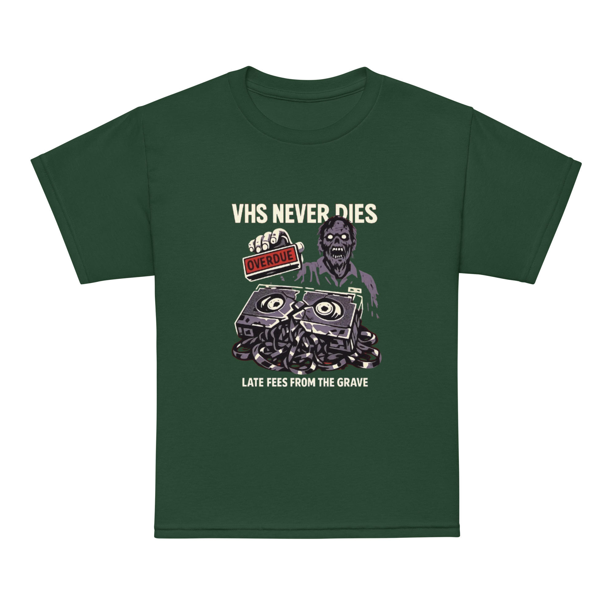 VHS NEVER DIES: Late Fees From the Grave – A cracked VHS cassette spills tangled tape while an undead rental clerk looms behind it, stamping OVERDUE like a death sentence in a dead video store.